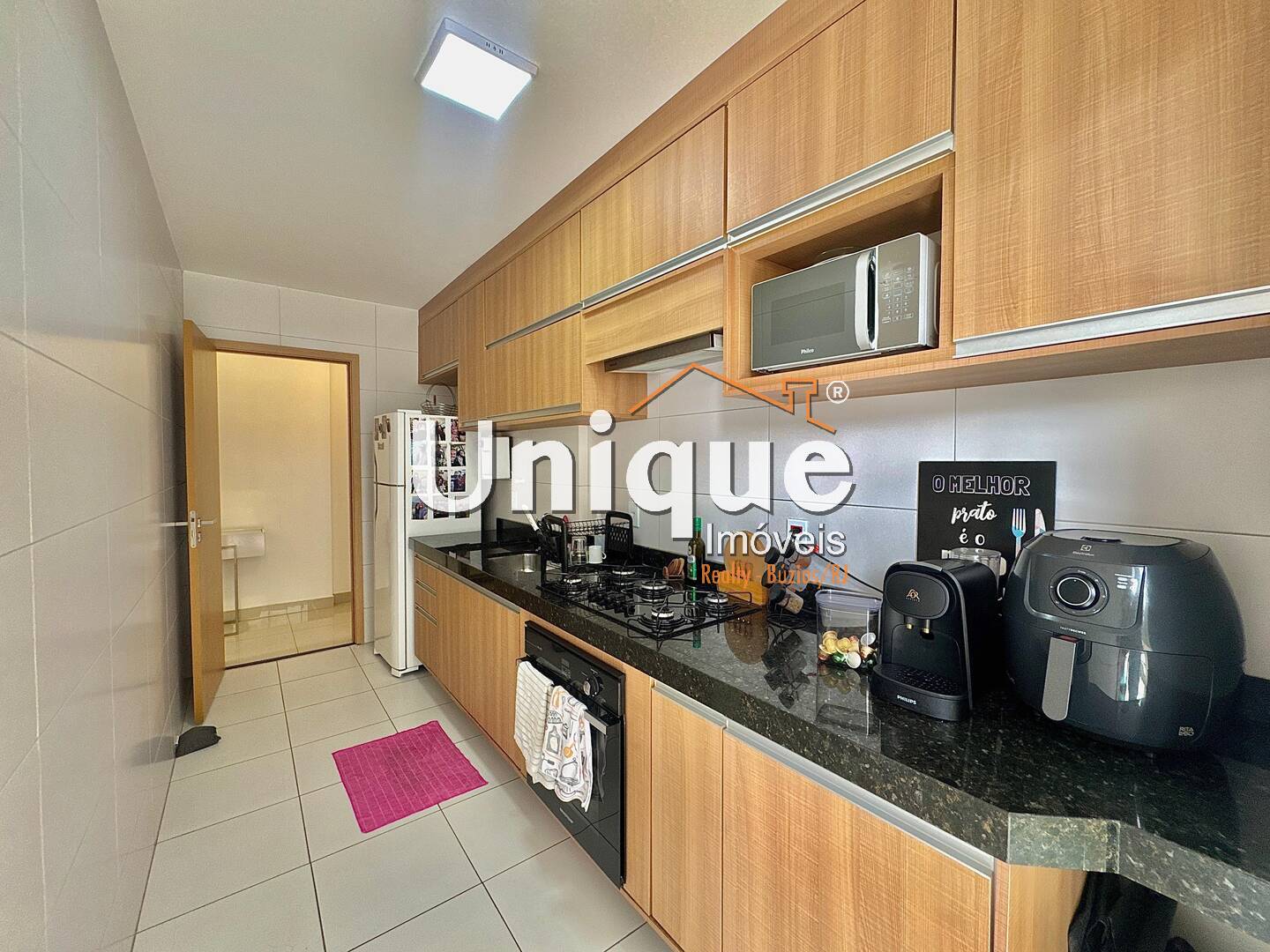 Composto por uma suíte com armários planejados, sala bem aconchegante com extensão até a varanda, cozinha toda planejada equipada com cooktop e forno elétrico, área de serviço e uma vaga de garagem coberta e demarcada.