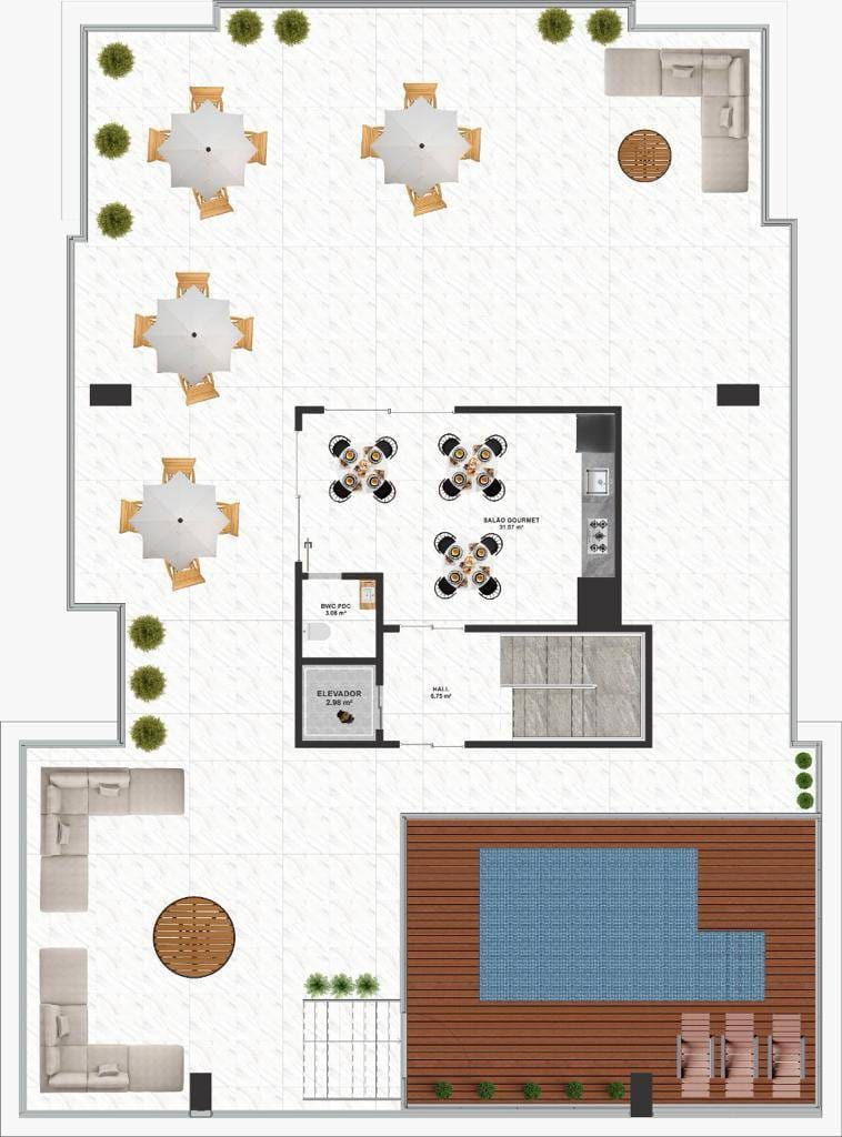 Área de lazer ao ar livre com bancos circulares