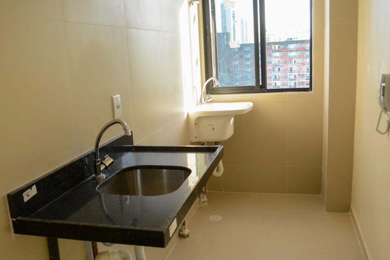 Apartamento: sala de estar/jantar, 02 quartos (1 suíte), WC Social, área de serviço.