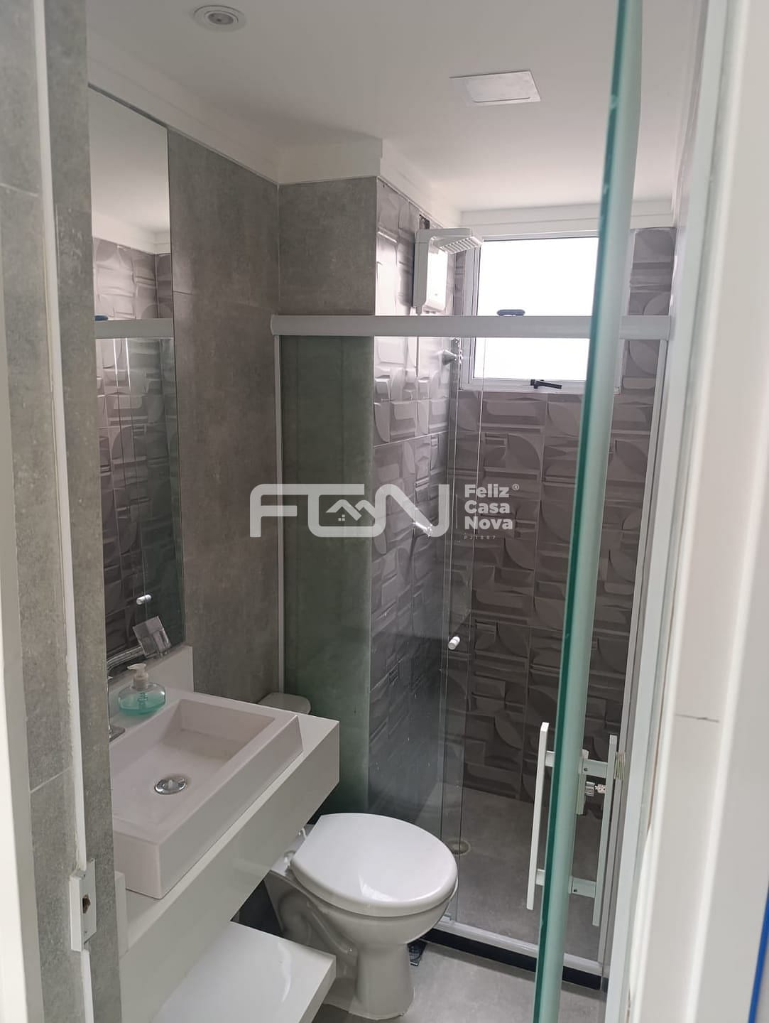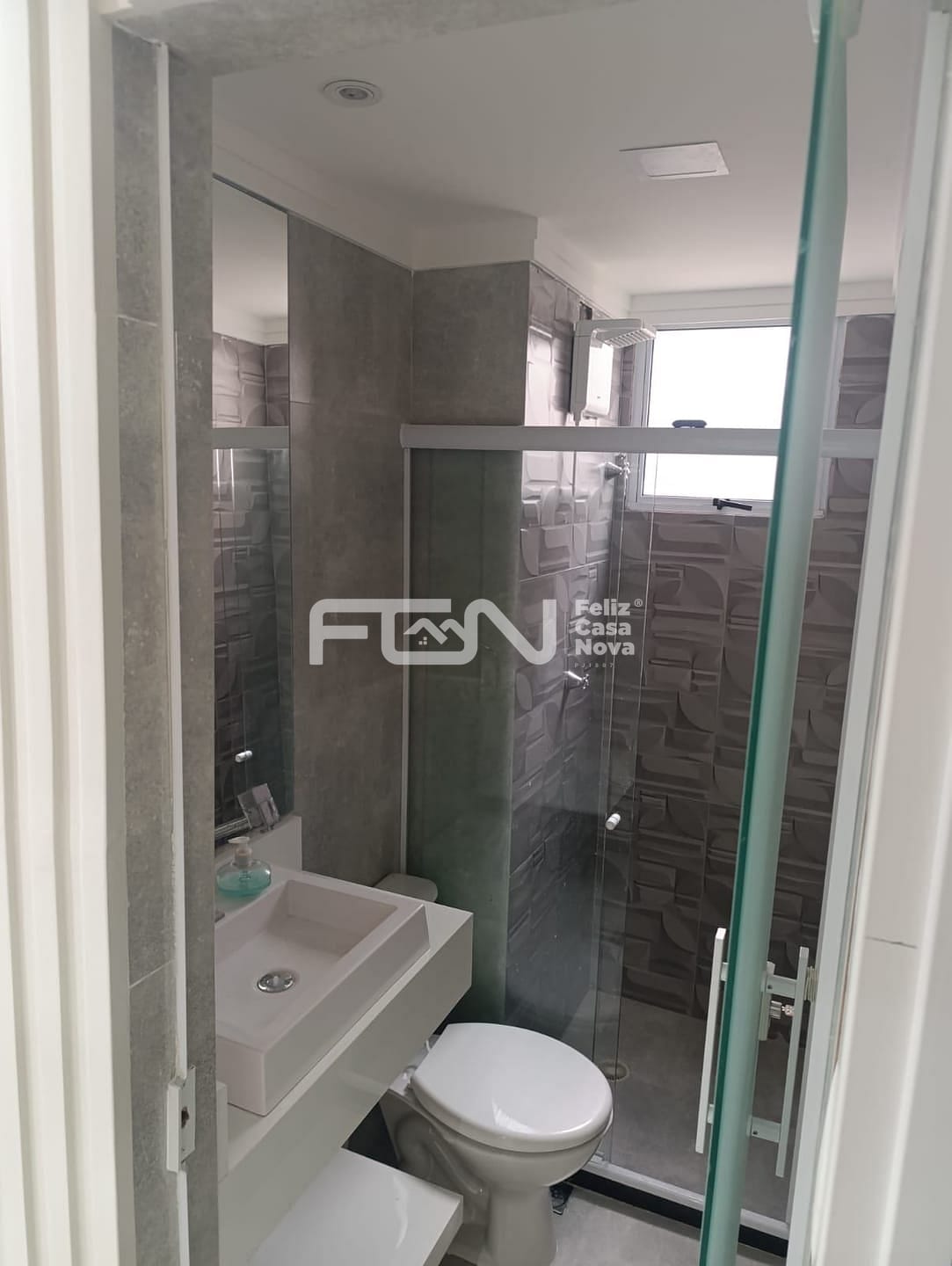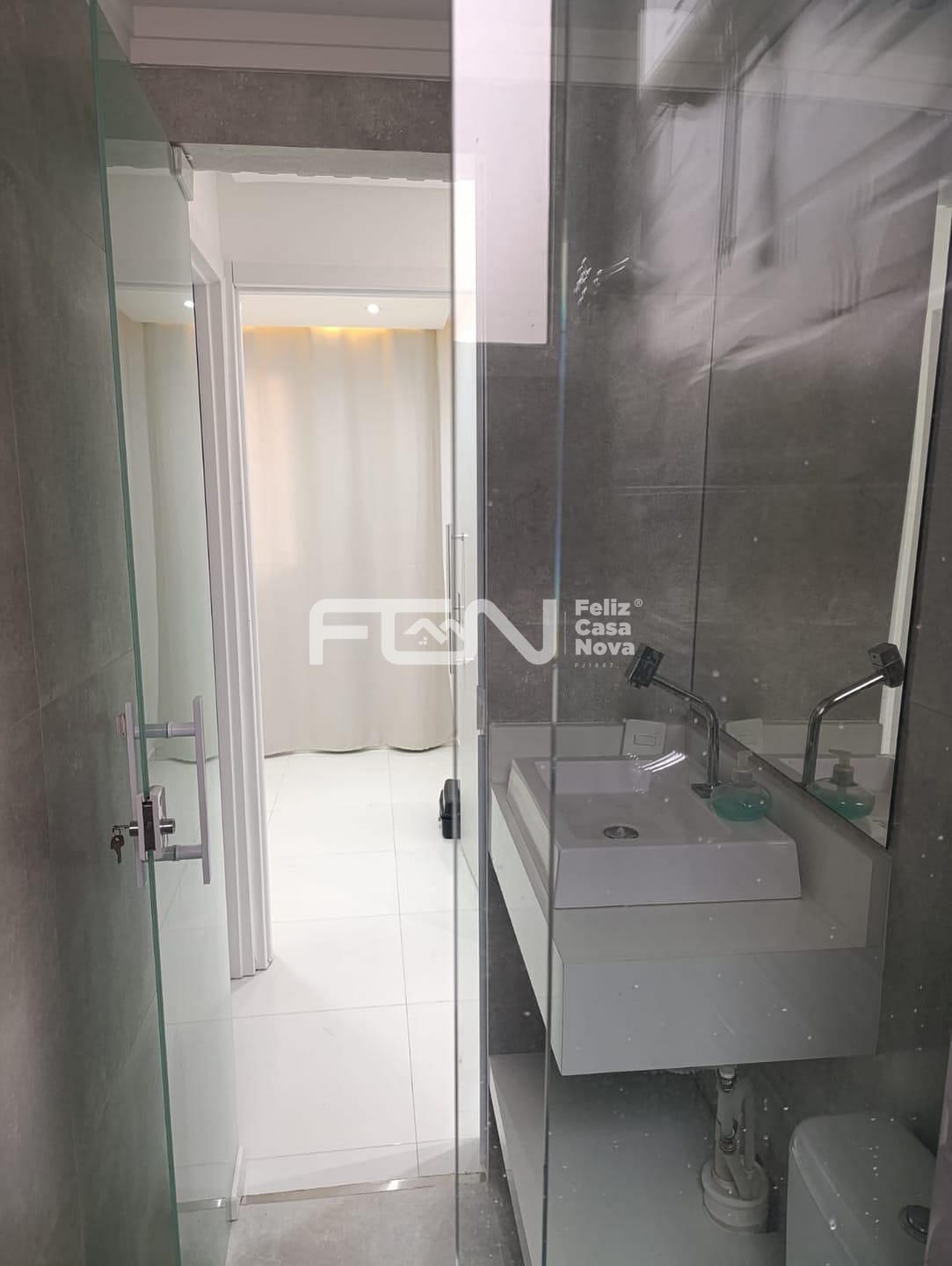 Banheiro com porta de vidro e Pia esculpida na pedra e Blindex