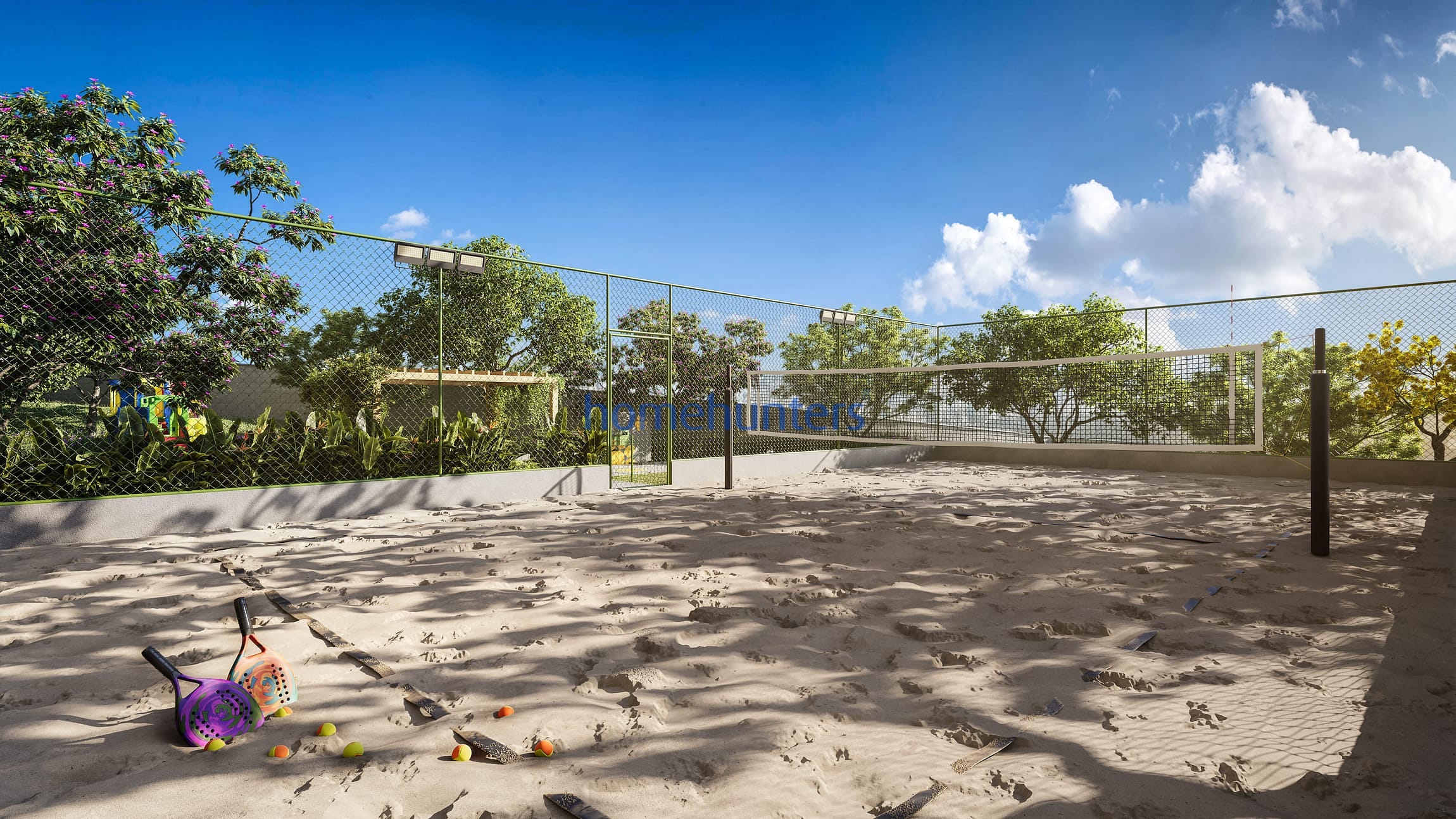 Esporte e Saúde: quadra de areia, bicicletário e academia ao ar livre.