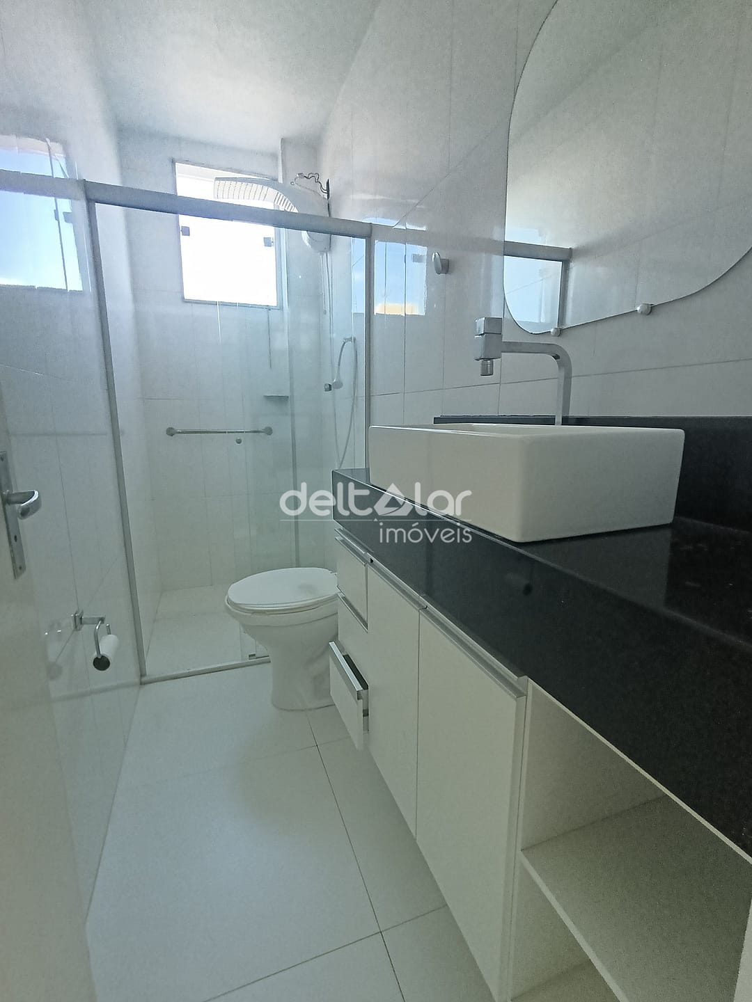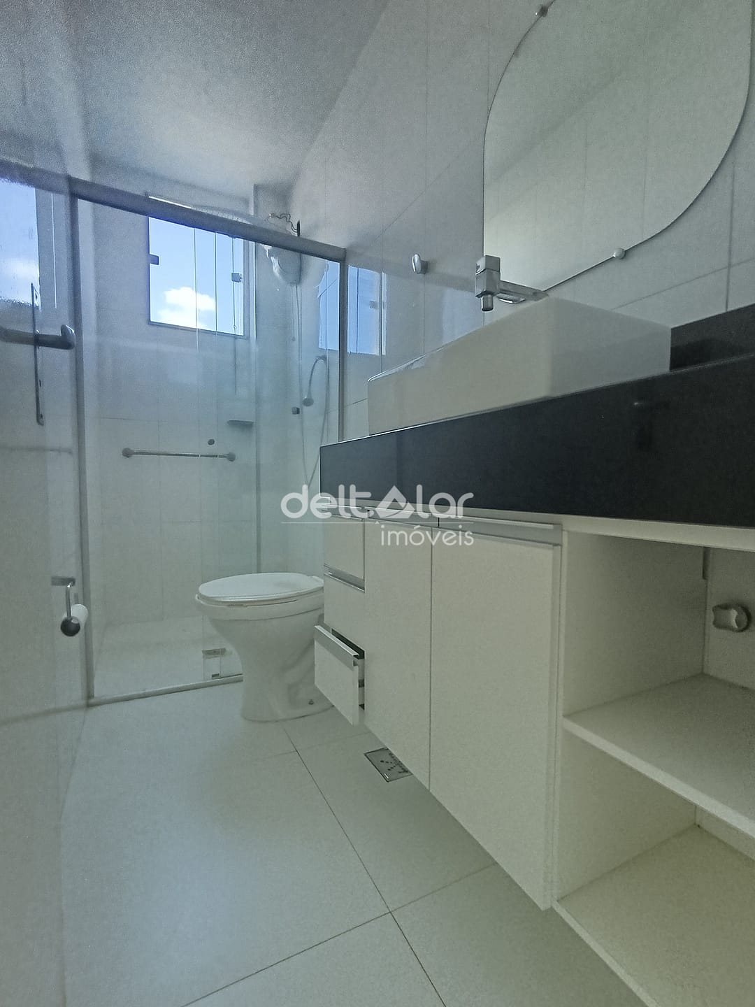 1 banheiro social com box blindex, completo e bem localizado entre os cômodos.