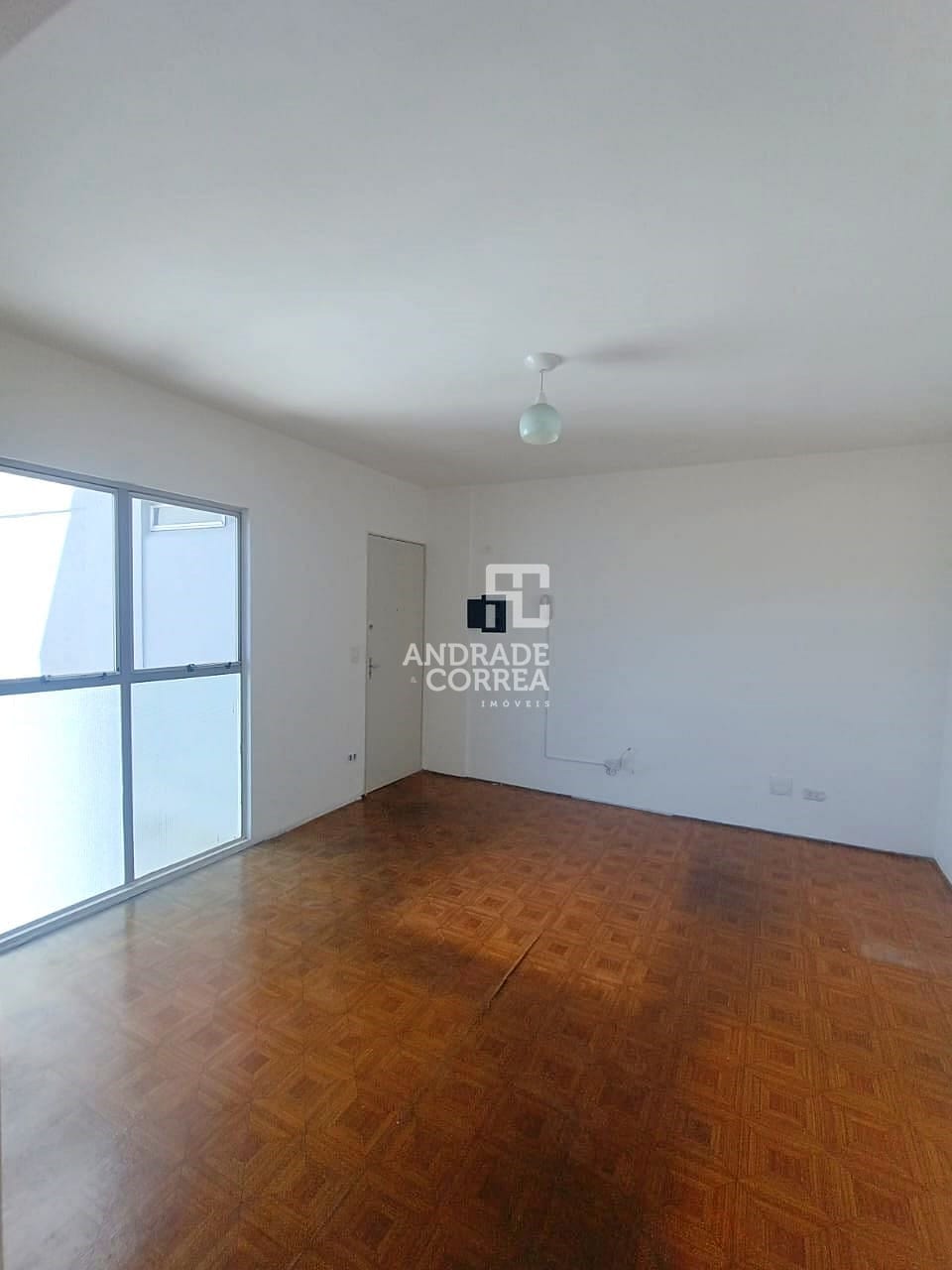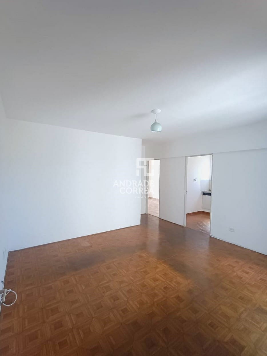 Sala de estar ampla, cozinha, área de serviço, um banheiro, dois dormitórios e uma vaga de garagem.