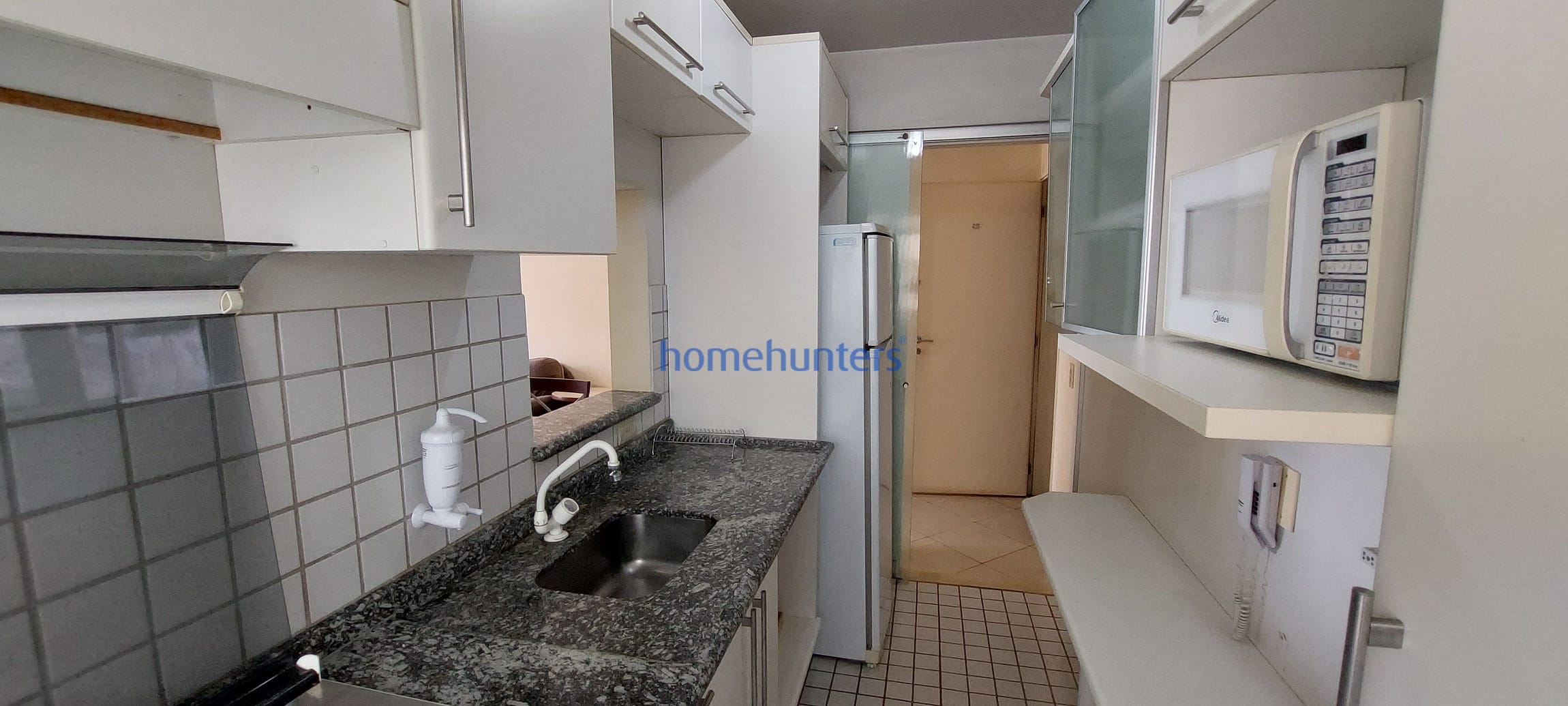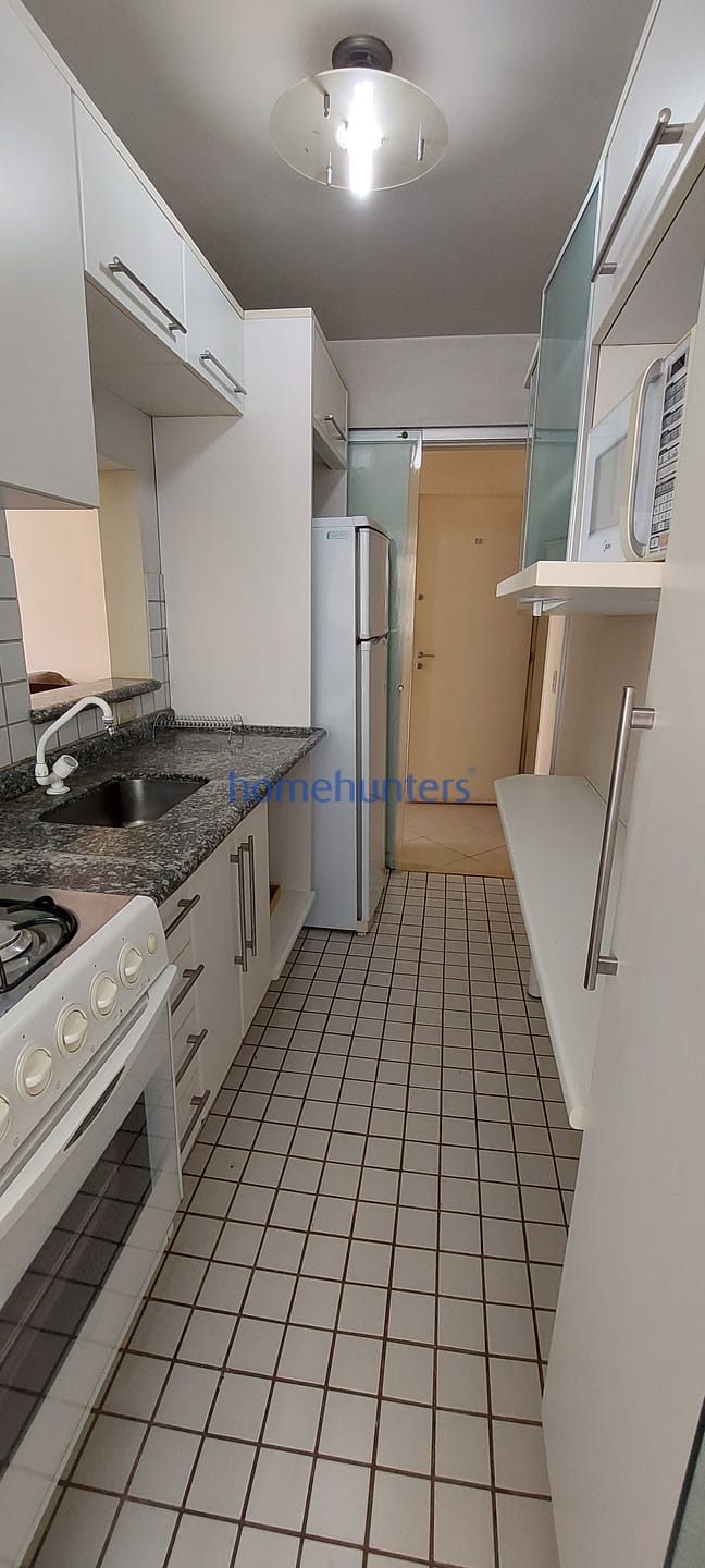 A unidade conta com uma cozinha bem equipada, com armários, além de uma área de serviço com lavanderia. A sala ampla e arejada se integra à sacada, trazendo luminosidade e ventilação natural ao ambiente. O prédio, com andar alto, oferece uma vista privilegiada do entorno.