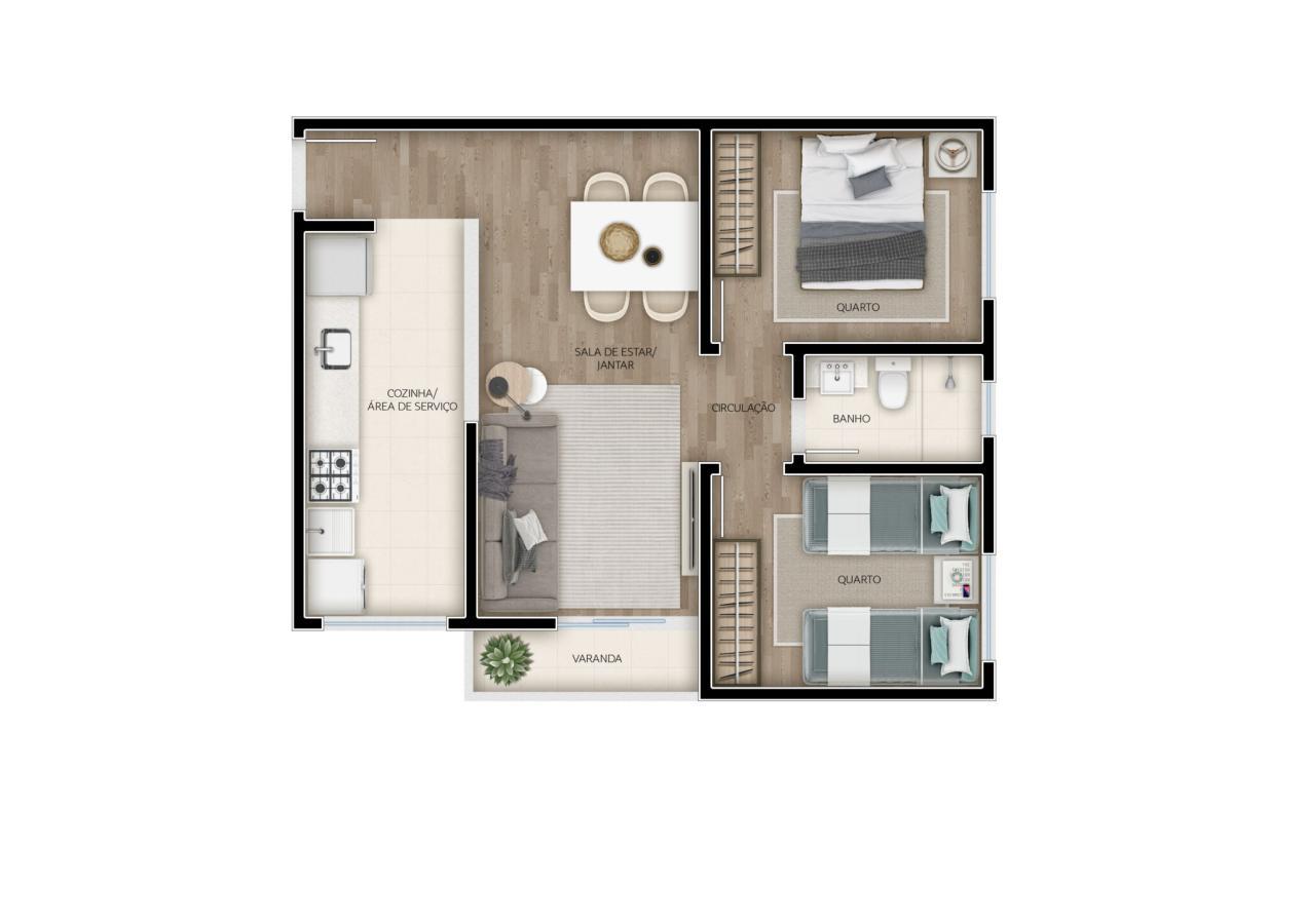 O maior apartamento de 02 quartos com varanda;