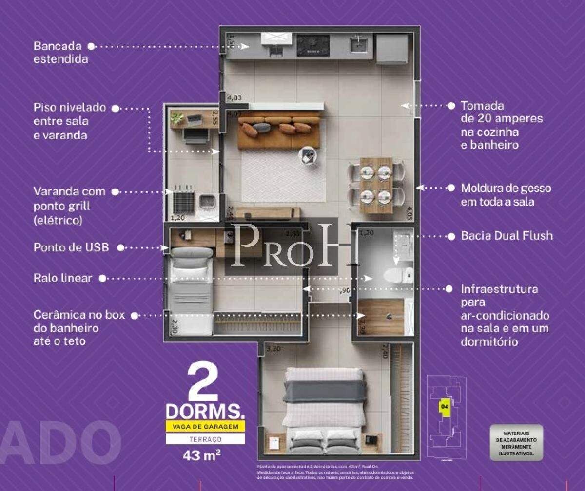 Com 43m² de área útil, este apartamento oferece 2 quartos e 1 banheiro. O imóvel não possui armários planejados, permitindo que você personalize os ambientes ao seu gosto. A parte social conta com um agradável terraço, ideal para desfrutar de momentos de lazer. Para sua comodidade, há 1 vaga de garagem coberta.