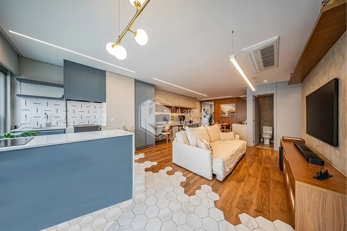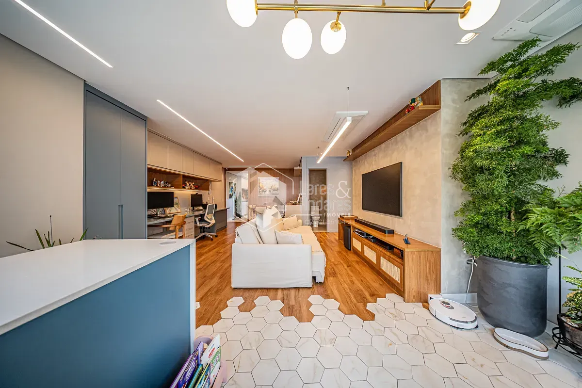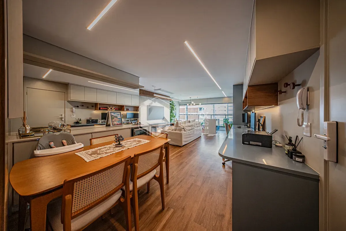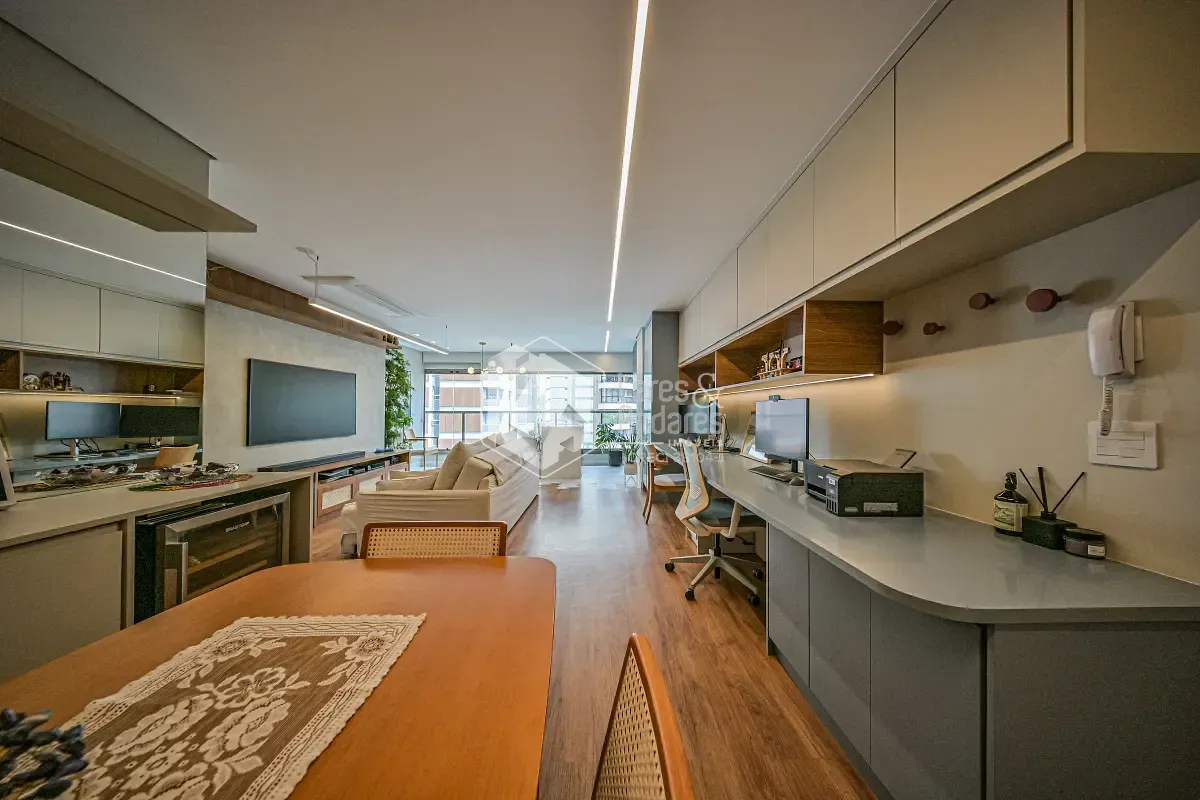 Apartamento com projeto arquitetônico personalizado, onde cada detalhe foi pensado para criar uma experiência única de morar. Um dos grandes destaques está na integração entre a sala e a varanda: o piso faz uma elegante fusão entre o revestimento frio e a madeira, criando um efeito visual que lembra as águas do mar encontrando a areia, um detalhe sofisticado que valoriza ainda mais o ambiente.