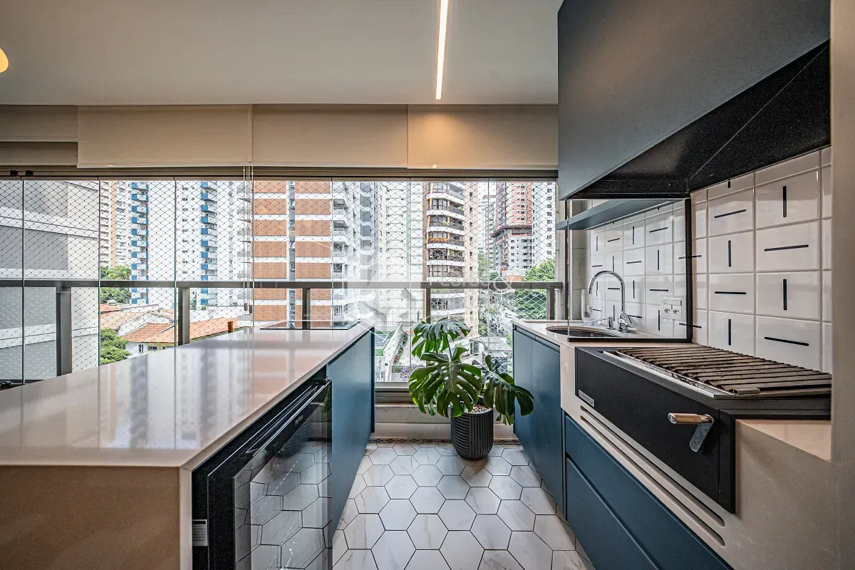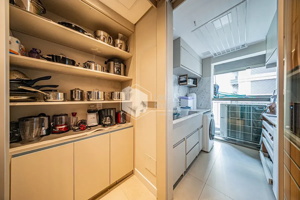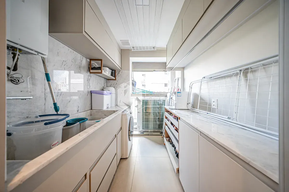 A cozinha é iluminada e funcional, com janela sobre a pia e armários planejados de muito bom gosto. A lavanderia segue o mesmo conceito de projeto, mantendo a harmonia estética e a eficiência dos espaços.