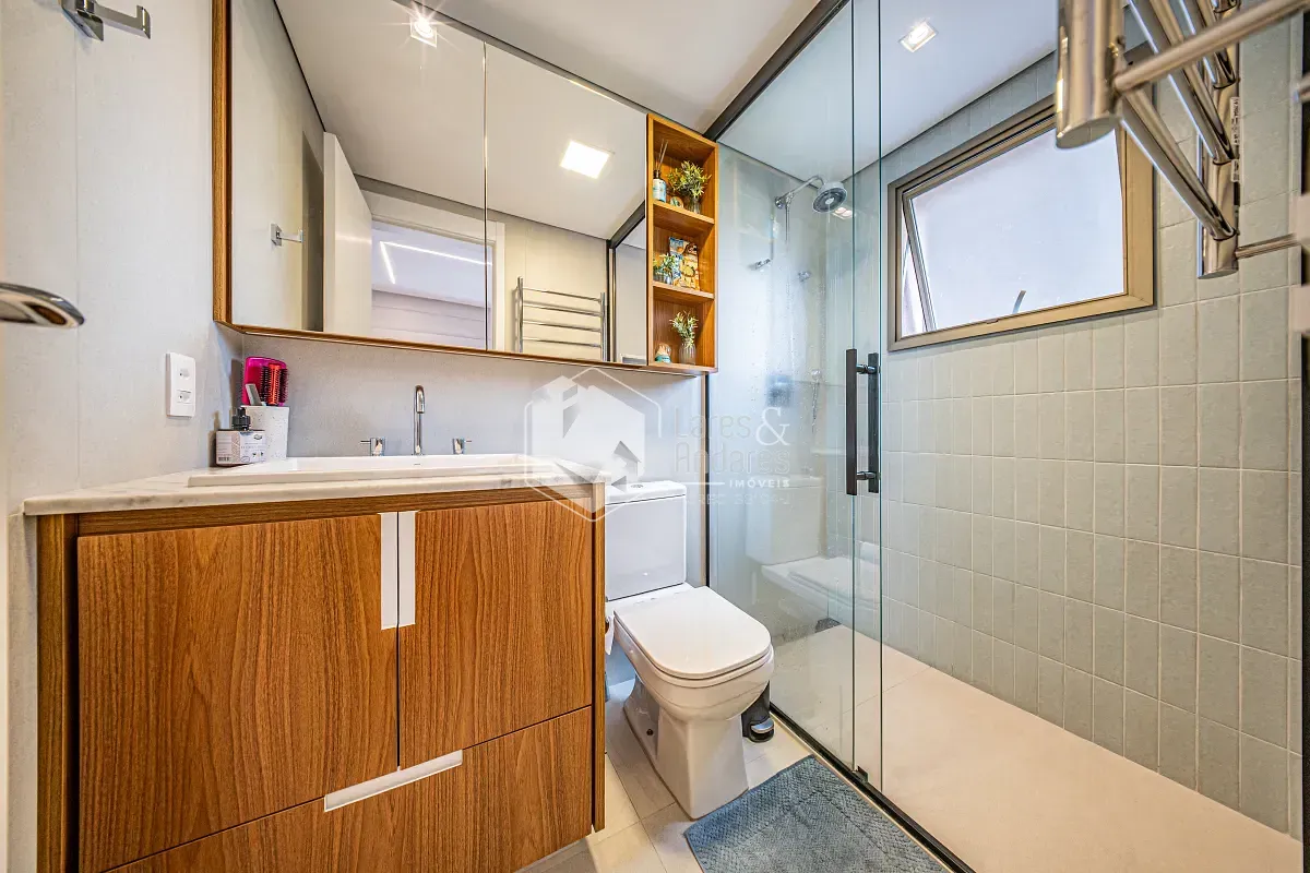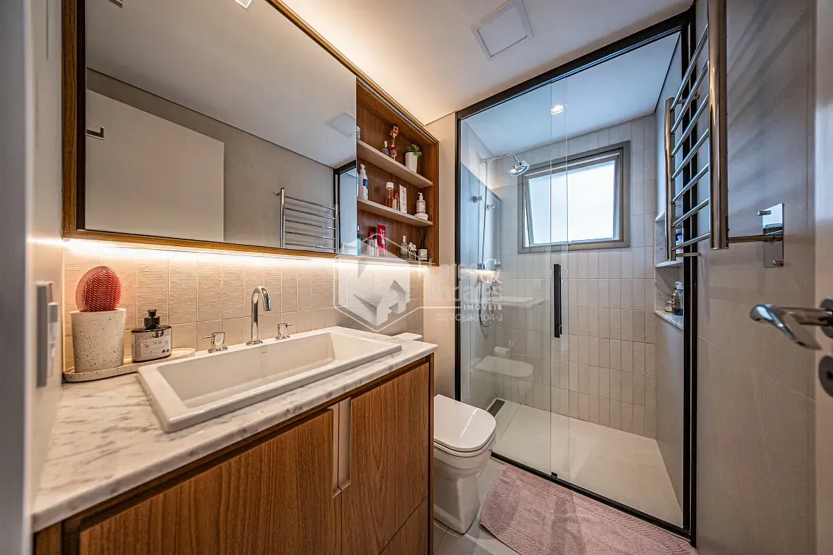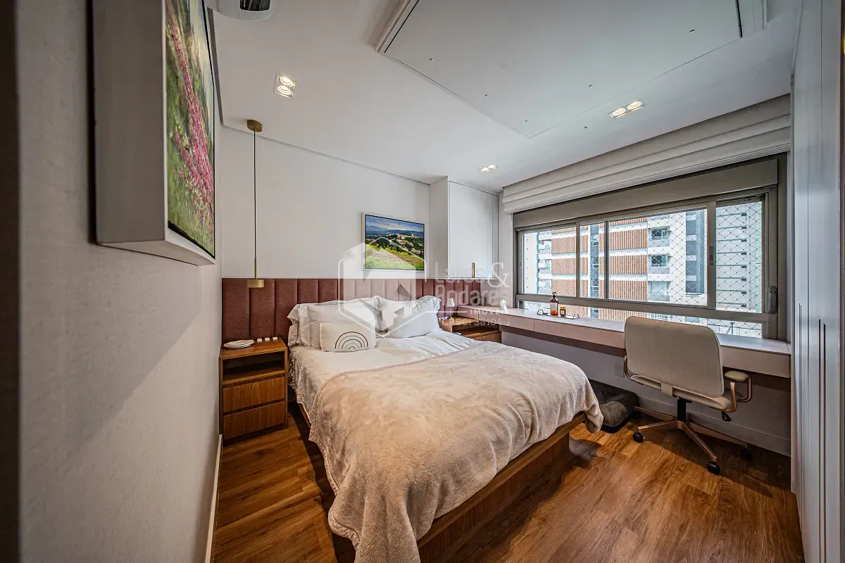 O apartamento conta com 2 suítes, sendo que uma delas foi ampliada para acomodar um armário mais espaçoso, trazendo ainda mais praticidade.