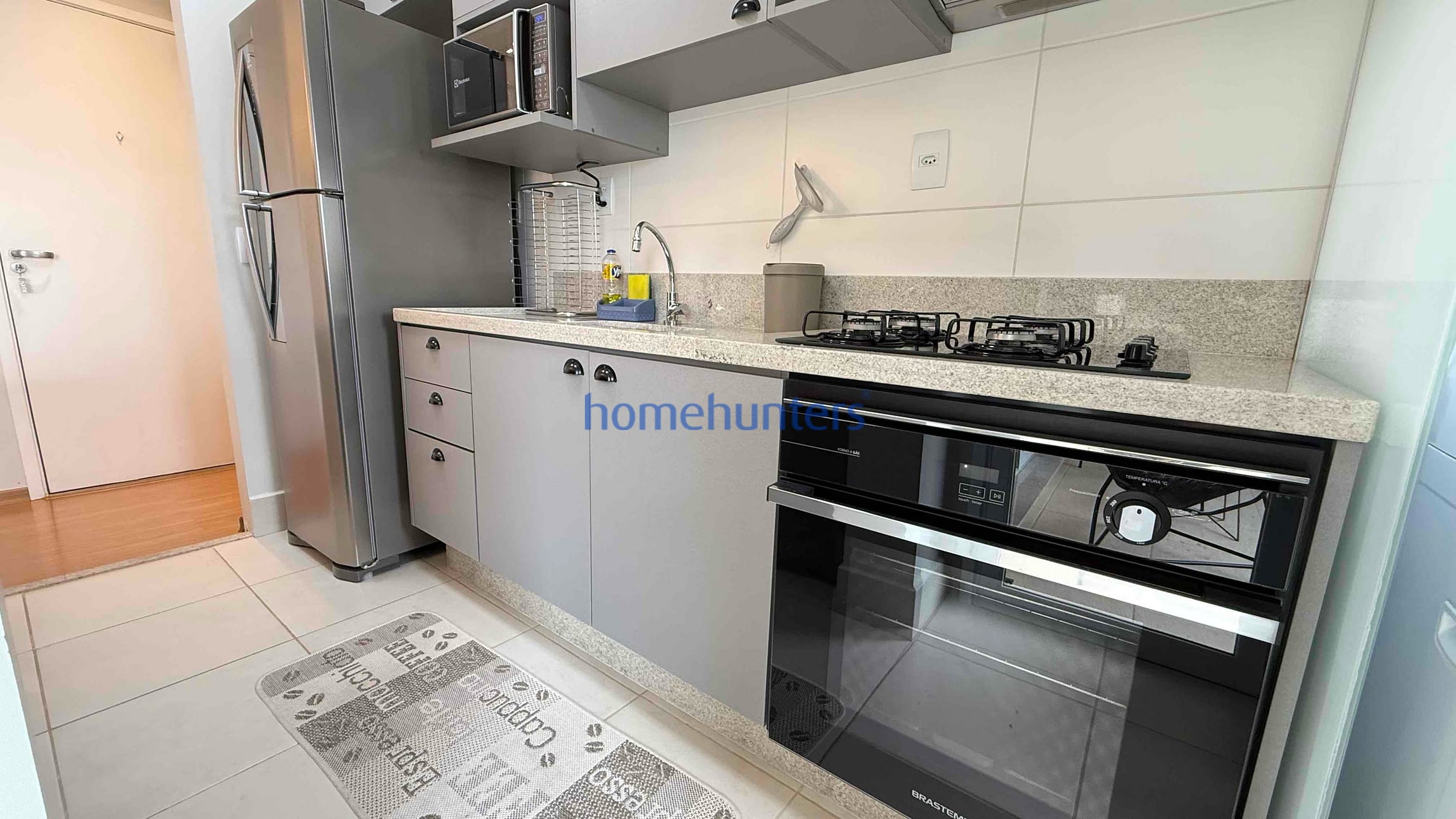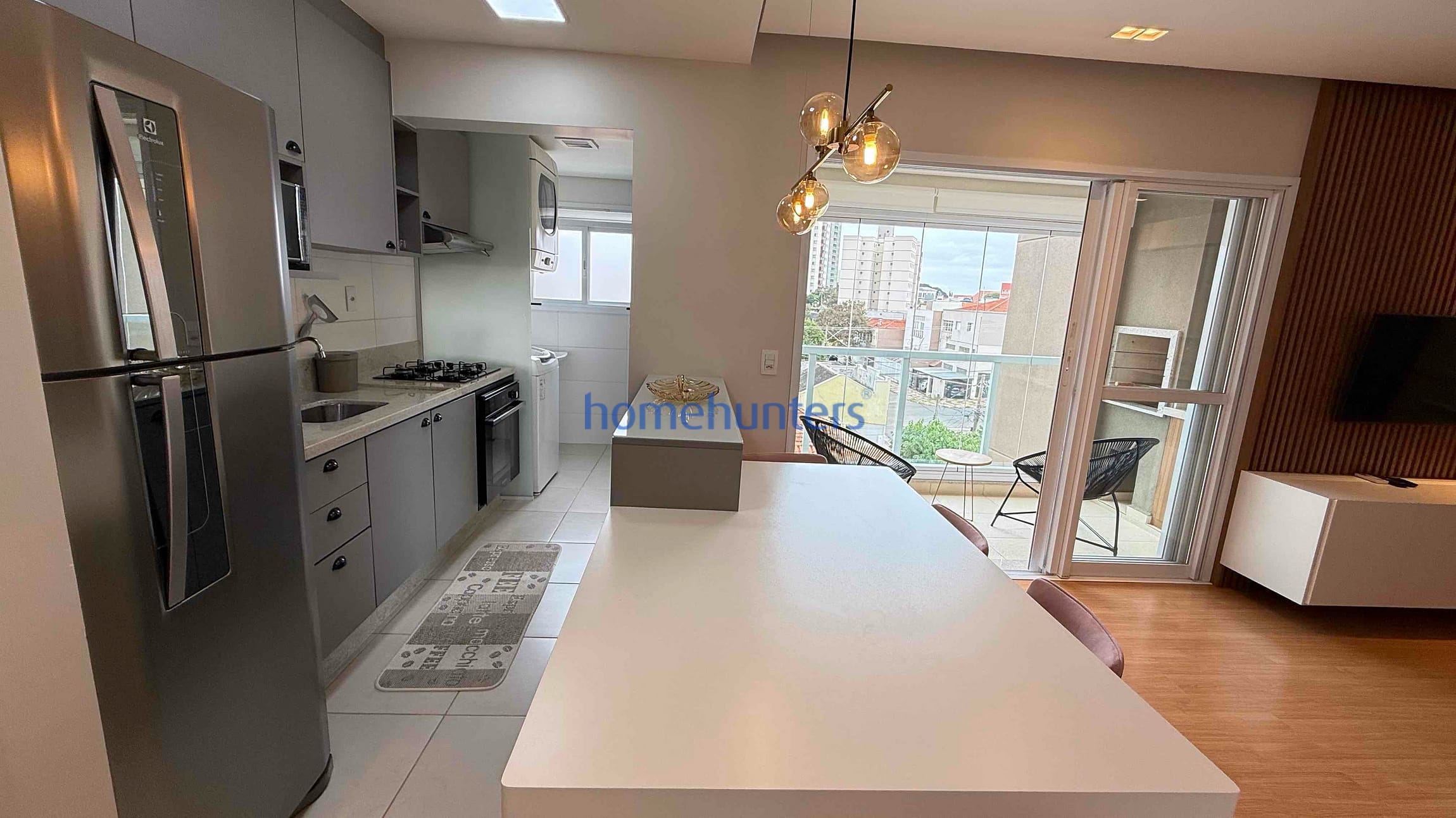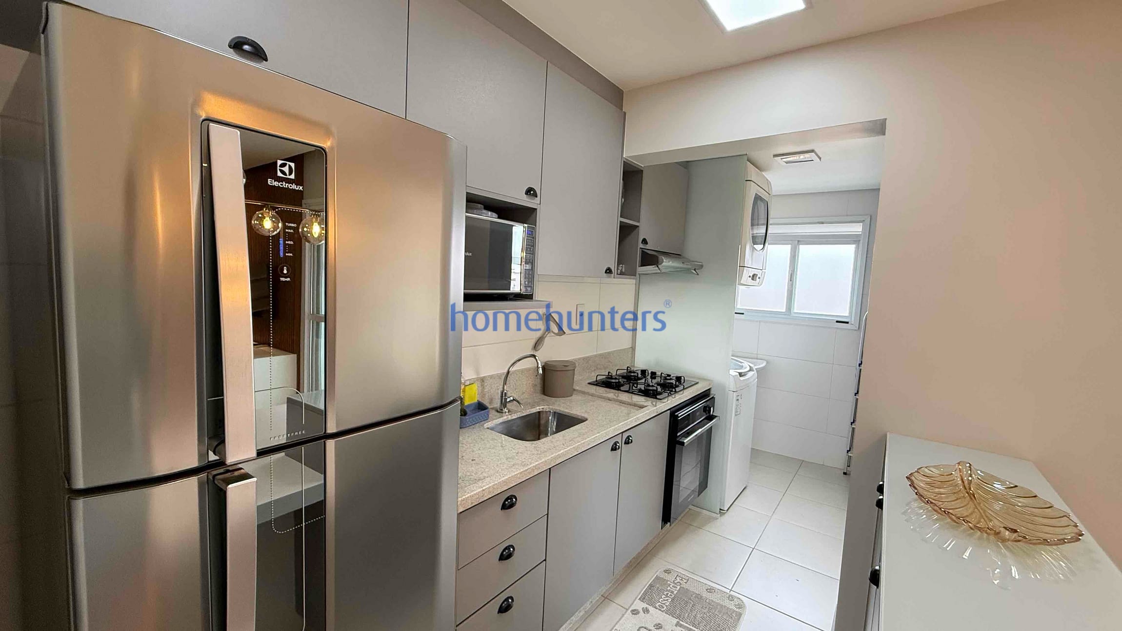 Cozinha planejada rica em armários, com geladeira, forno, cooktop e micro-ondas inclusos