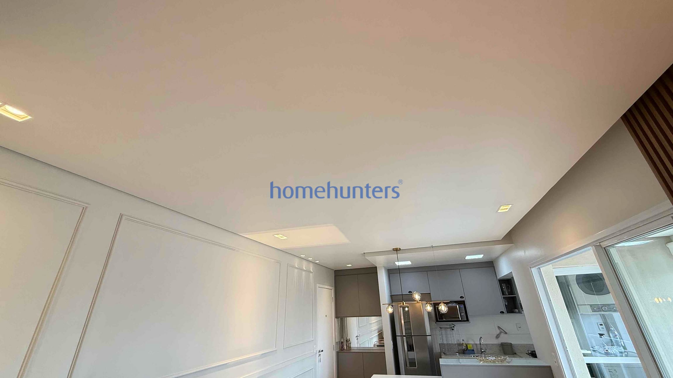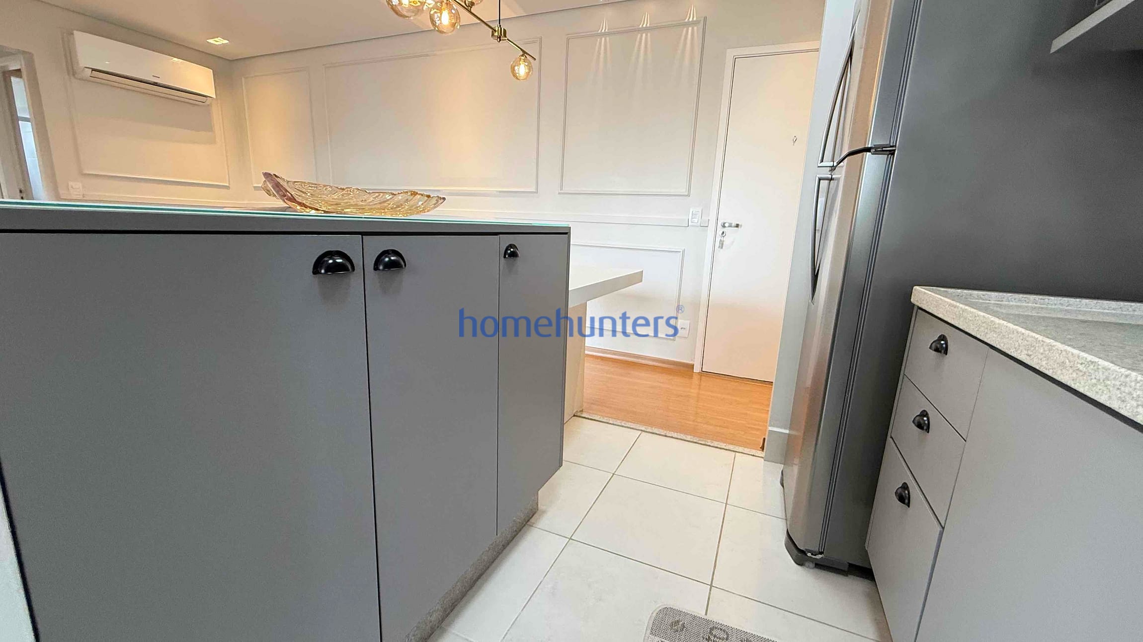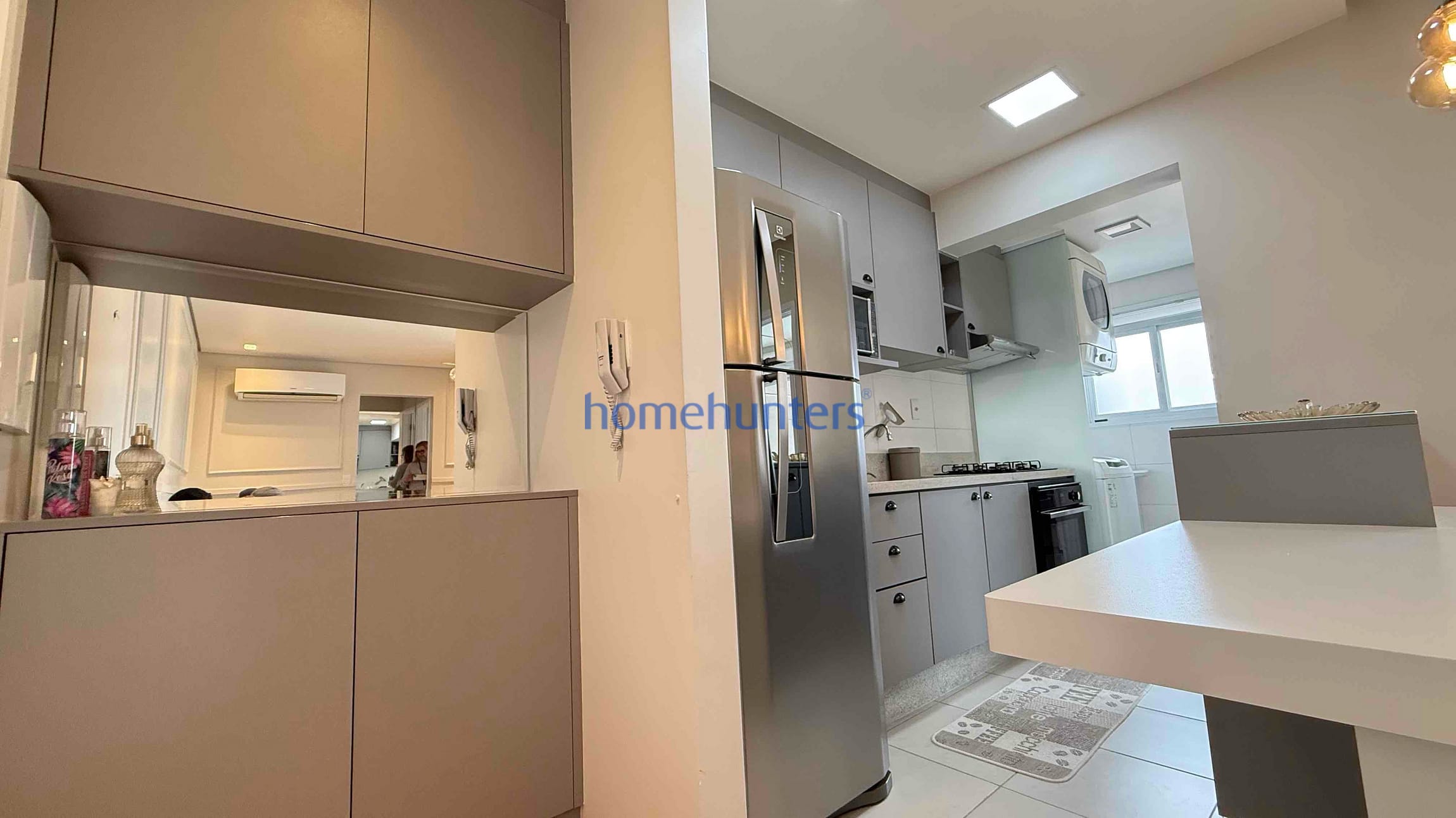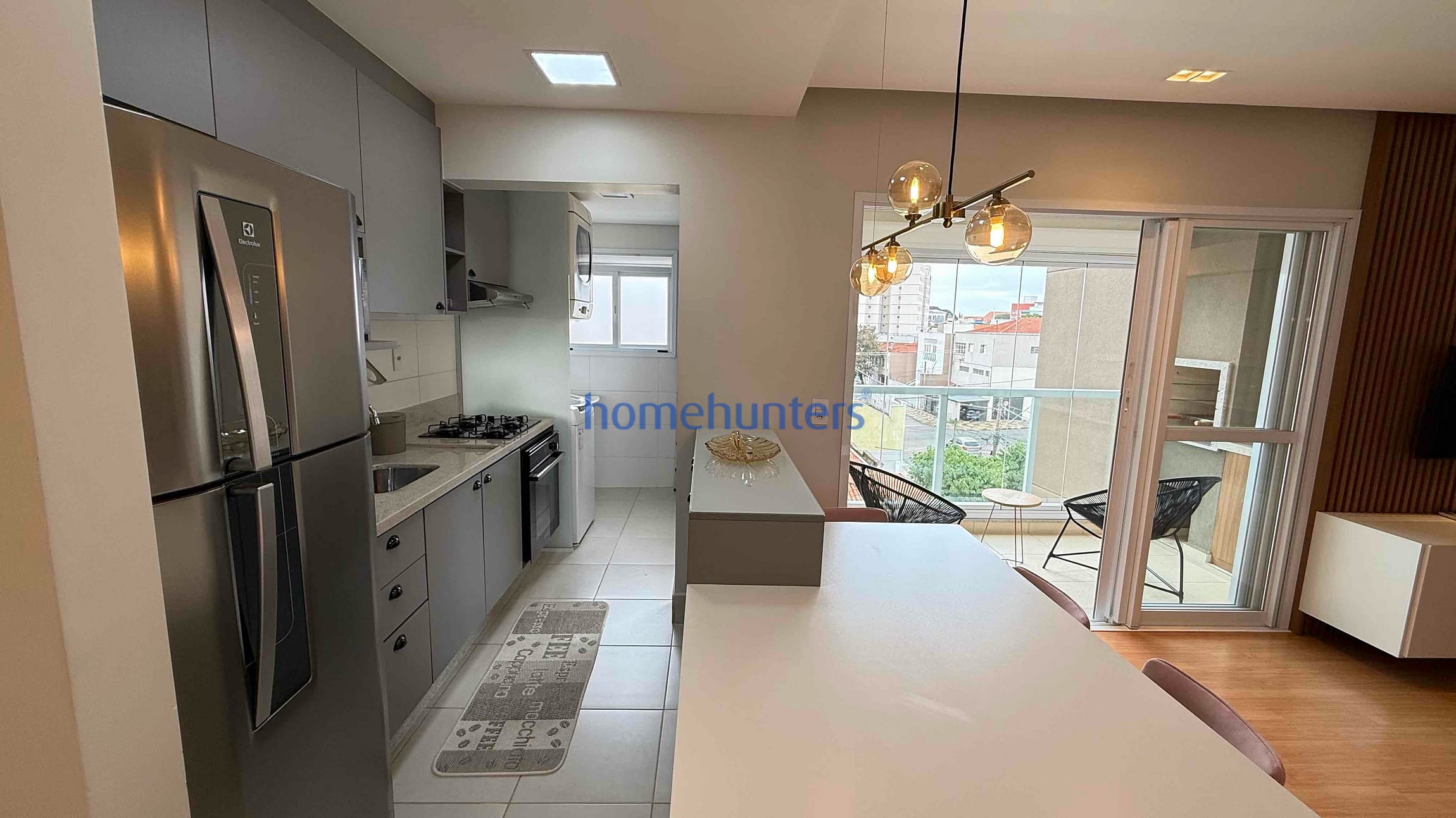 Cozinha planejada rica em armários, com geladeira, forno, cooktop e micro-ondas inclusos