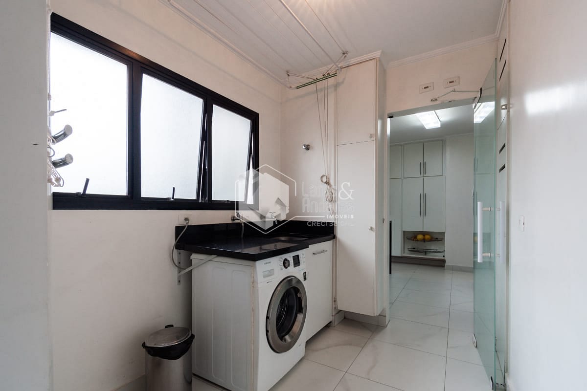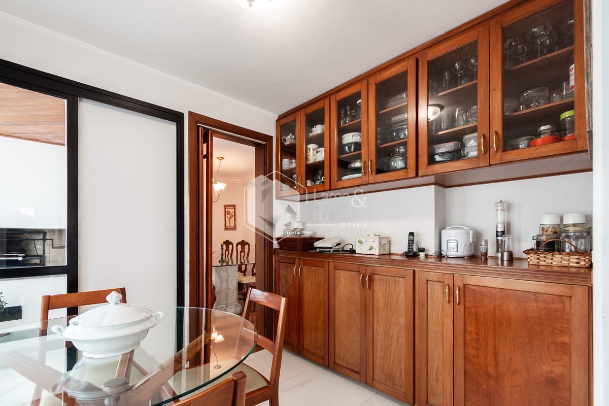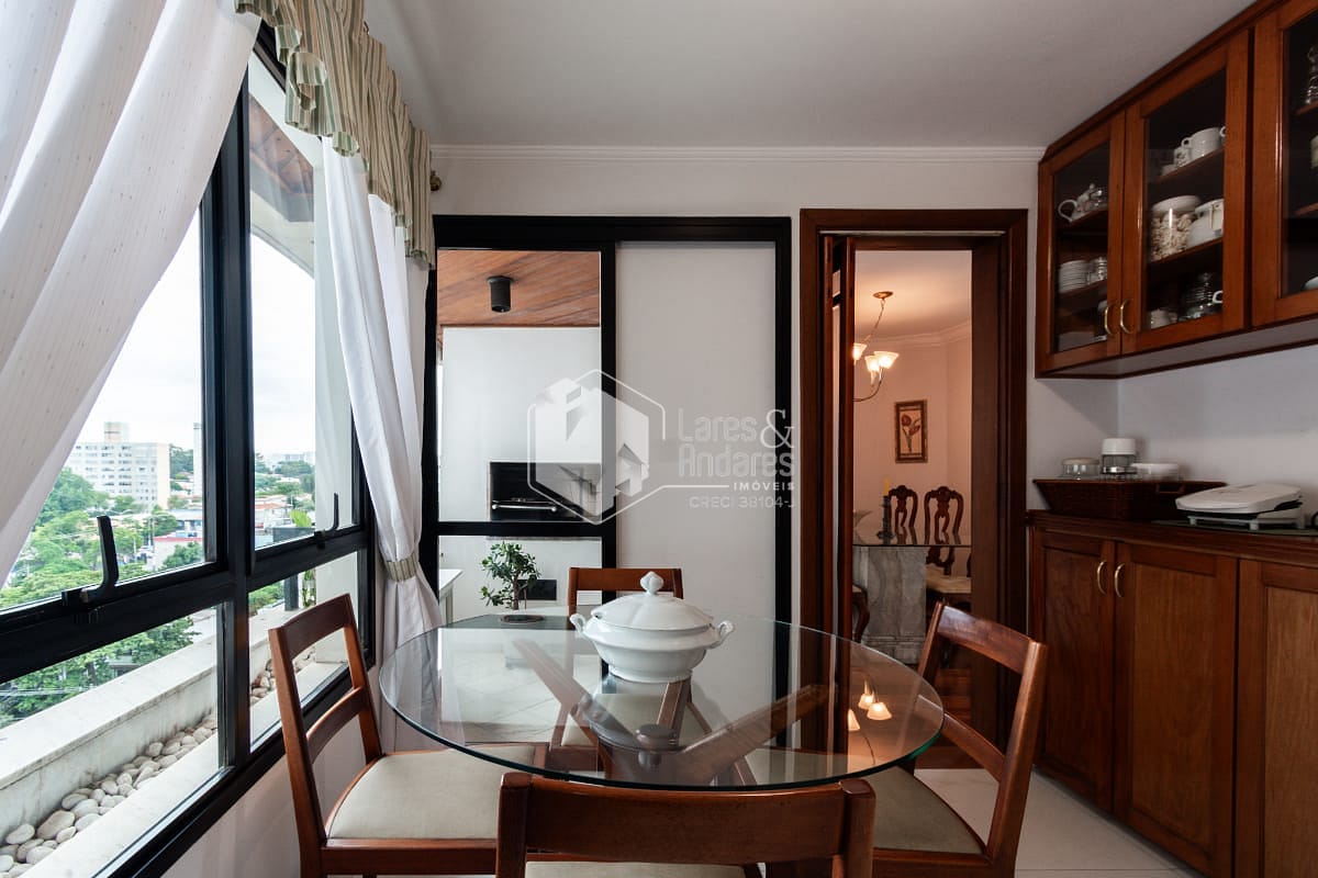 A área social é completa e funcional, com sacada equipada com churrasqueira, conectando harmoniosamente a sala de jantar e a sala de almoço. A cozinha é bem planejada e acompanhada de área de serviço com dependência completa para funcionários. O imóvel dispõe ainda de três vagas de garagem determinadas e depósito privativo.