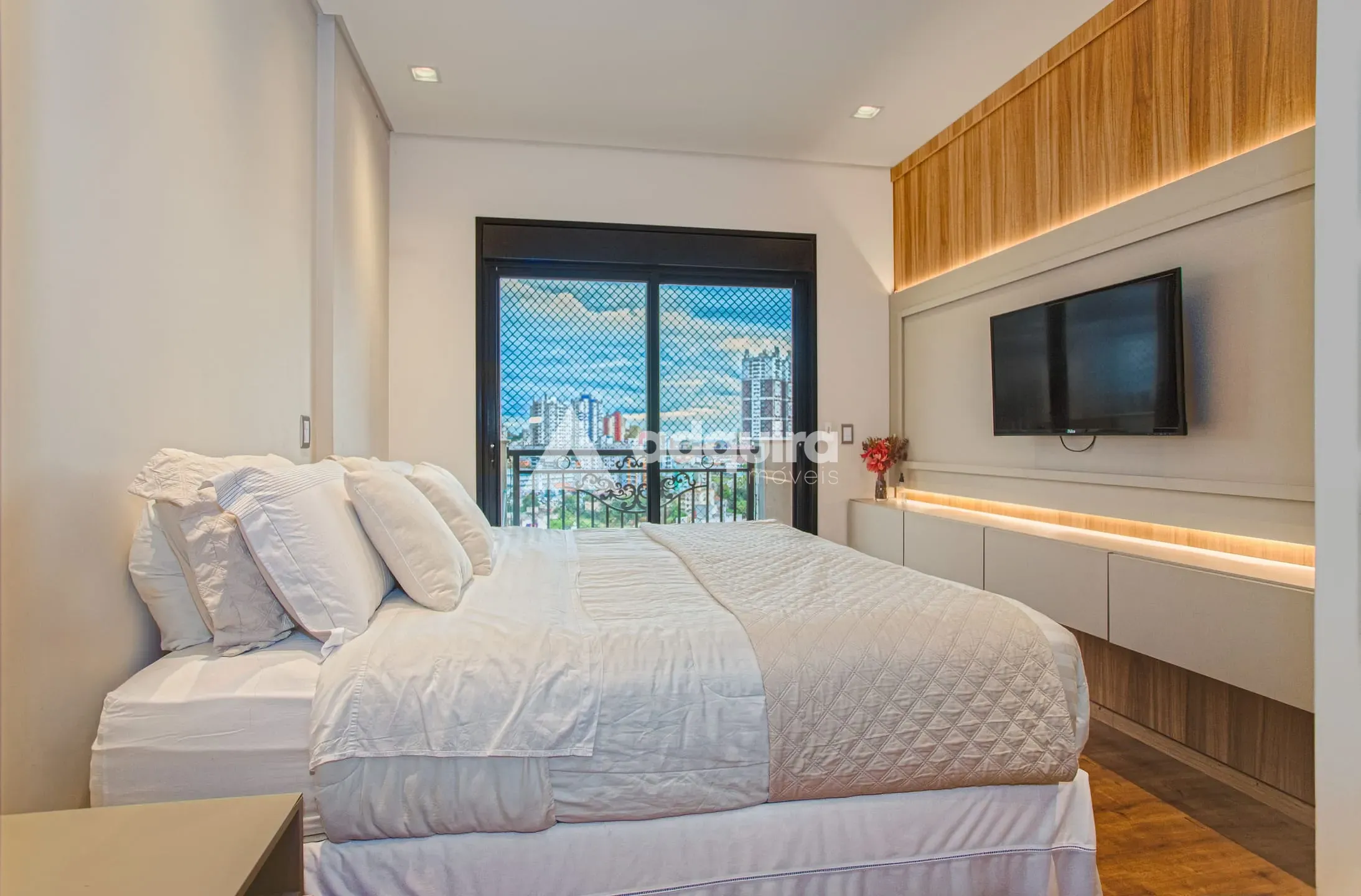 A área íntima dispõe de três suítes, todas equipadas com móveis planejados, sendo que duas delas possuem sacada, proporcionando uma bela vista e favorecendo a entrada de luz natural, criando um ambiente agradável e acolhedor.