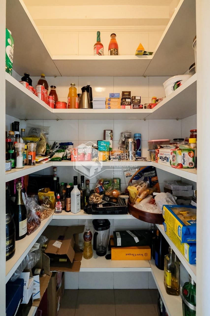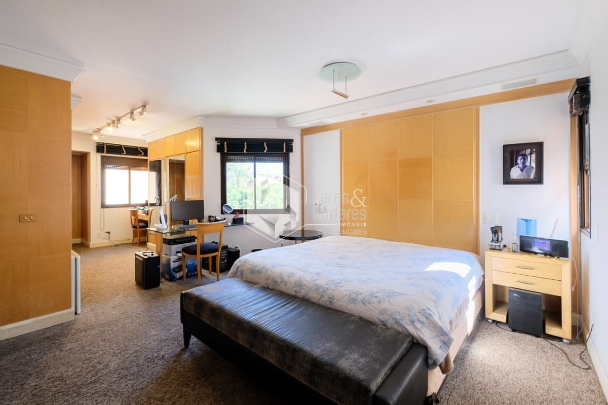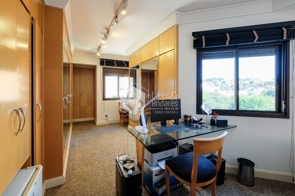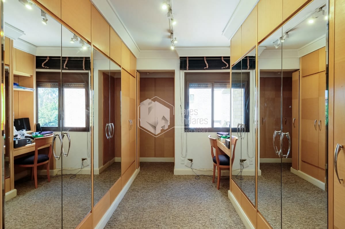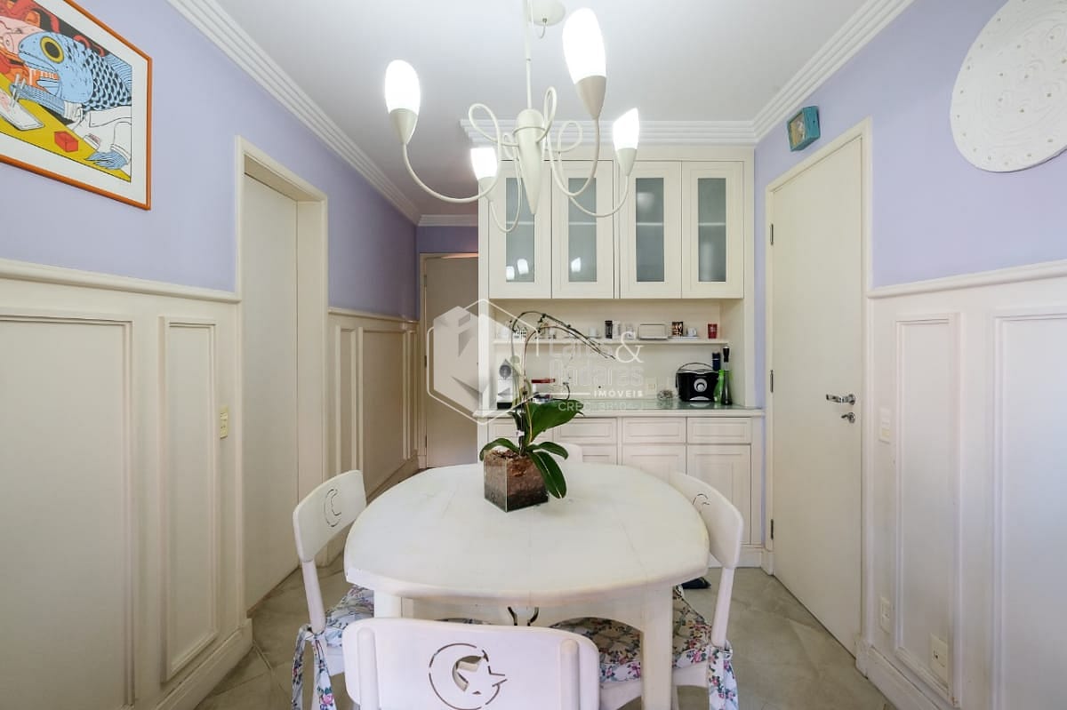 Na área íntima, a planta original tem 4 dormitórios, sendo 3 suítes. Hoje está com 2 suítes e um escritório (a 3ª suíte foi convertida em closet para a suíte master). Há uma pequena sala ligando a área íntima à sala de almoço, cozinha e área de serviço. Esta saleta pode ser facilmente ampliada com a incorporação das dependências de empregada, ensejando seu uso como escritório ou outra finalidade. Completando a planta de 177m², uma ótima cozinha com luz direta, muitos armários planejados e o conforto de uma despensa, além uma área de serviço ampla e arejada com dependências de empregada.