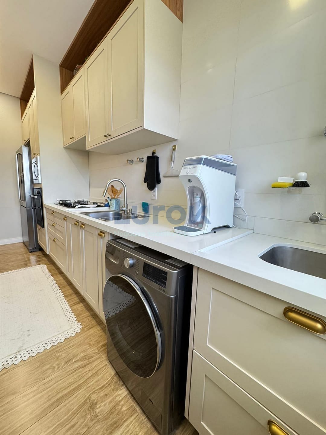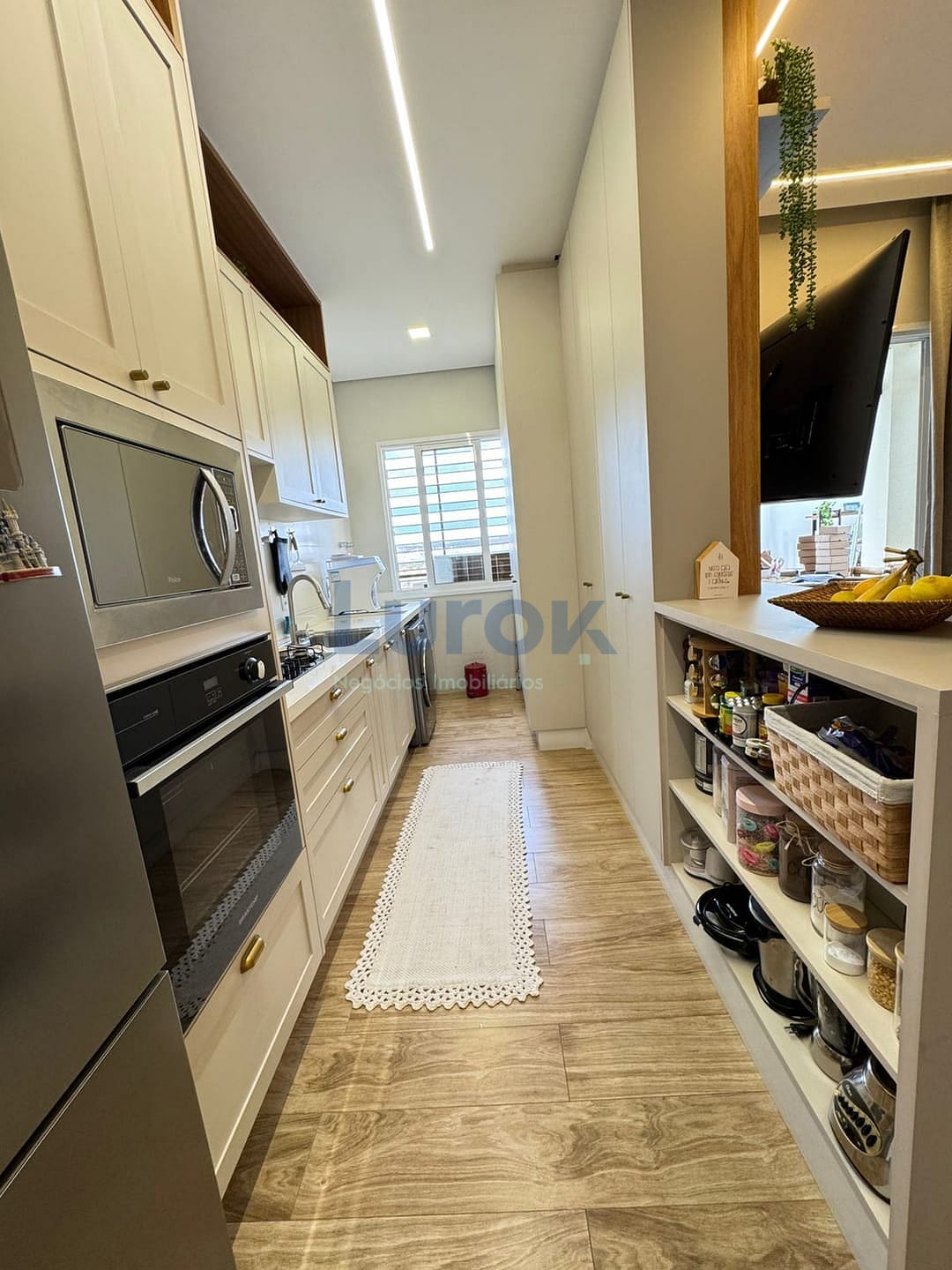 A cozinha estilo americano, totalmente planejada, integra-se harmoniosamente à sala de estar e jantar, criando um ambiente amplo, funcional e acolhedor.