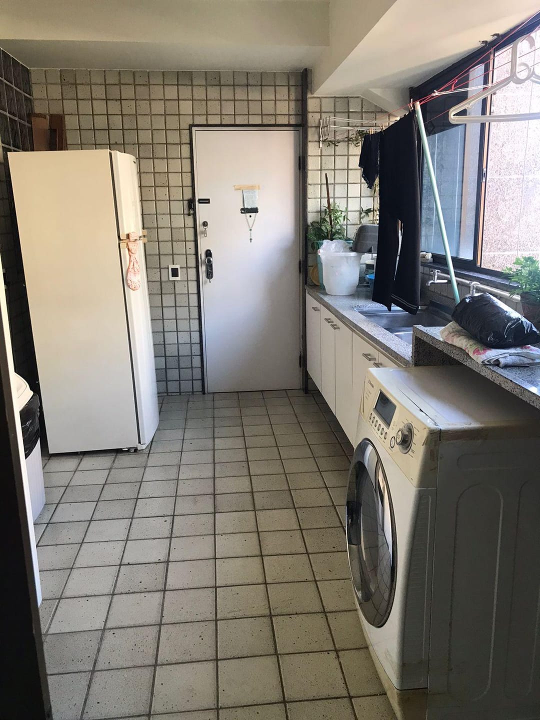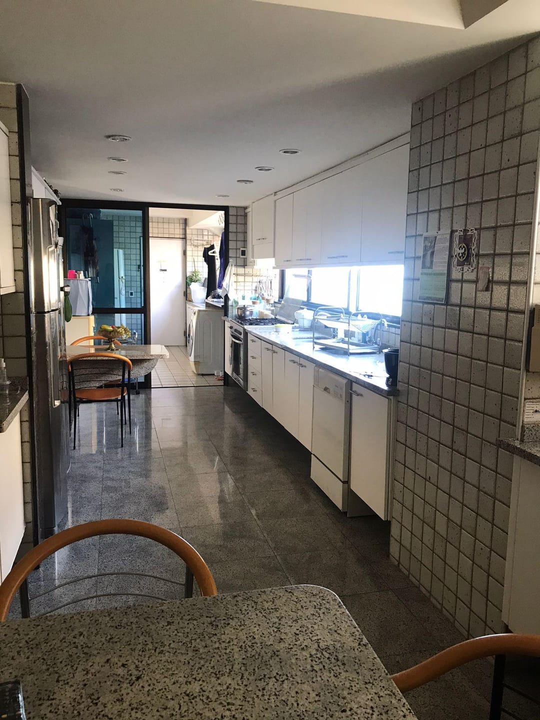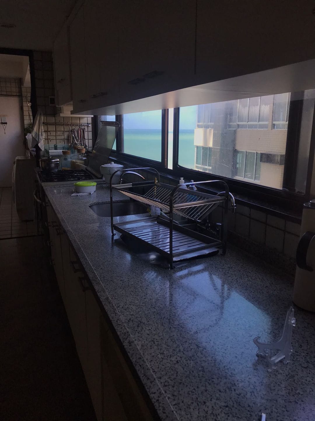 Cozinha grande com área de serviço completa com vista para o mar de todo o espaço.