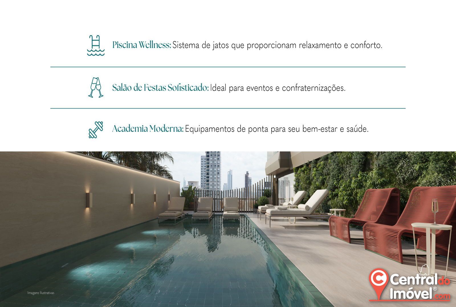 O empreendimento conta com hall de entrada decorado e mobiliado, medidores de água, luz e gás individuais, elevador, interfone, bicicletário, entrada para banhistas e box de praia, alarme, estar social, guarita de segurança, reaproveitamento de água e circuito de TV.
