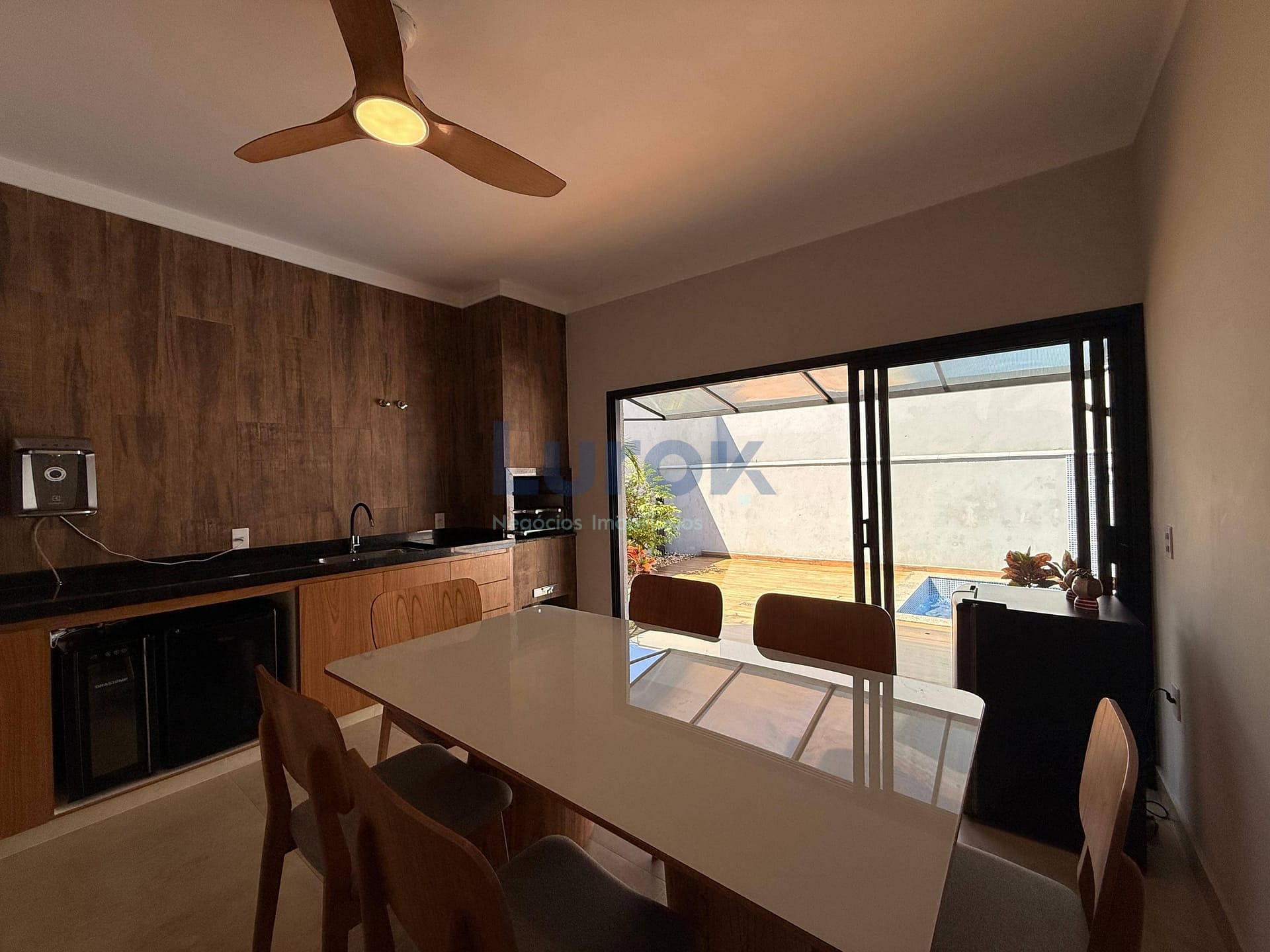 Belíssimo espaço gourmet com churrasqueira e ventilador de teto