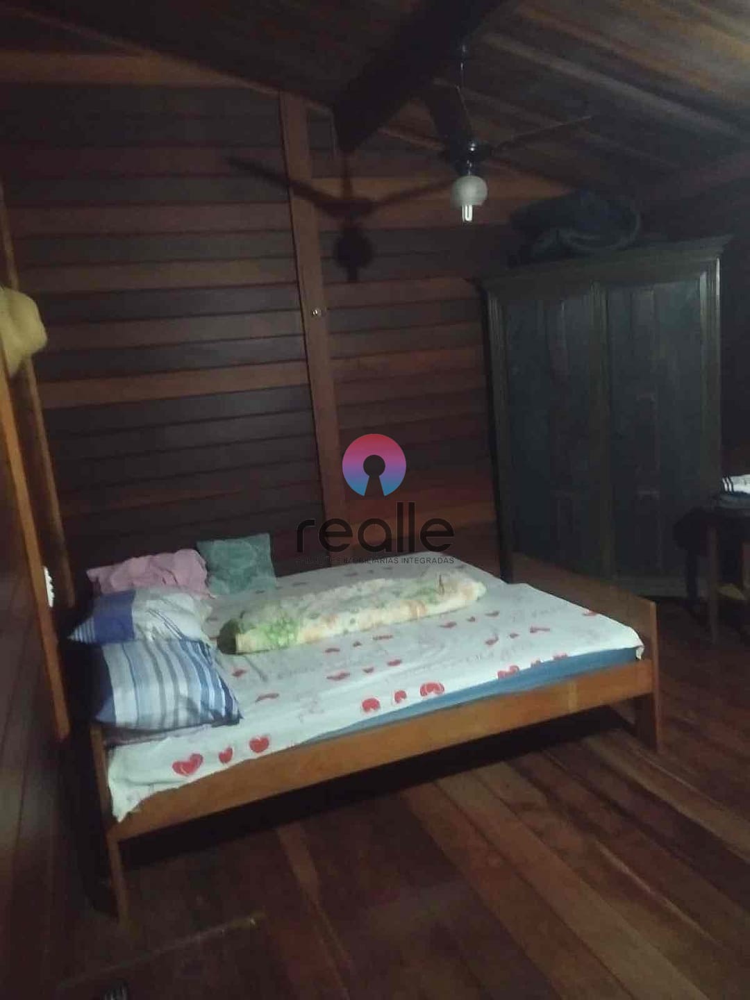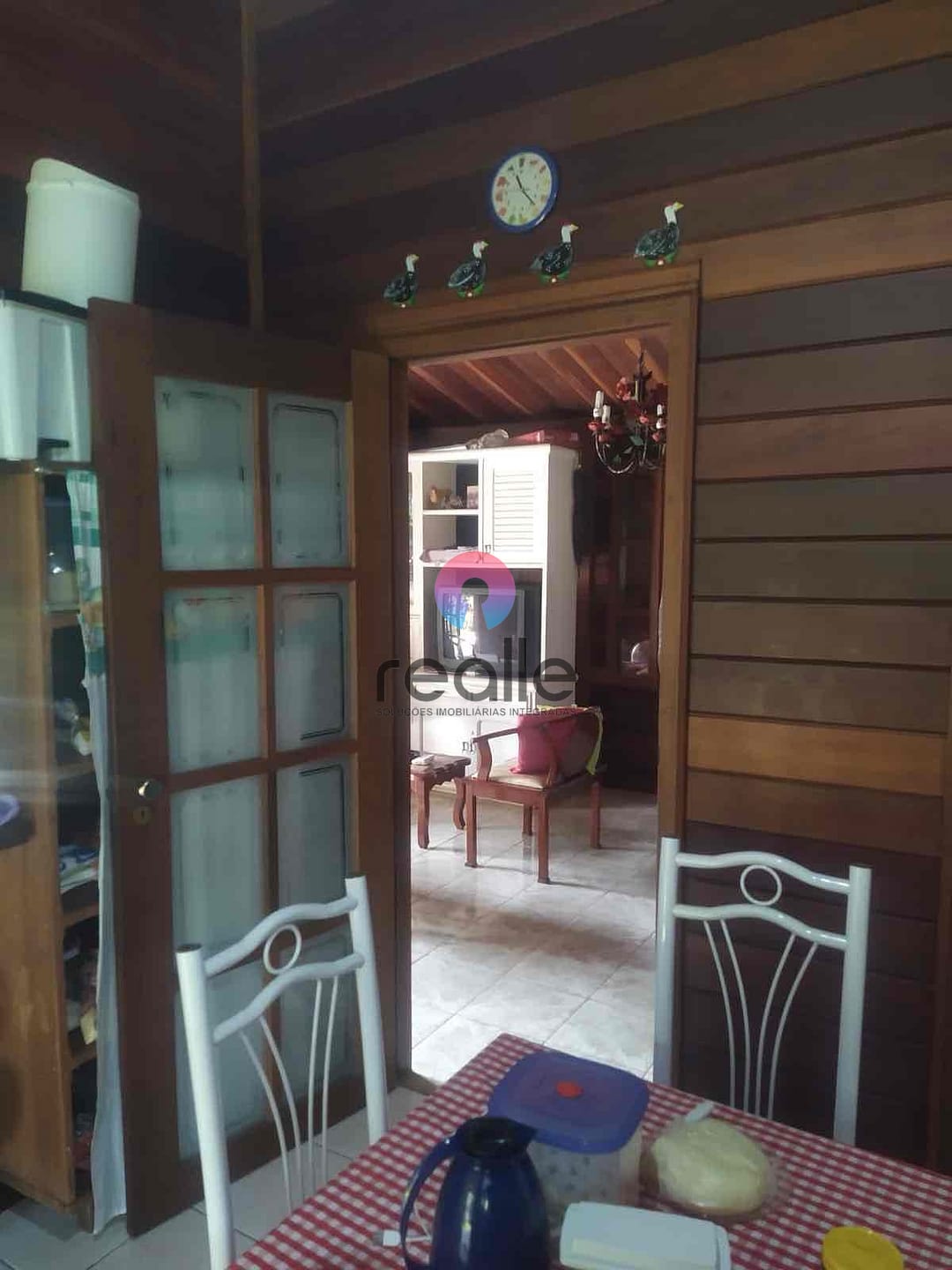 Casa em estilo chalé, de madeira, com sala copa, cozinha, dois quartos e banheiro.