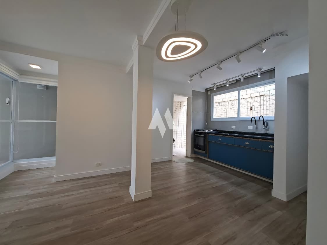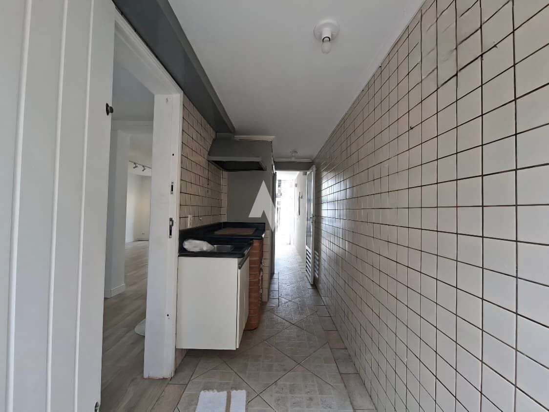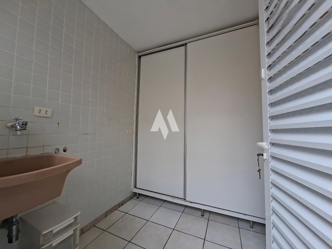 No térreo, espaço aberto reunindo sala de estar, sala de jantar e cozinha integrada com fogão embutido e móvel planejado sob a pia, ar condicionado, persianas e lavabo. A área de serviço é fechada e independente, com armário embutido, e a área externa oferece churrasqueira com pia para receber amigos.
