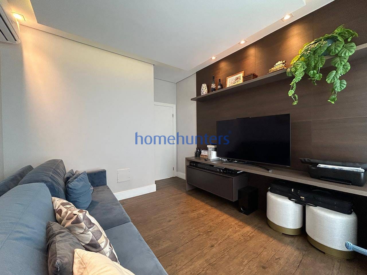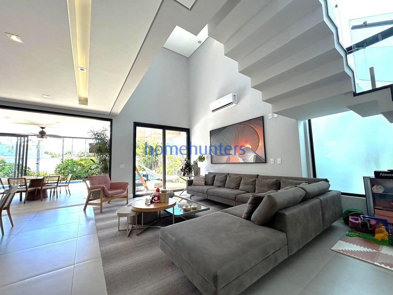 No piso superior, a casa oferece três suítes amplas, todas com ar-condicionado e armários planejados, sendo a suíte master com closet. O living integrado proporciona sensação de amplitude e elegância, complementado por sala de TV e copa de apoio, trazendo praticidade para a rotina.