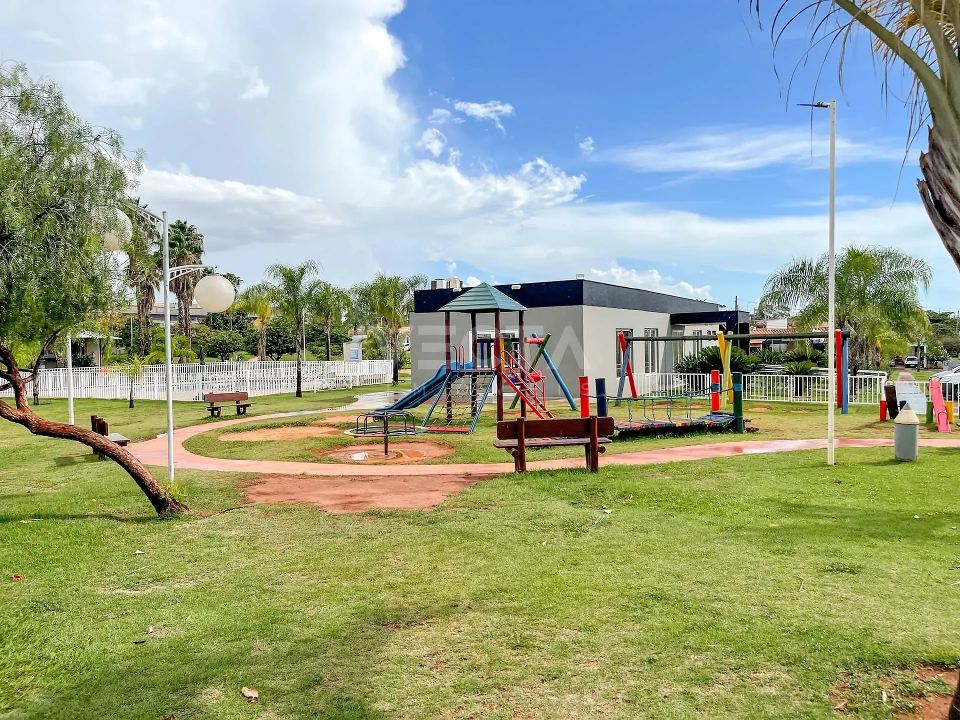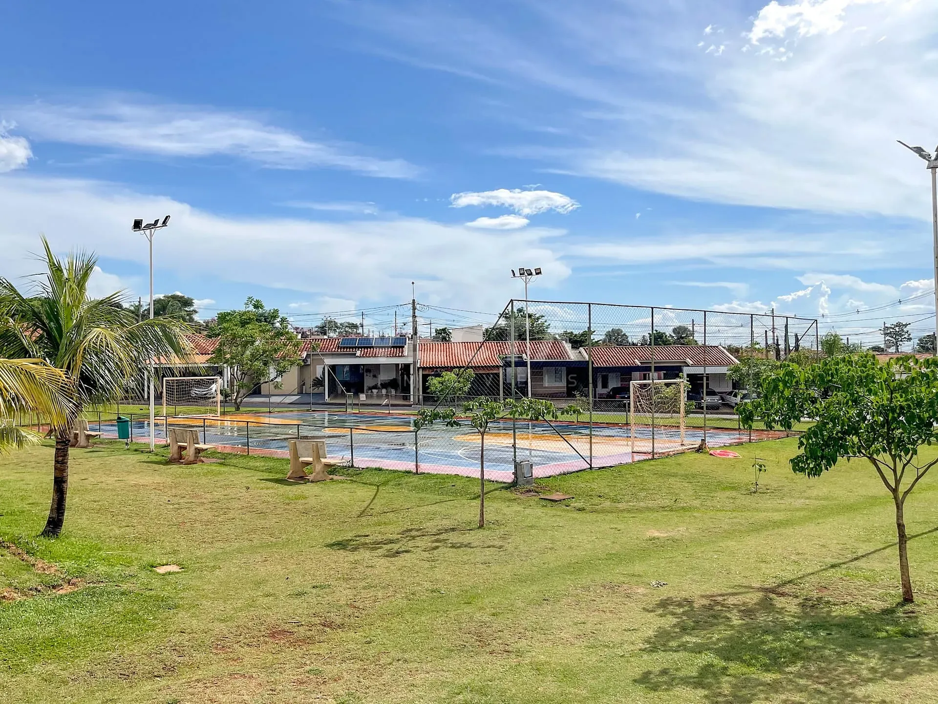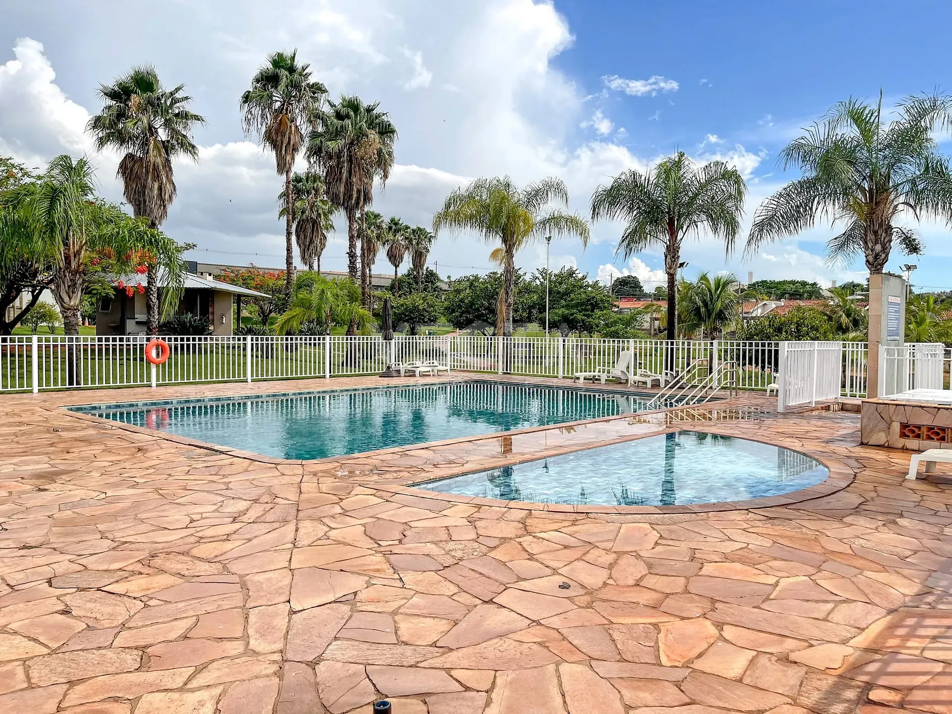 - condomínio com portaria 24h, piscinas adulto e infantil, quiosque com churrasqueira, salão de festas, playground, campo de futebol, quadra poliesportiva, minimercado