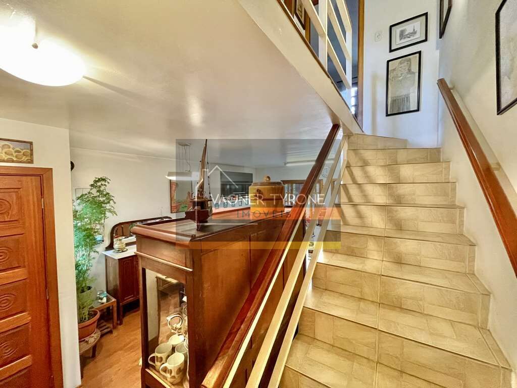 •Escada em alvenaria com guarda-corpo em ferro e corrimão de madeira