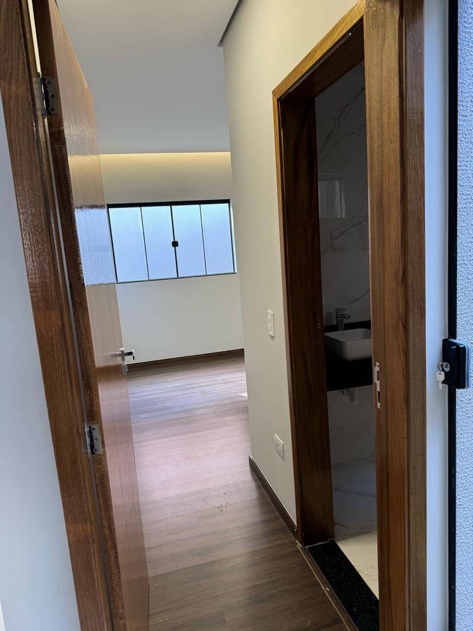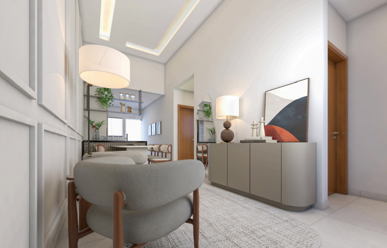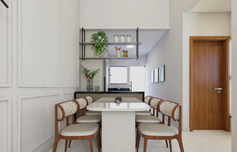 Casa geminada com 3 quartos, sendo 01 suíte, sala integrada com cozinha, jardim de inverno, lavanderia e espaço para criar um gourmet. A porta de entrada é madeira Pivotante. Fotos reais com a casa sem planejados no final das imagens.
