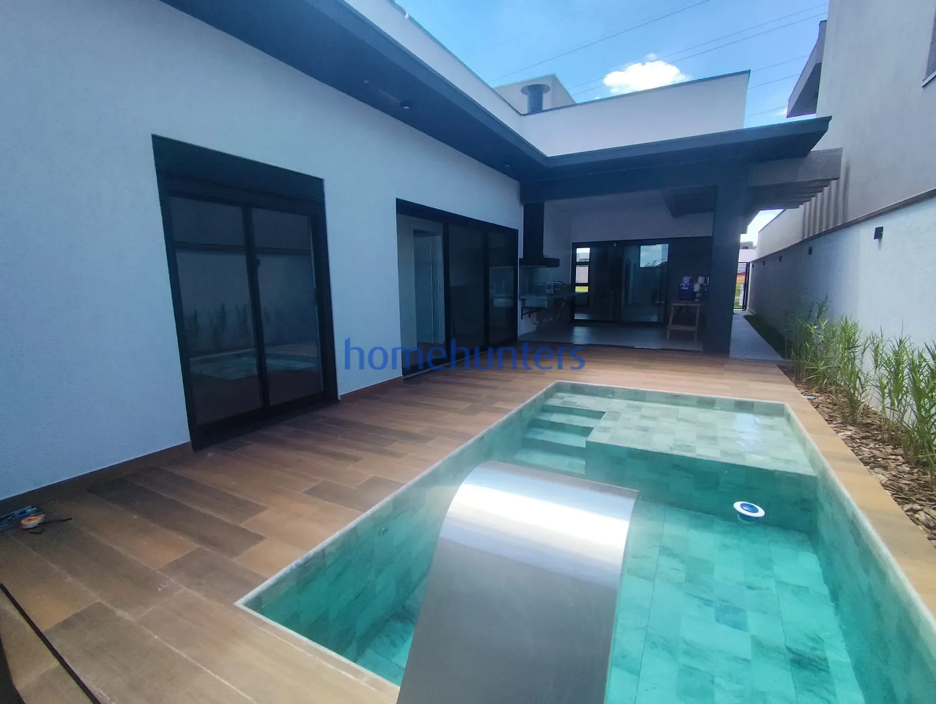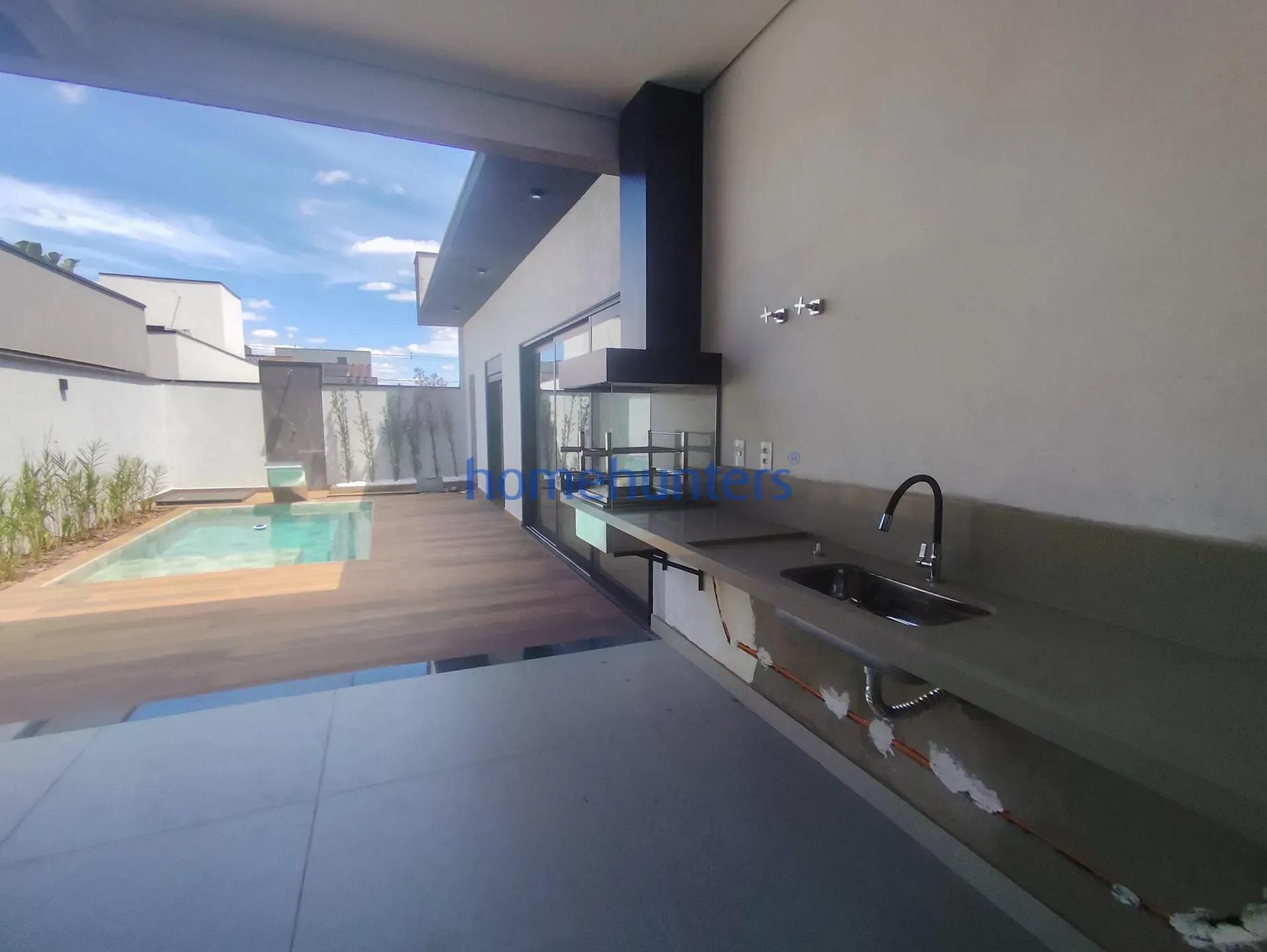 Casa moderna no Santorini Residencial Club, em Paulínia, com 3 suítes, área gourmet integrada, piscina, infraestrutura para ar-condicionado e acabamento de alto padrão. Condomínio clube com portaria 24h, lazer completo e localização privilegiada no Parque Brasil 500.
