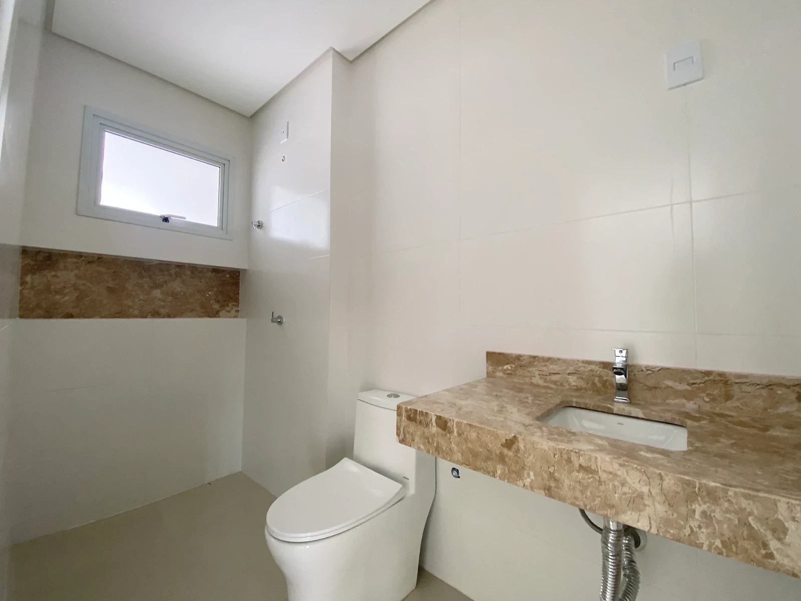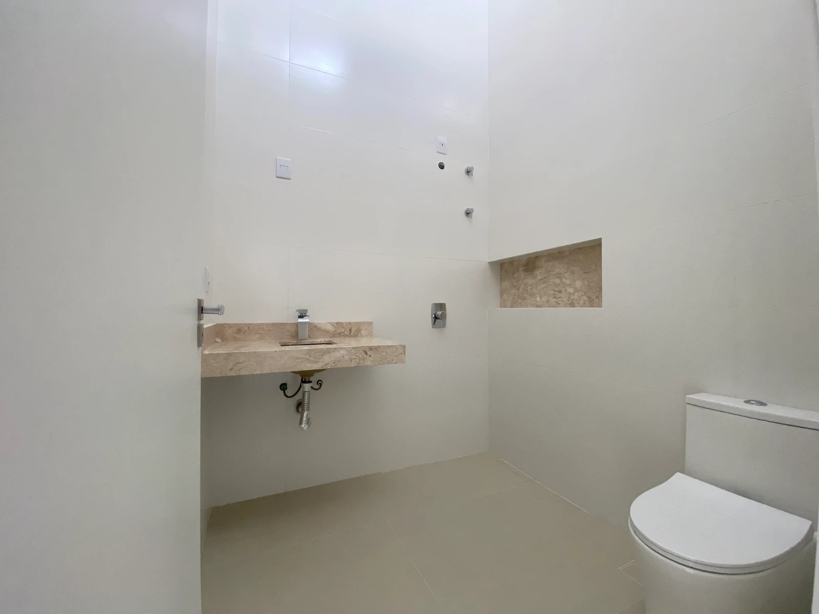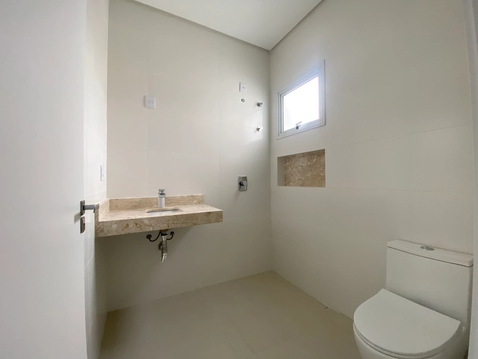 04 Banheiros entregues com bancadas e nichos em granito travertino, torneiras e monocomandos metálicos.