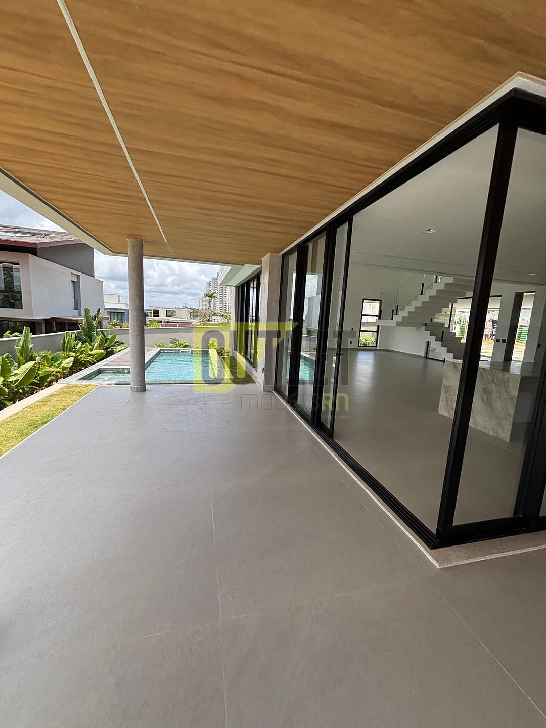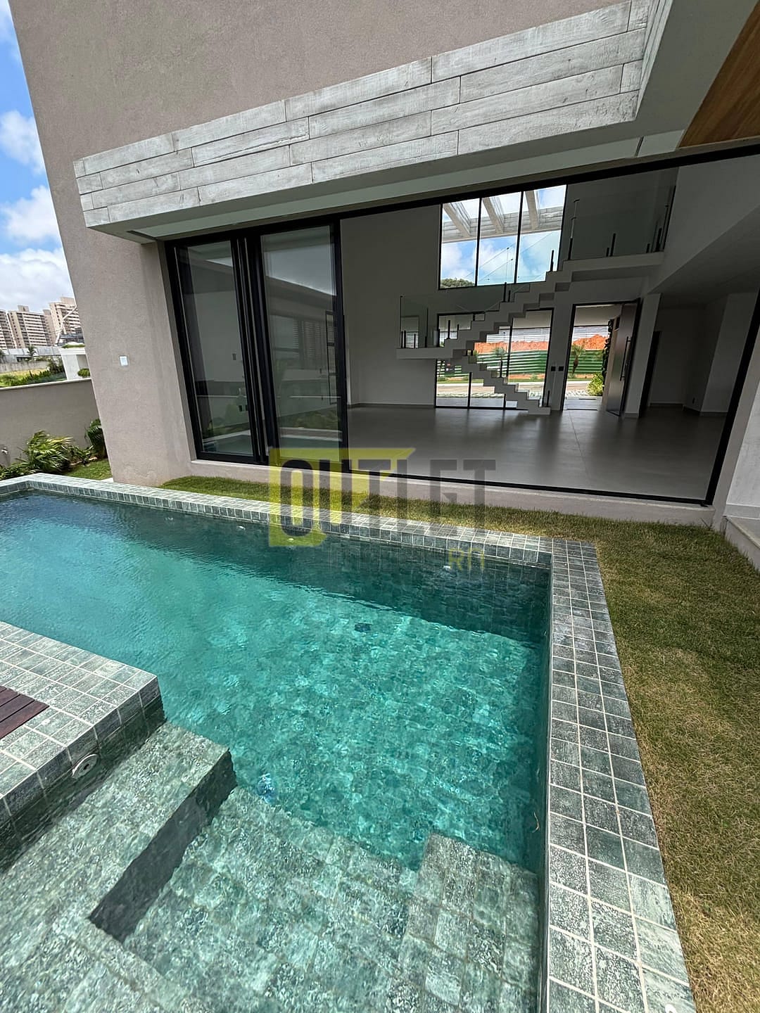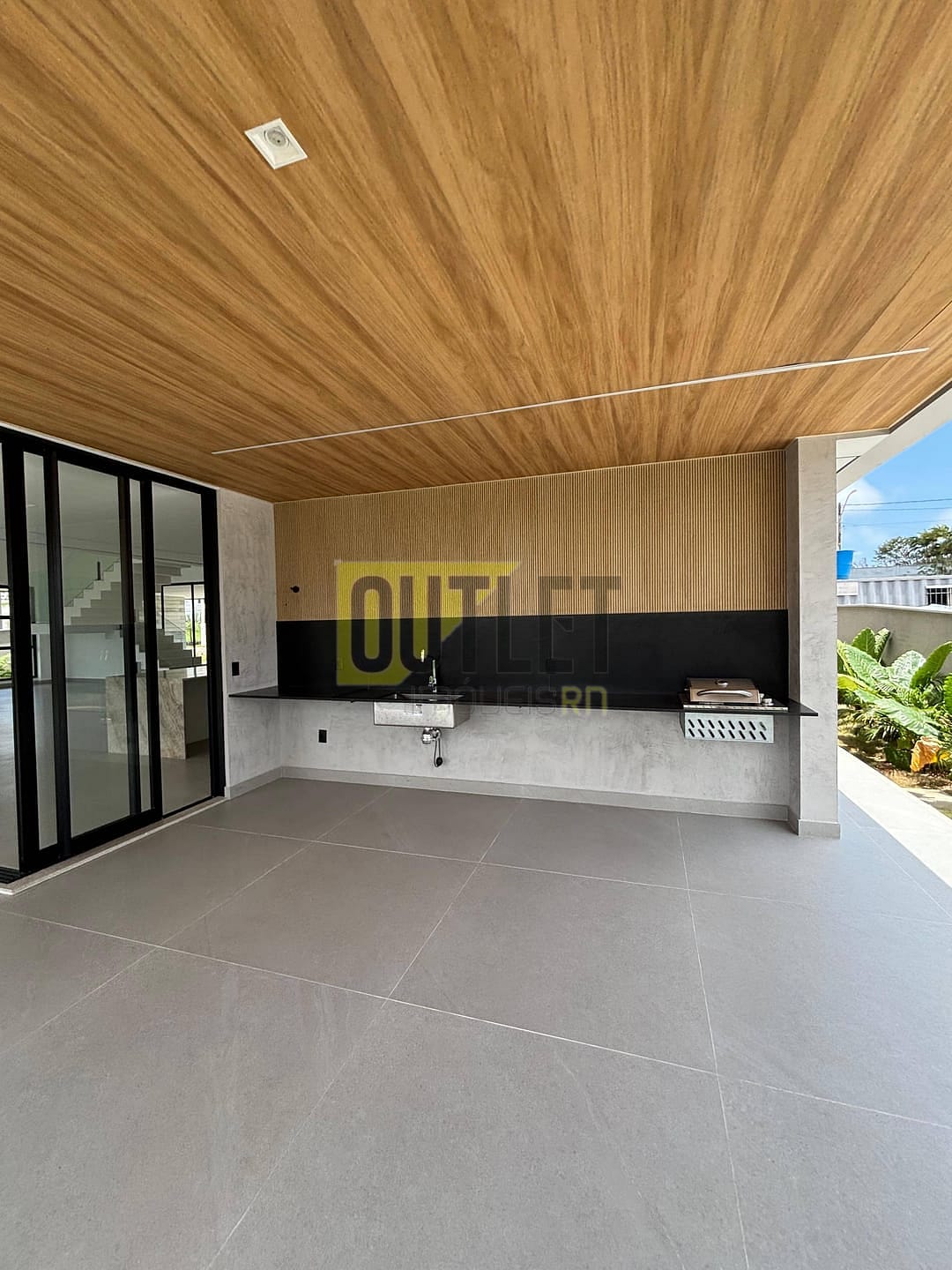 A transição entre o interior e o exterior é feita através de grandes esquadrias de alumínio e vidro que se abrem para o jardim e a área de lazer. Desfrute de sua Piscina exclusiva com um charmoso deck molhado em madeira e um paisagismo exuberante, criando uma atmosfera de resort particular. Para os entusiastas da culinária, o Espaço Gourmet é completo, com bancadas em granito preto e duas pias (visível nas fotos), ideal para instalação de churrasqueira e para receber convidados com estilo. A varanda no pavimento superior (também visível nas fotos) oferece um vasto terraço para contemplação.