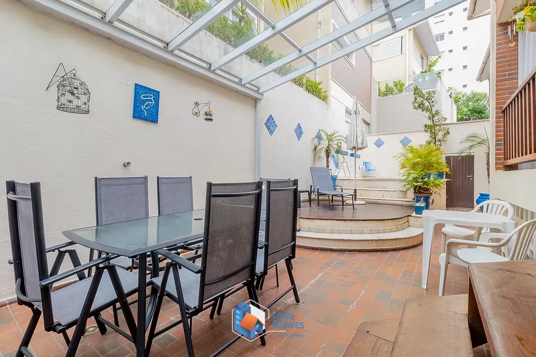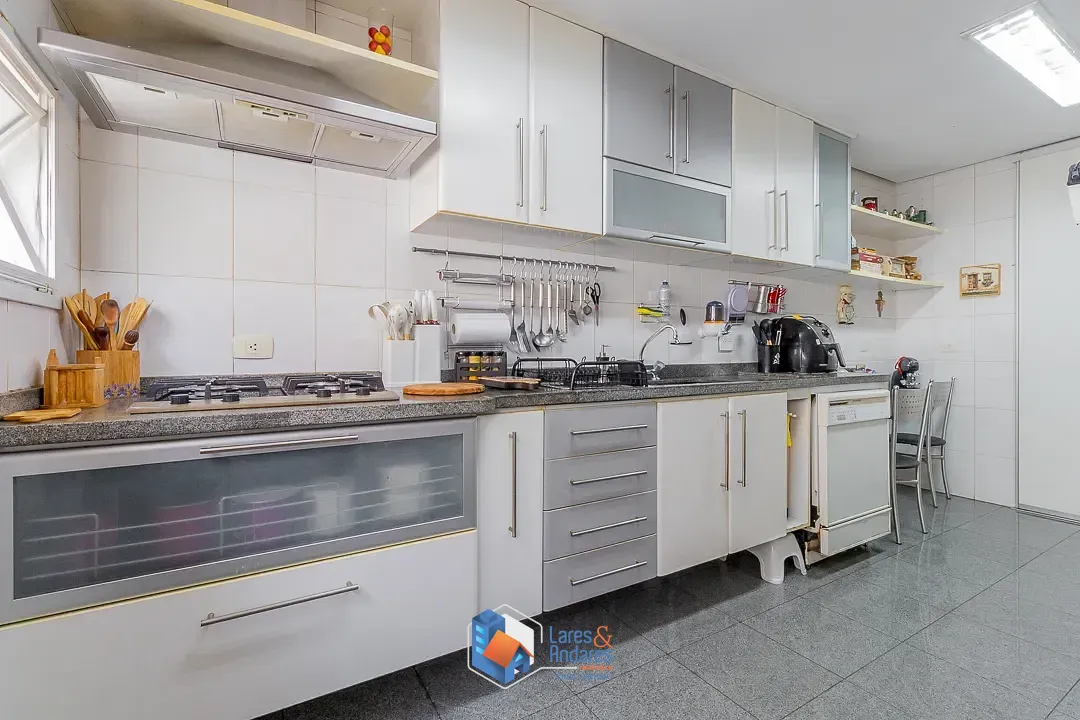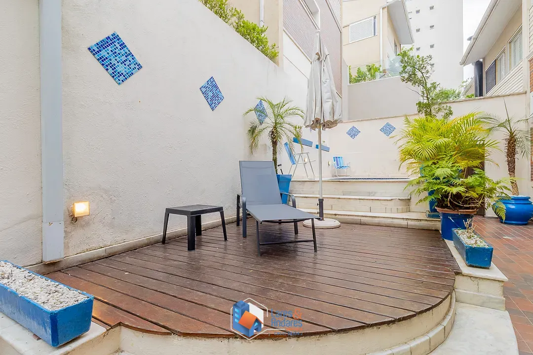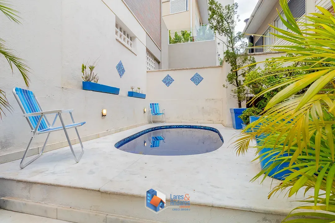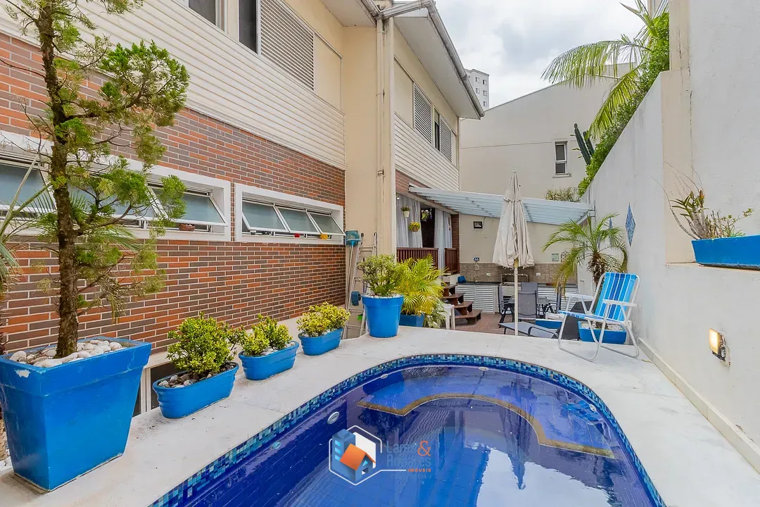 O espaço de lazer externo, privativo surpreende, ocupando a área generosa do duplo terreno. O ambiente é parcialmente coberto por uma estrutura de vidro, abrigando uma área gourmet completa com churrasqueira em alvenaria, bancada de apoio, pia e armários náuticos. A área descoberta é um convite ao relaxamento, com deck em madeira elevado para solário e uma piscina privativa com hidromassagem com revestimento em pastilhas azuis e borda em mármore, tudo cercado por muros altos com azulejaria clássica que garantem privacidade. A cozinha é totalmente planejada com muitos armários, bancadas em granito escuro, cuba dupla em aço inox, cooktop com coifa, forno elétrico e piso de granito, conta ainda com uma copa integrada para refeições rápidas.