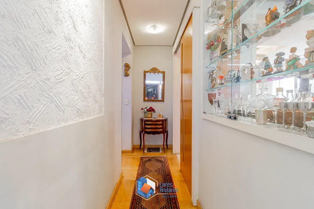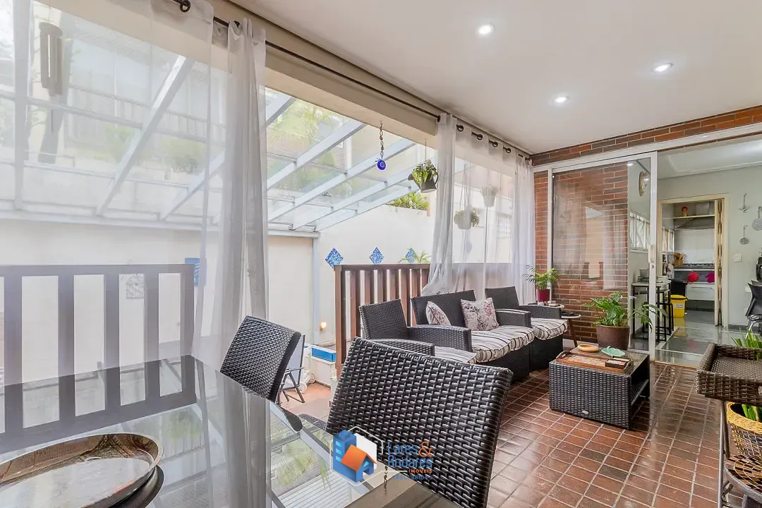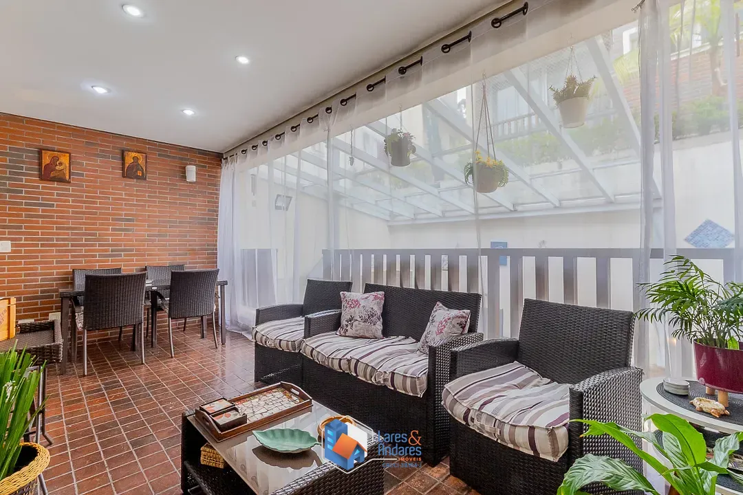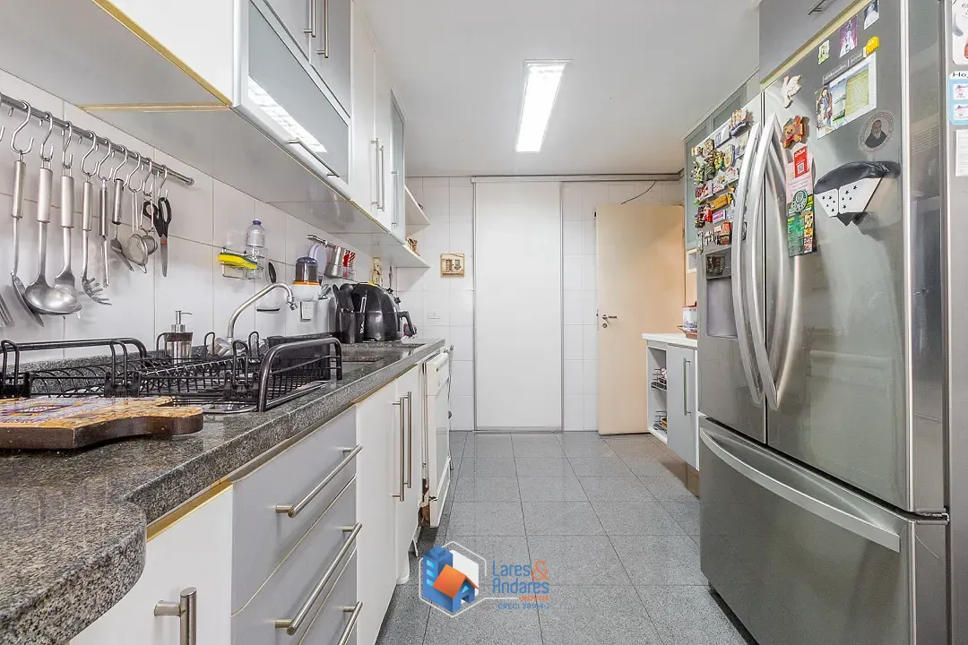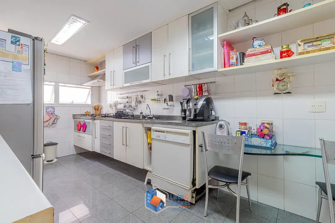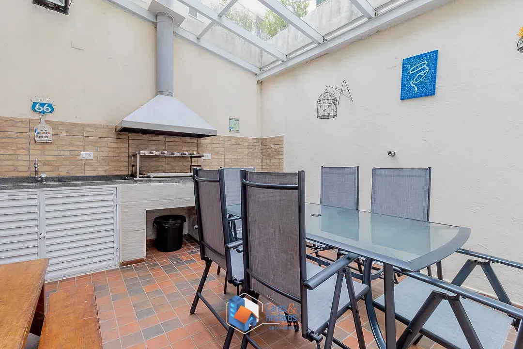 O espaço de lazer externo, privativo surpreende, ocupando a área generosa do duplo terreno. O ambiente é parcialmente coberto por uma estrutura de vidro, abrigando uma área gourmet completa com churrasqueira em alvenaria, bancada de apoio, pia e armários náuticos. A área descoberta é um convite ao relaxamento, com deck em madeira elevado para solário e uma piscina privativa com hidromassagem com revestimento em pastilhas azuis e borda em mármore, tudo cercado por muros altos com azulejaria clássica que garantem privacidade. A cozinha é totalmente planejada com muitos armários, bancadas em granito escuro, cuba dupla em aço inox, cooktop com coifa, forno elétrico e piso de granito, conta ainda com uma copa integrada para refeições rápidas.