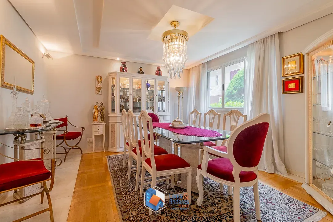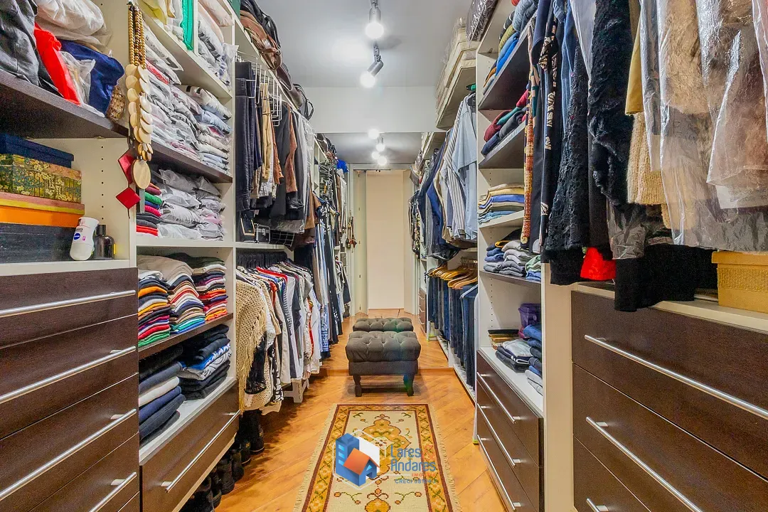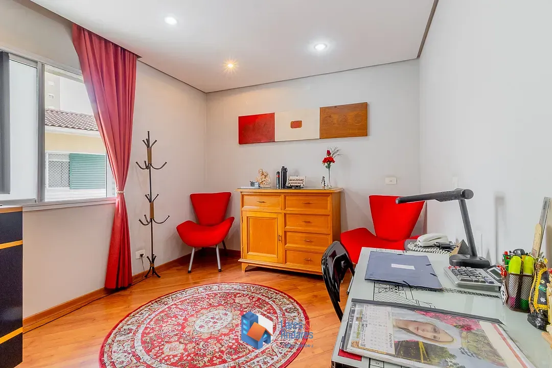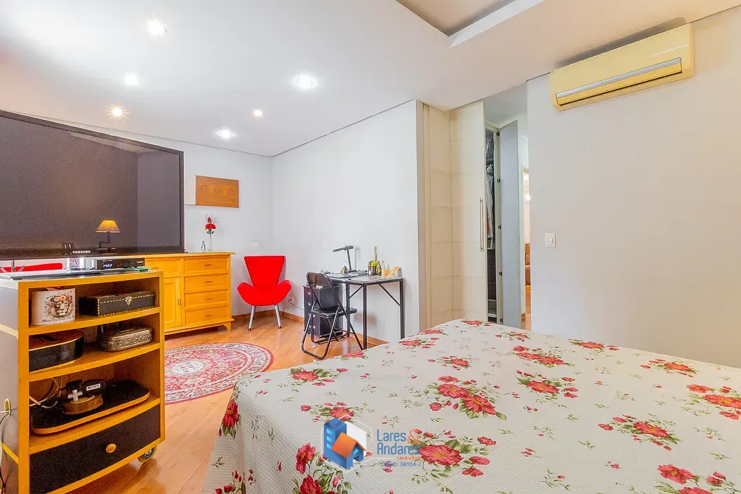 No pavimento superior, a área íntima é composta por 4 dormitórios, sendo todos suítes espaçosas com piso laminado de madeira. Um grande diferencial é que todas as suítes foram projetadas com espaço para escritórios e closets individuais, atendendo às necessidades de home office e organização. Todos os dormitórios são climatizados com ar-condicionado tipo split e ventiladores de teto. A suíte master para o Sr. e Sra., destaca-se pelo amplo closet com marcenaria sob medida e banheiro equipado com banheira de hidromassagem. A residência conta ainda com 5 vagas de garagem e um sótão técnico versátil. O condomínio oferece infraestrutura completa com portaria, quadra poliesportiva, playground e sauna seca, úmida e ducha. O imóvel possui 3 tomadas individuais dentro da casa e 2 luminárias na escada al