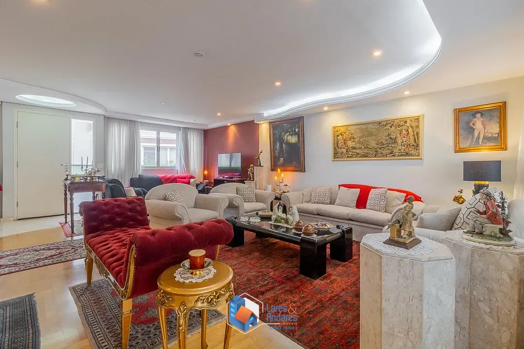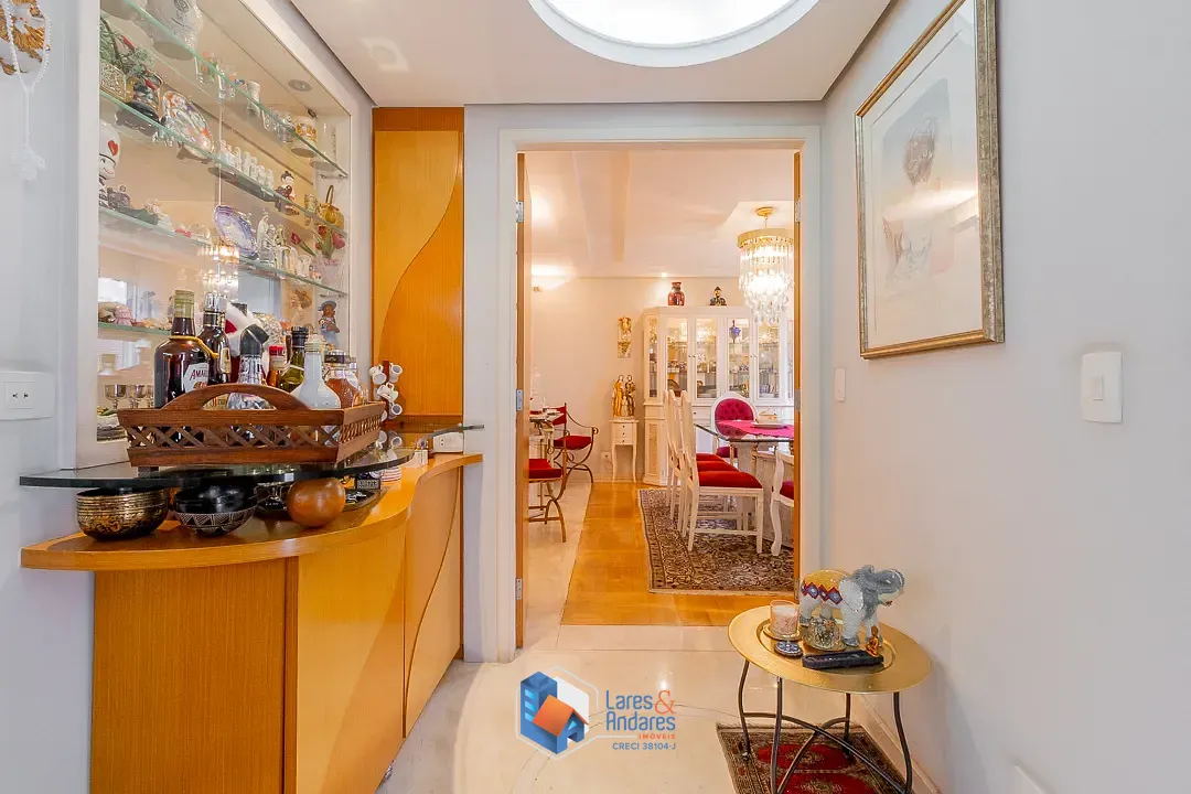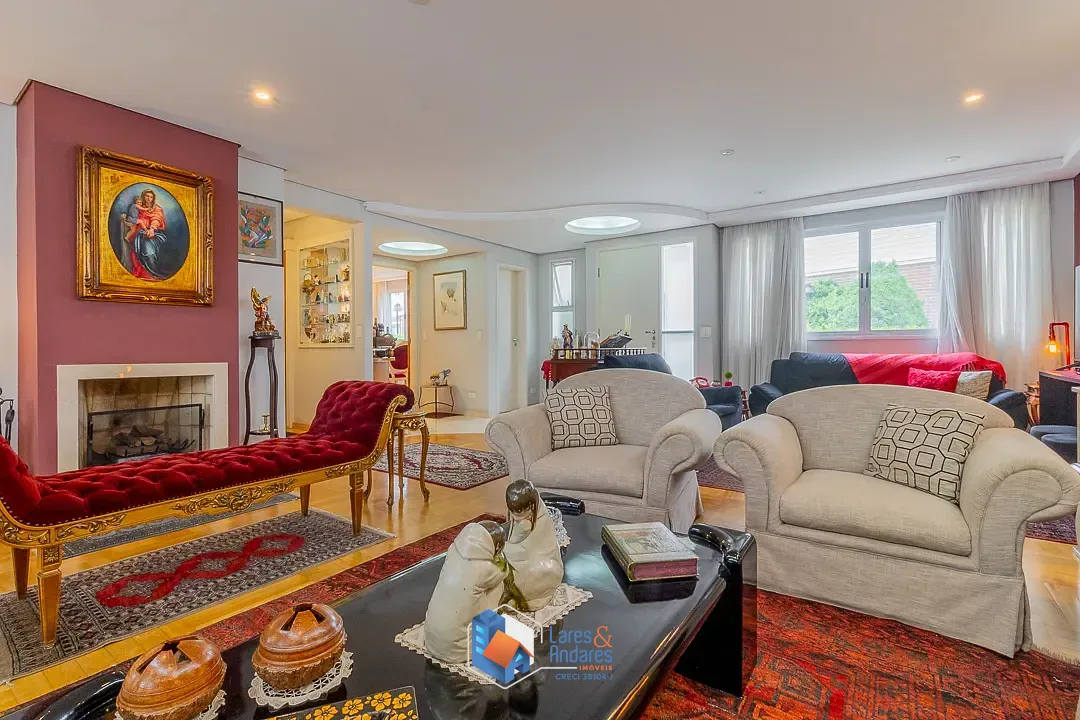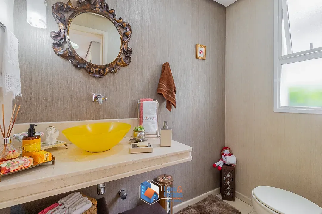 Esta casa de alto padrão em condomínio fechado, destaca-se por uma característica raríssima e exclusiva: é a única casa do condomínio construída sobre dois terrenos, tendo sido meticulosamente planejada desde a sua fundação para otimizar todo o espaço. Com uma área total de 617m² e 462m² de área útil, a casa apresenta uma configuração arquitetônica em múltiplos pavimentos, caracterizada pela liberdade espacial e integração inteligente de ambientes. O acesso principal conduz a um living social de generosas proporções, subdividido em três áreas, com piso em assoalho de madeira de lei. O teto possui acabamento em gesso com sancas decorativas e iluminação embutida por spots de LED, complementado por claraboias circulares que garantem uma iluminação zenital orgânica e acolhedora. A sala de estar principal conta com uma lareira de nicho embutido em parede de tom terracota, ladeada por amplas aberturas em vidro. A sala de jantar, em ambiente contíguo, é delimitada por portas de correr em madeira com design orgânico, apresentando piso em mármore claro com detalhes em marchetaria. O lavabo social é revestido com papel de parede texturizado, bancada em mármore e cuba de apoio em vidro translúcido.