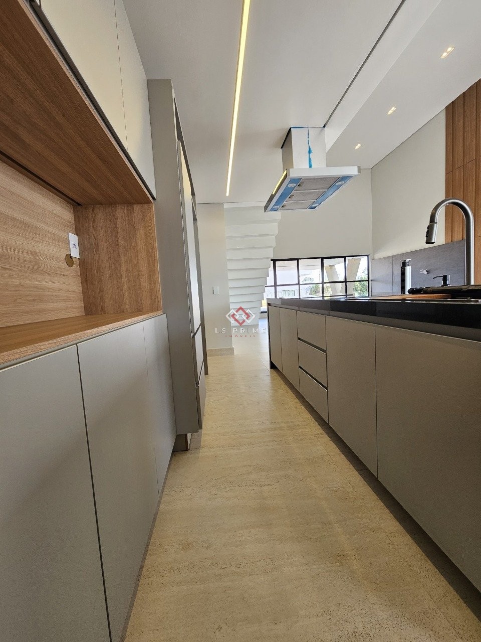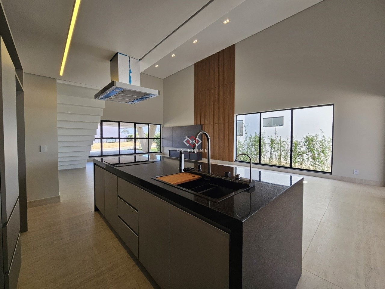 - Cozinha com bancada, fogão de indução, coifa e armários;