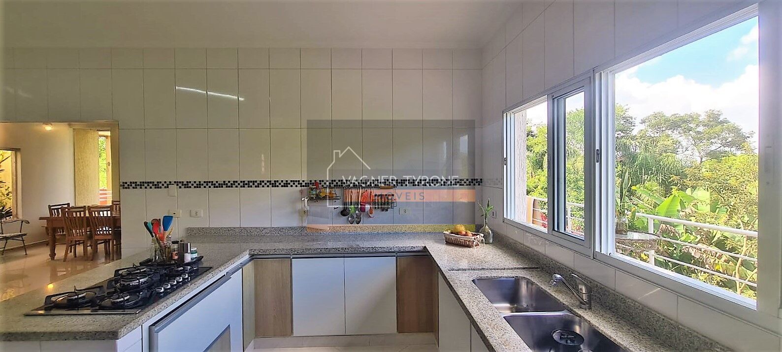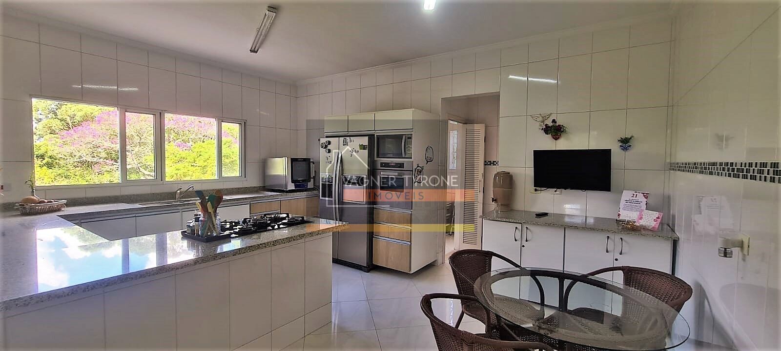 A cozinha muito bem equipada com cook top, ilha e bancadas, e sala de almoço, tem dispensa e acesso à lavanderia completa, bem funcional.