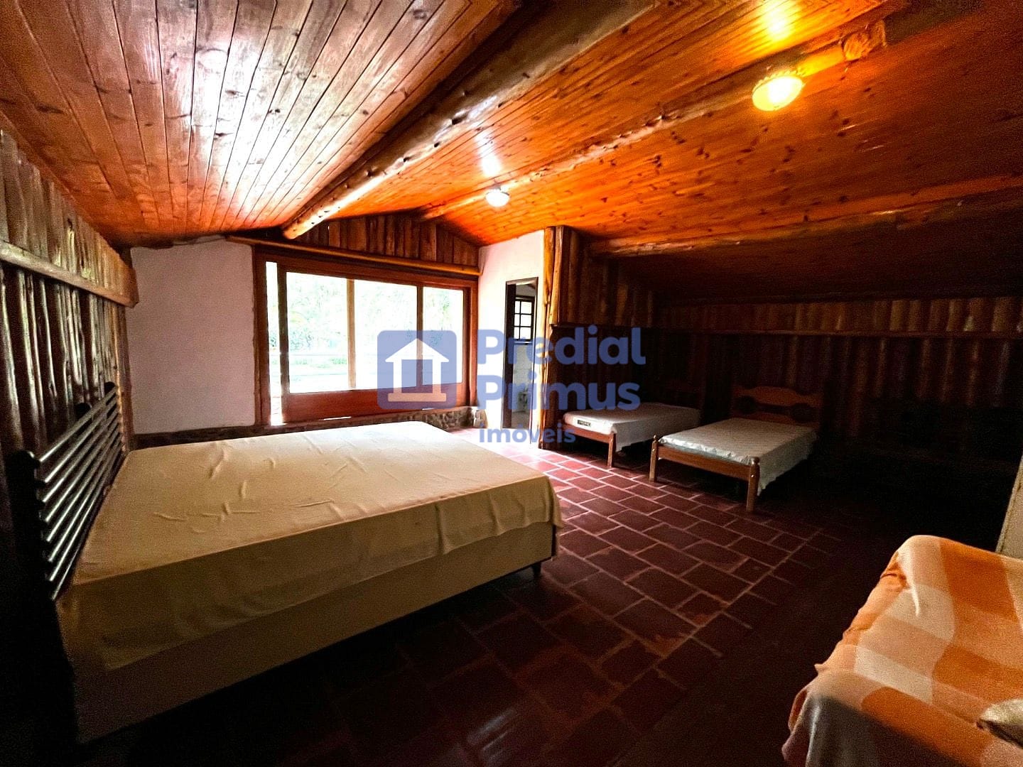 2 suítes no andar superior, com piso em tábua corrida, armários embutidos rústicos e varanda