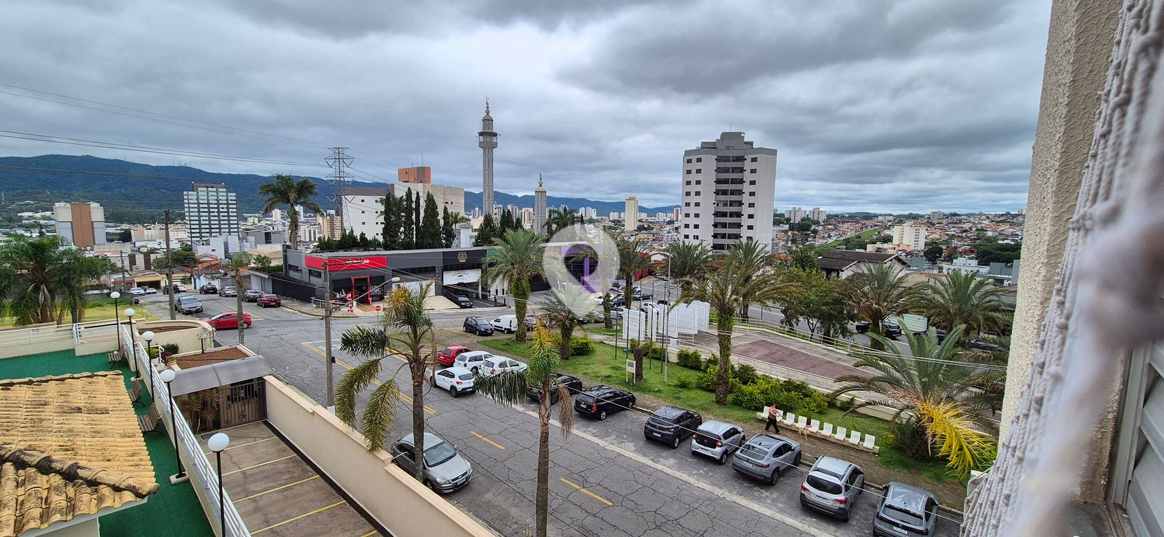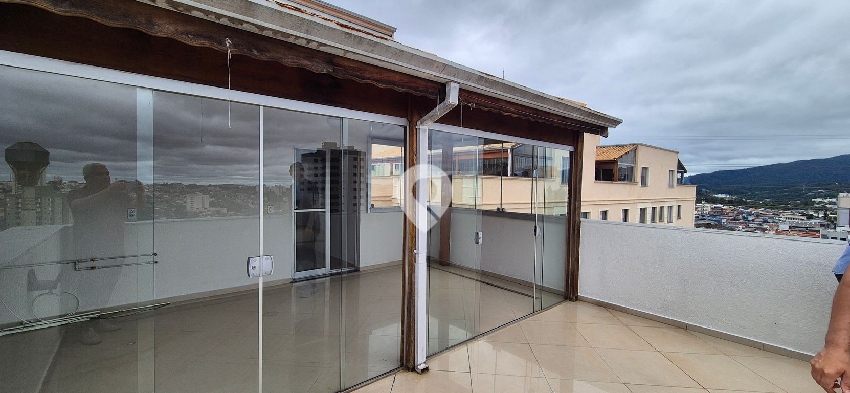 Sacada grande e coberta com churrasqueira e vista para a cidade e serra do Itapeti em frente a praça da Mesquita