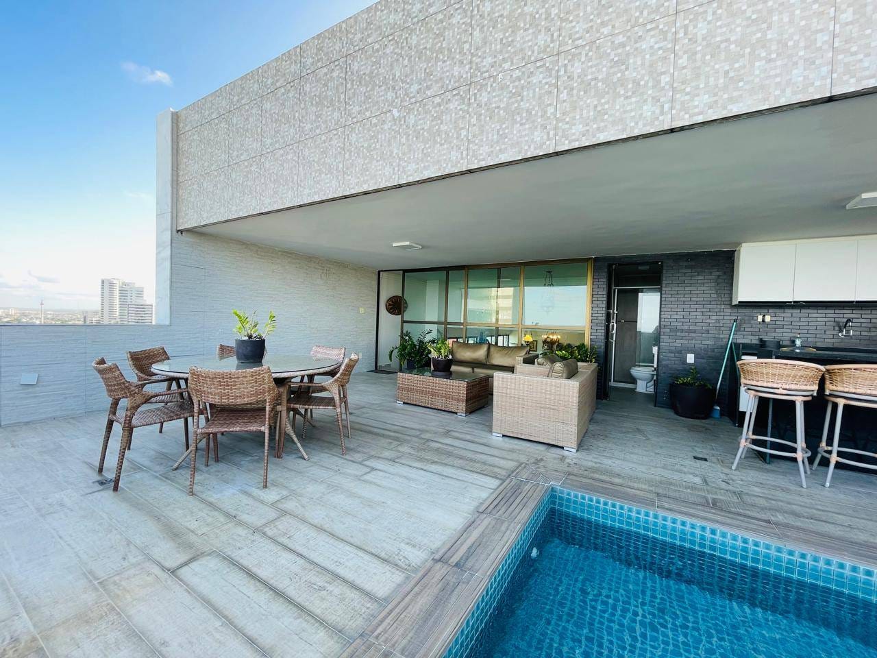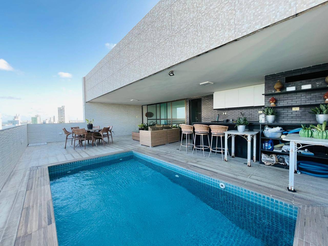 Área externa privativa com piscina e gourmet;