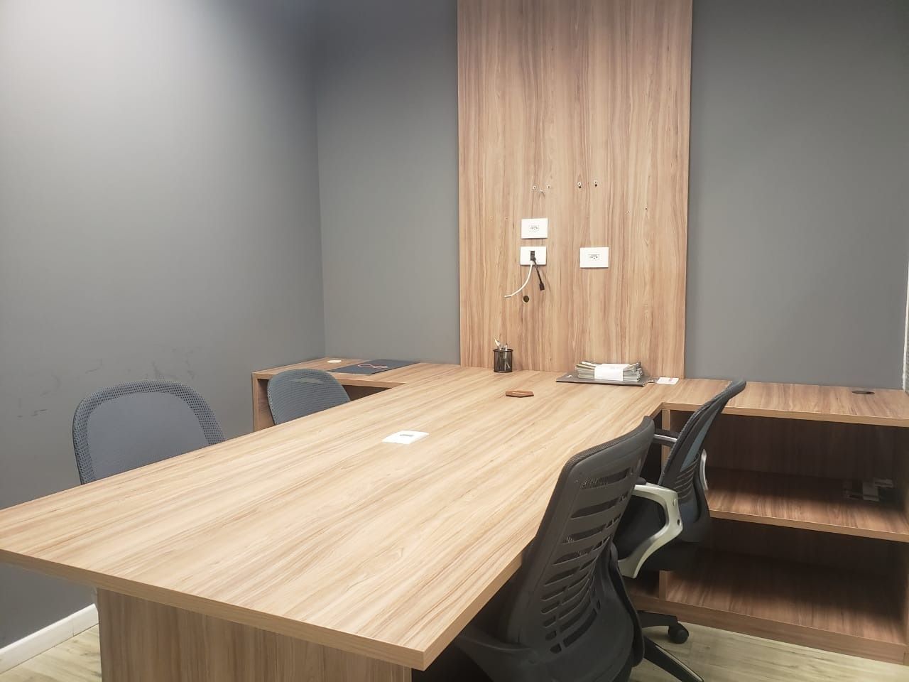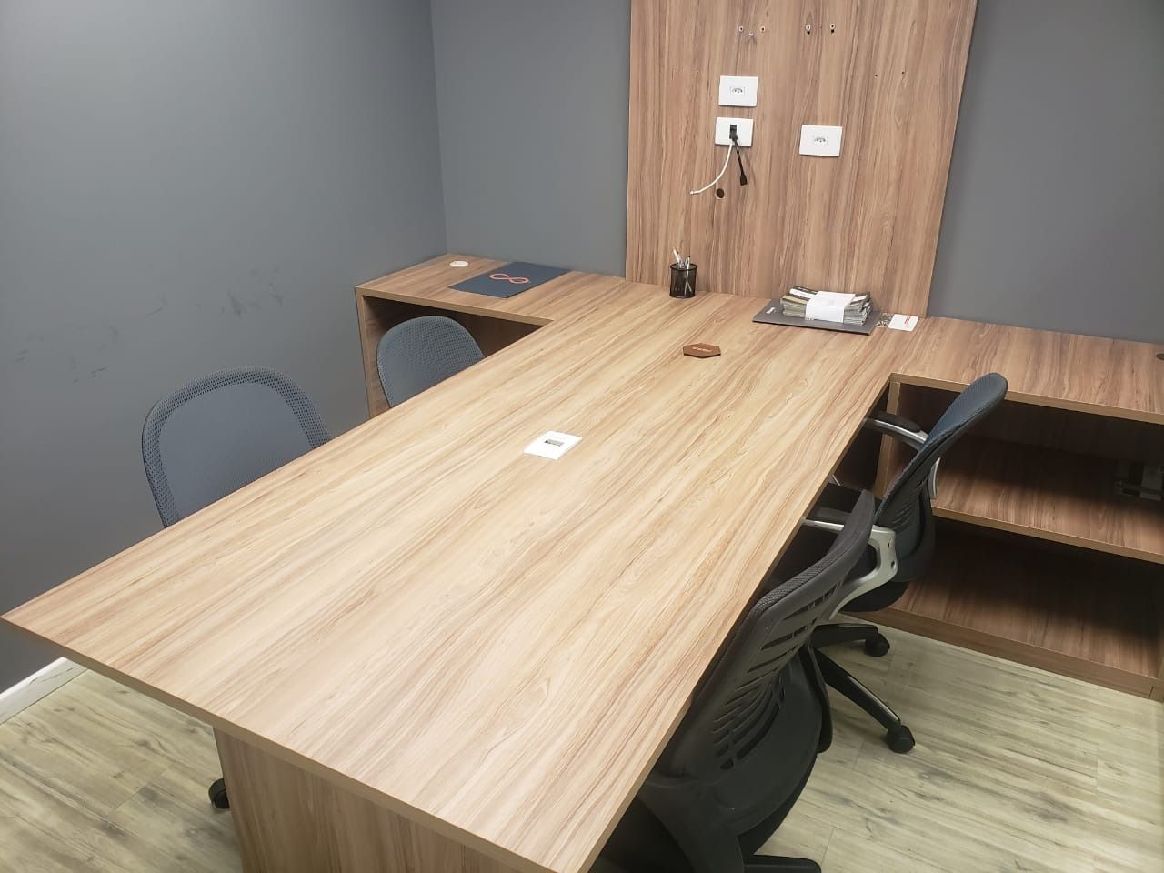 • Sala de reunião com mesa ampla e painel de madeira preparado para TV.