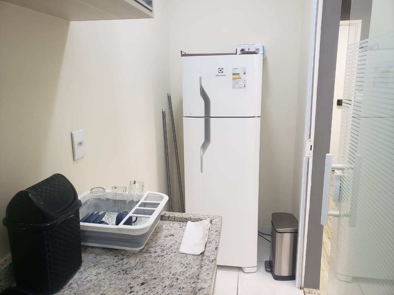 • Copa equipada com geladeira, micro-ondas, filtro de água e armários.