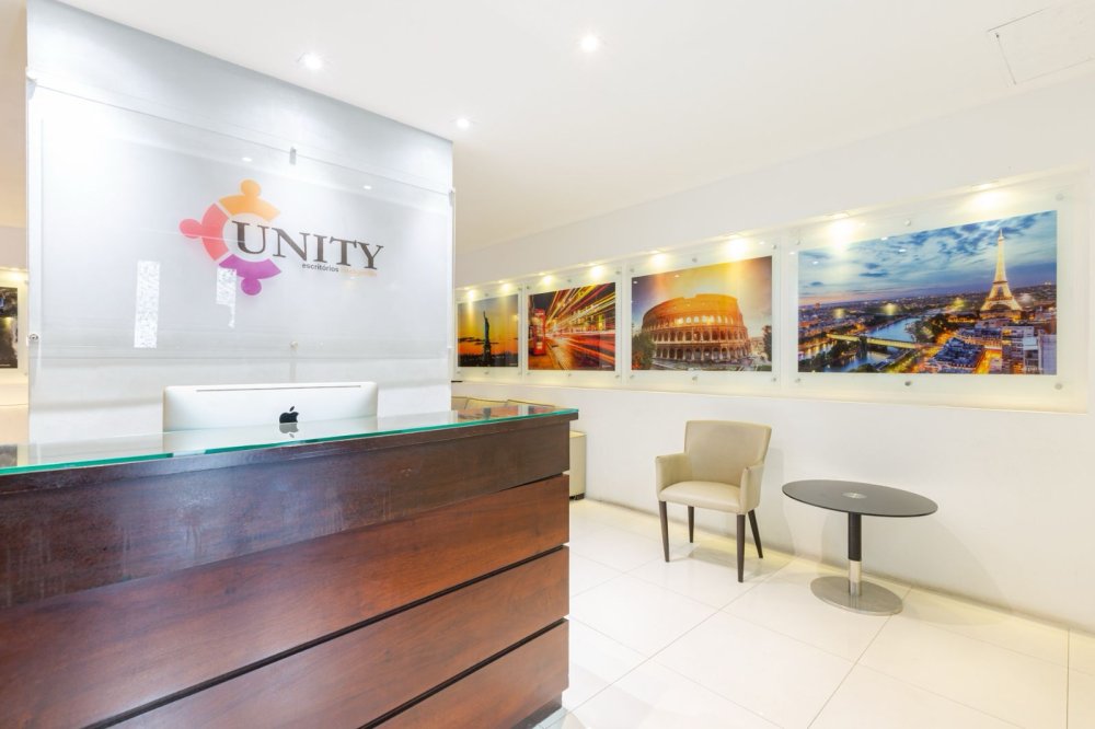 Sala comercial com mesas e cadeiras comerciais para escritório, comporta até 8 pessoas. Com ar condicionado IPTU, condomínio, recepcionista, água, luz, café internet incluso no valor da locação.