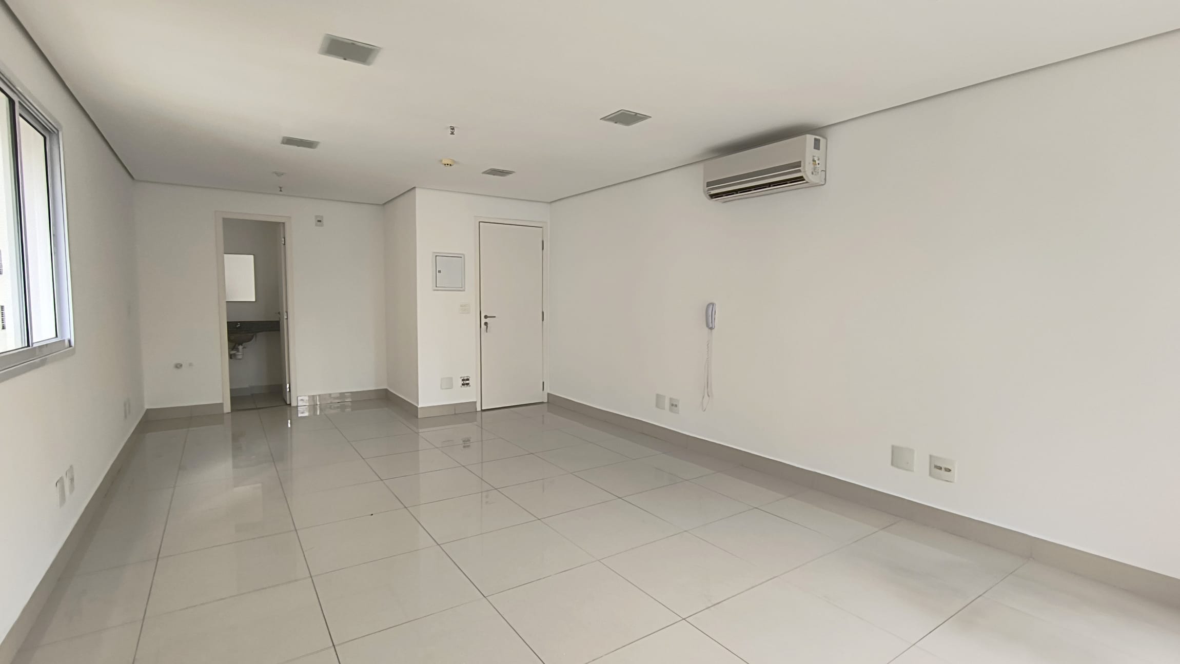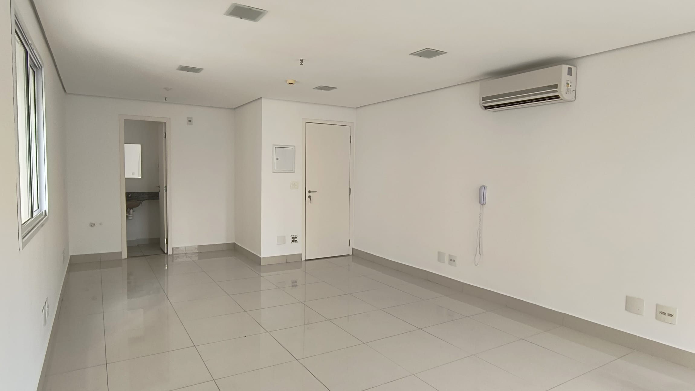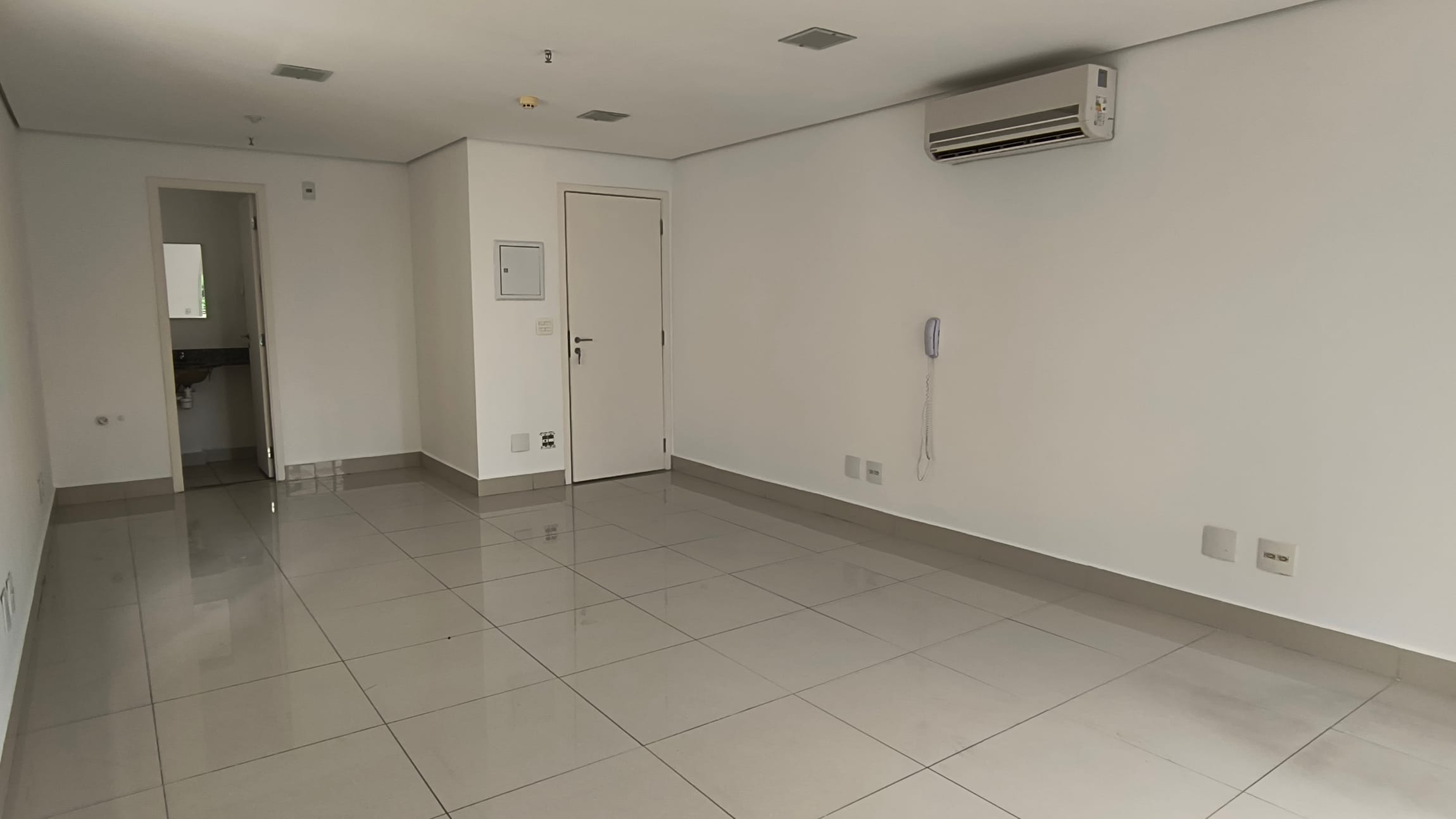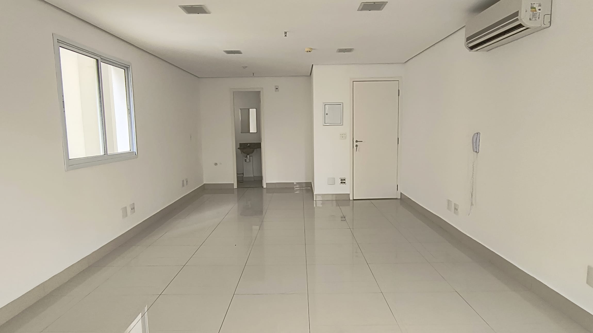A sala possui 38,85m² e está totalmente aberta, um convite `a sua imaginação para um lay out que atenda suas necessidades.Possui um banheiro infraestrutura para copa e varanda técnica. O piso em porcelanato confere um ar de modernidade ao ambiente e é de fácil manutenção, A sala é super iluminada. No teto , forro em gesso com luminárias de embutir detector de fumaça e rede de sprinkles.essa sala possuib também 1 vaga de garagem.