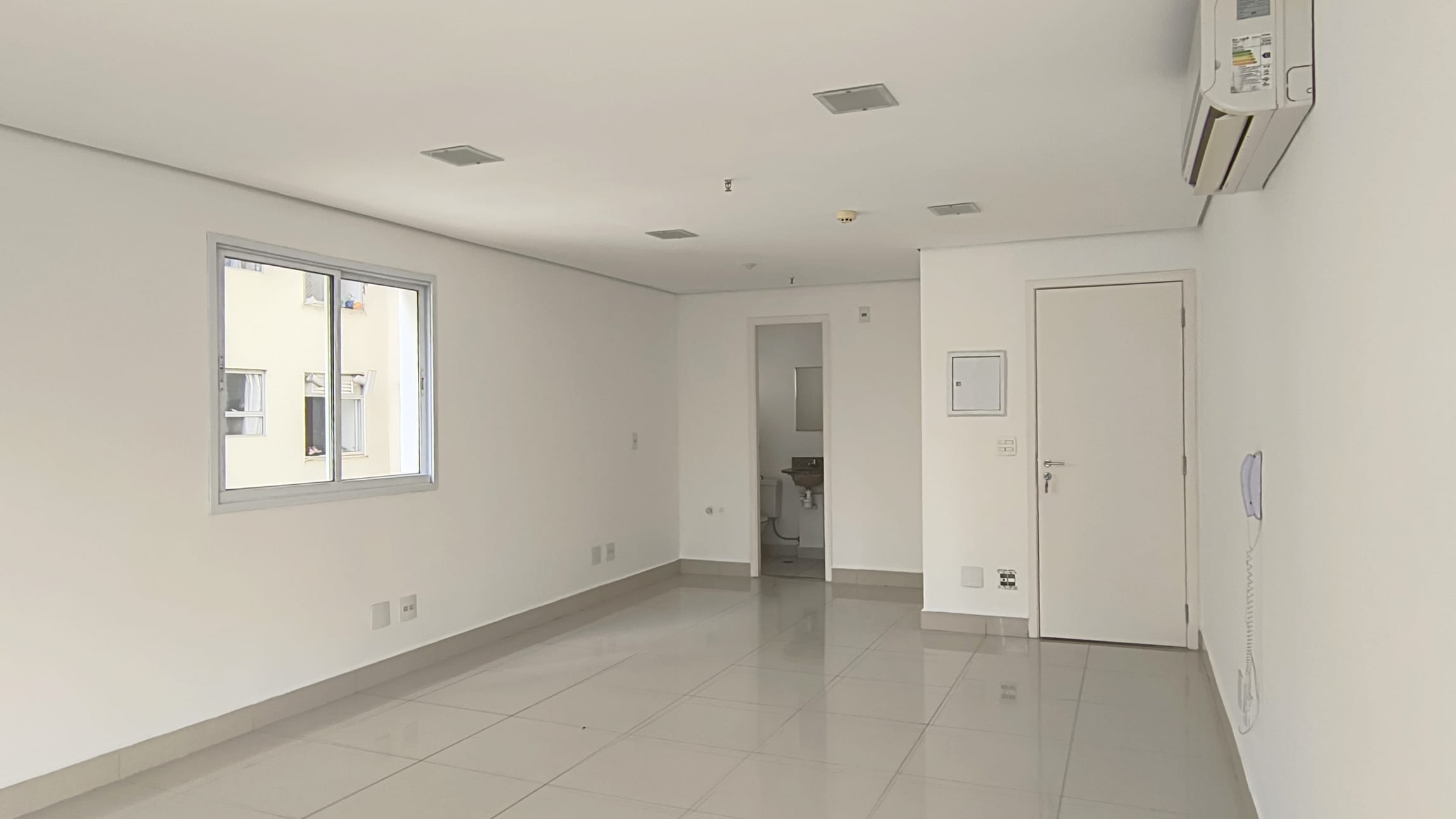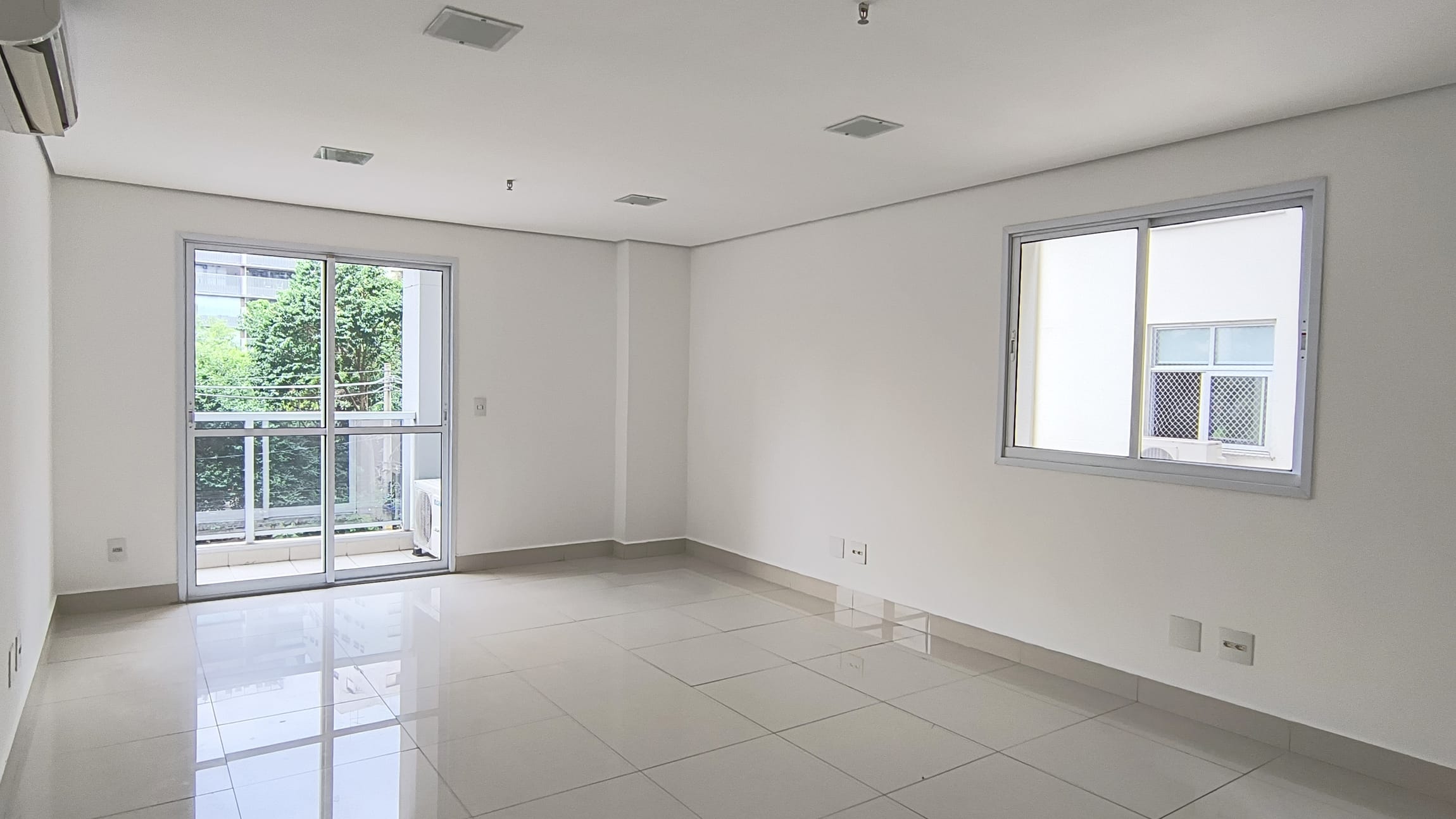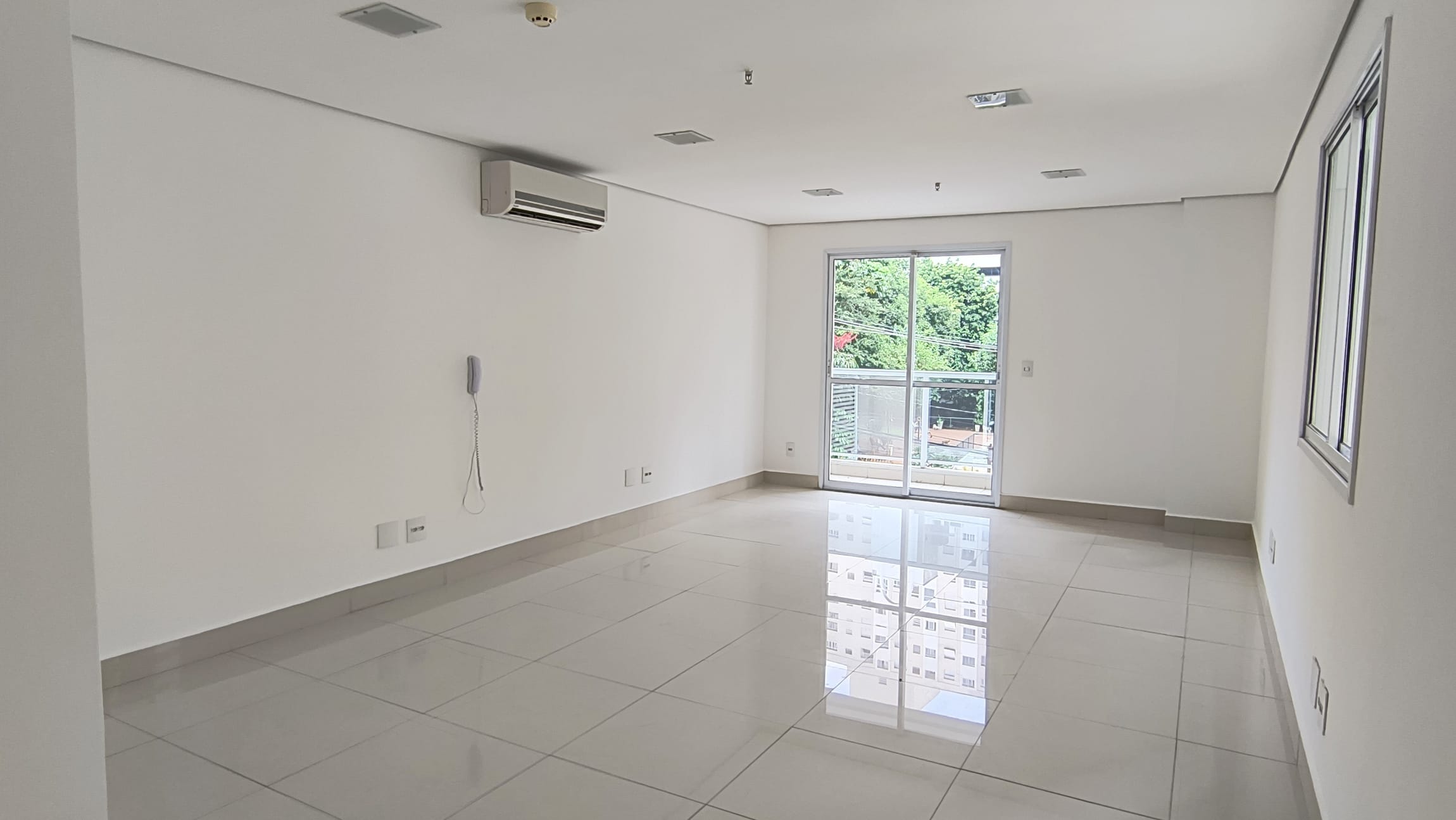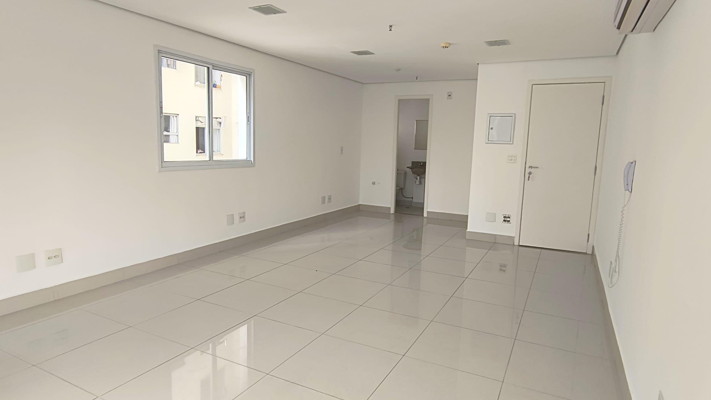 A sala possui 38,85m² e está totalmente aberta, um convite `a sua imaginação para um lay out que atenda suas necessidades.Possui um banheiro infraestrutura para copa e varanda técnica. O piso em porcelanato confere um ar de modernidade ao ambiente e é de fácil manutenção, A sala é super iluminada. No teto , forro em gesso com luminárias de embutir detector de fumaça e rede de sprinkles.essa sala possuib também 1 vaga de garagem.