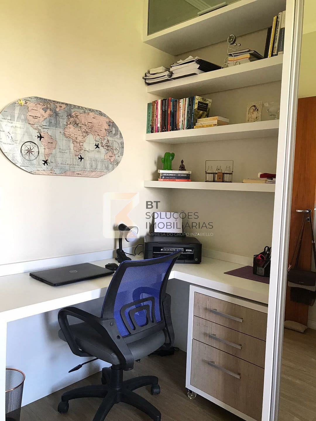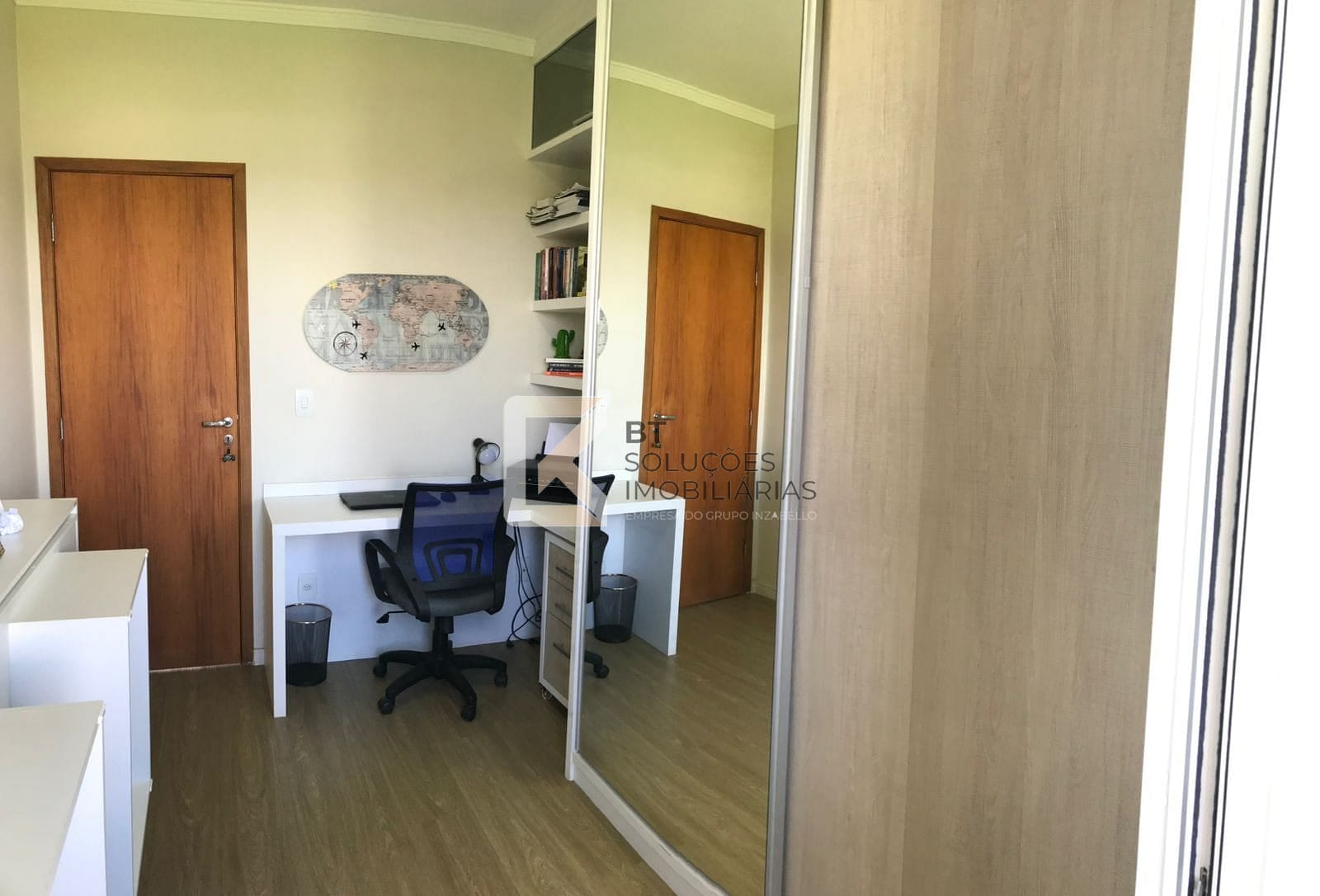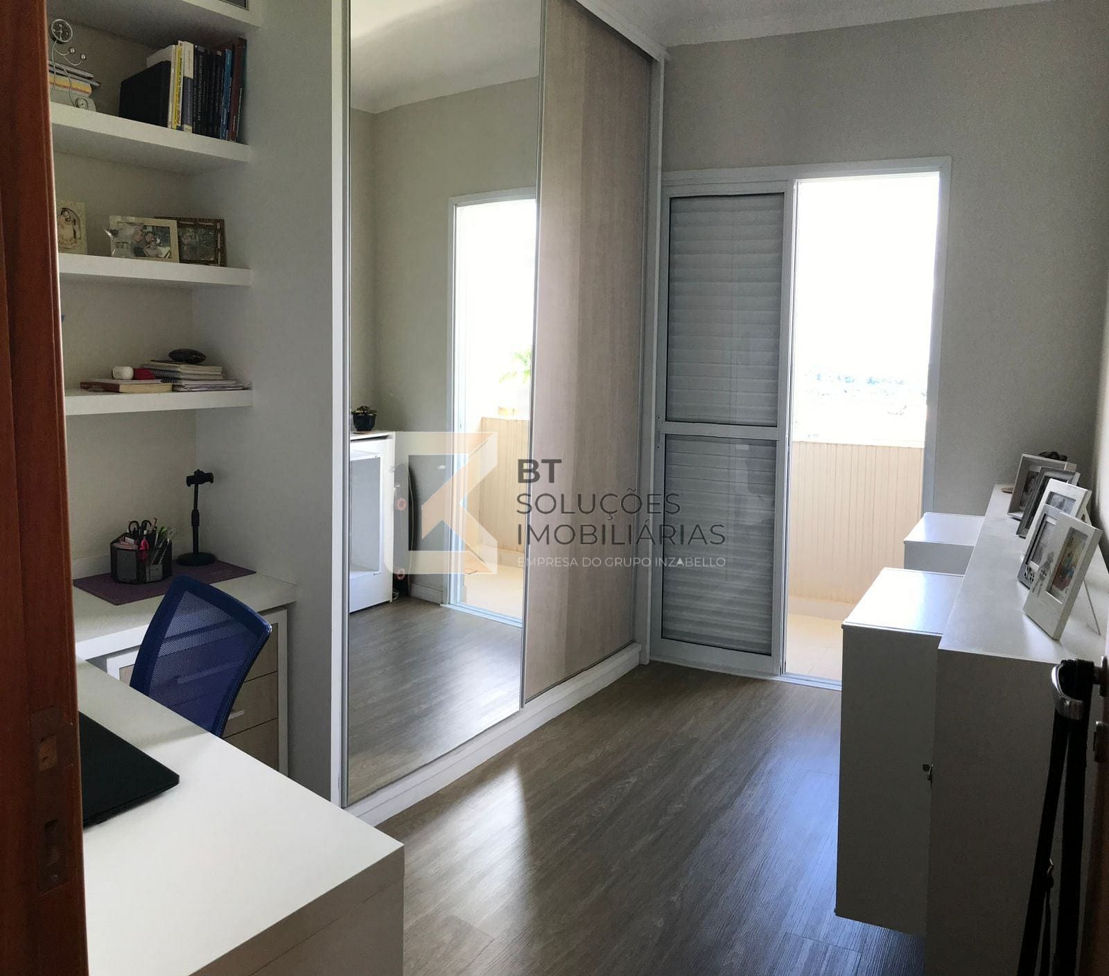 Terceiro dormitório versátil (ideal para escritório), com varanda, armário planejado, prateleiras e mesa para trabalho/estudos