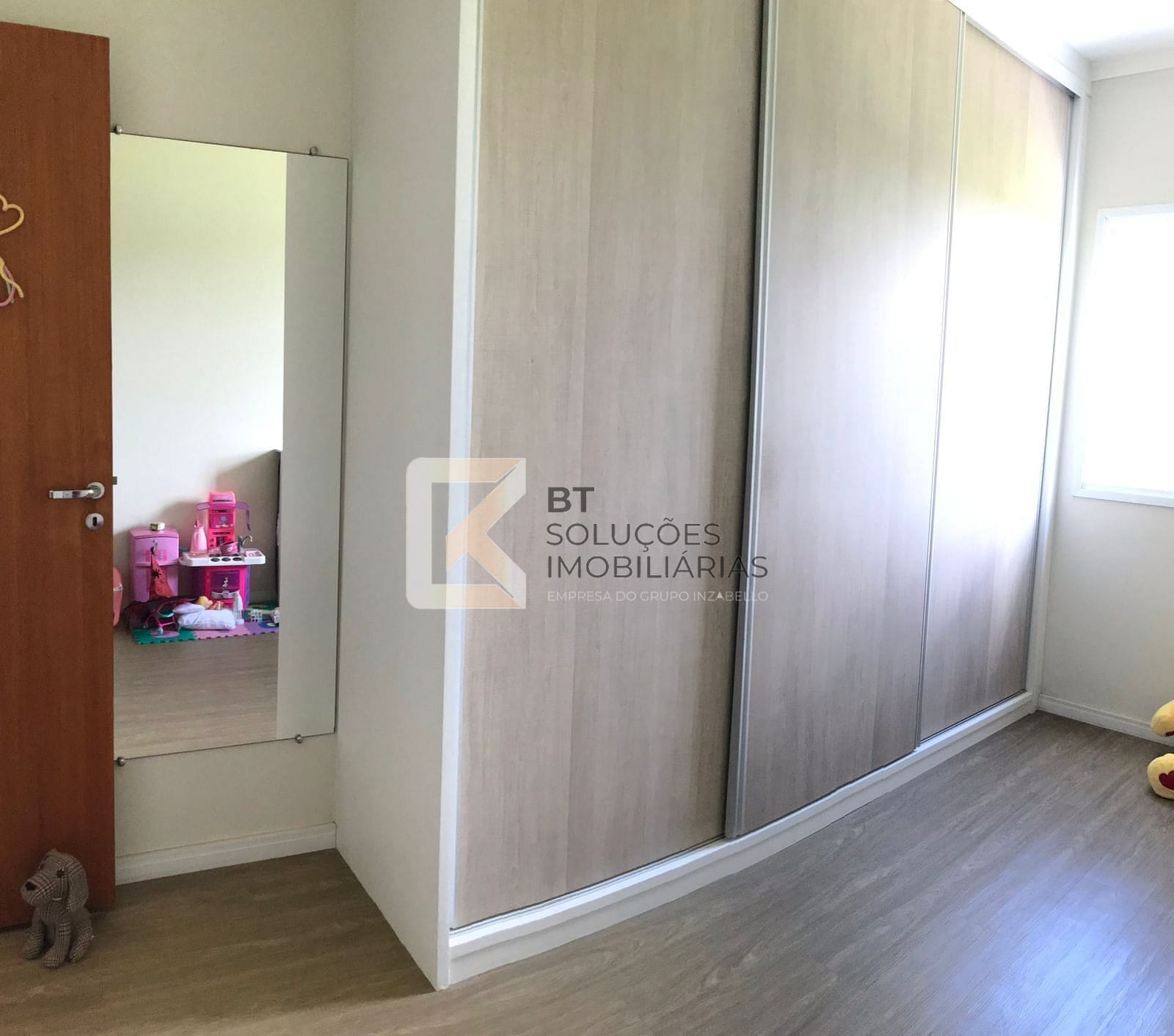 Segundo dormitório com amplo armário planejado e ventilador de teto