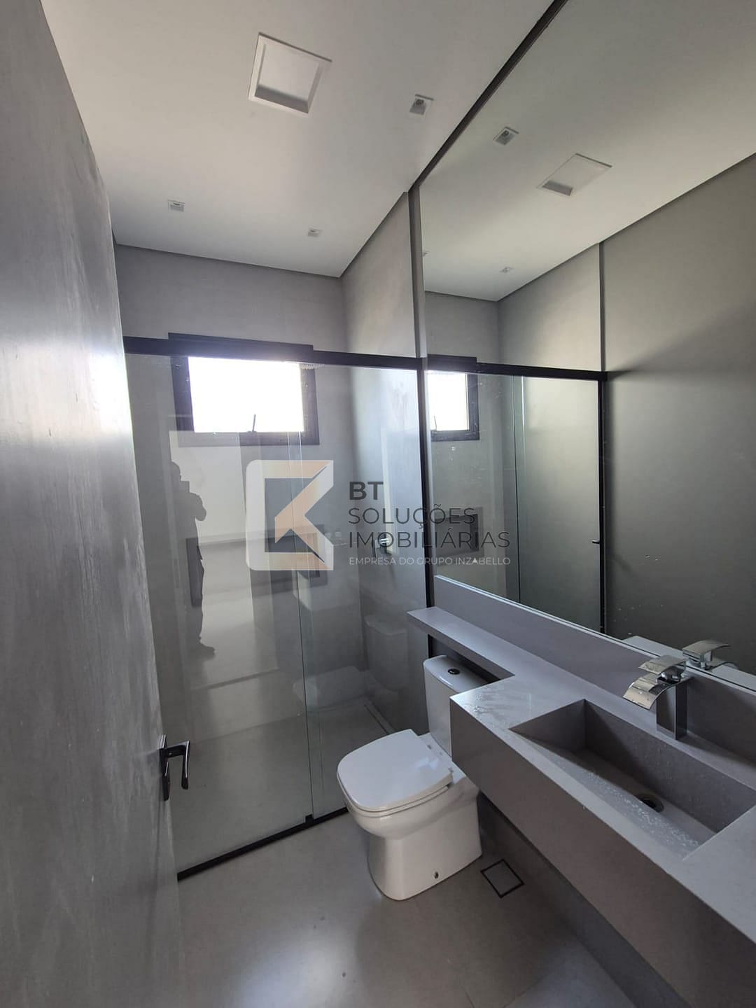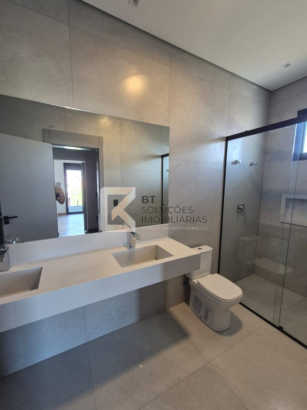 Suíte master com closet, banheiro com duas duchas e duas cubas esculpidas em Branco Prime