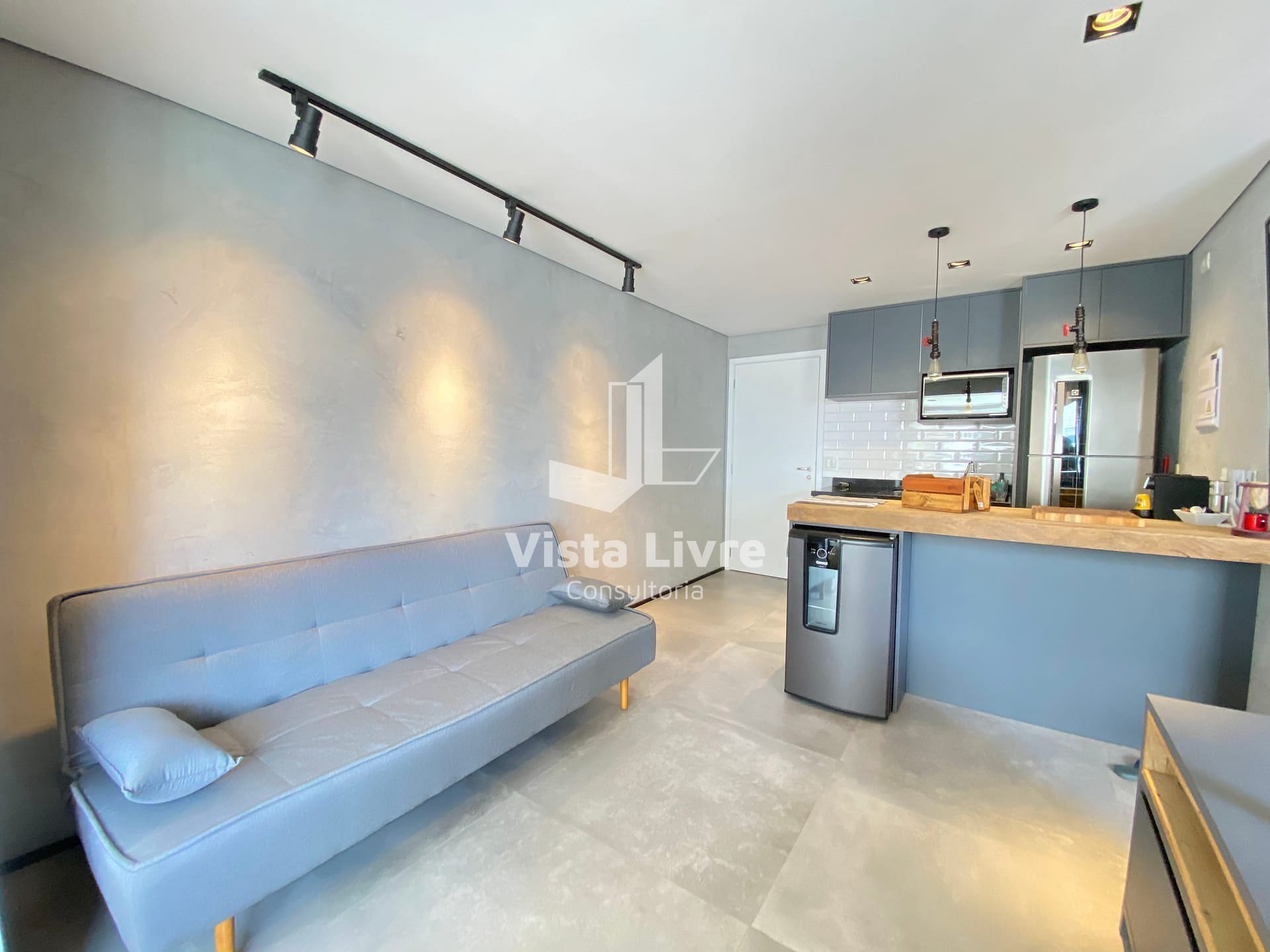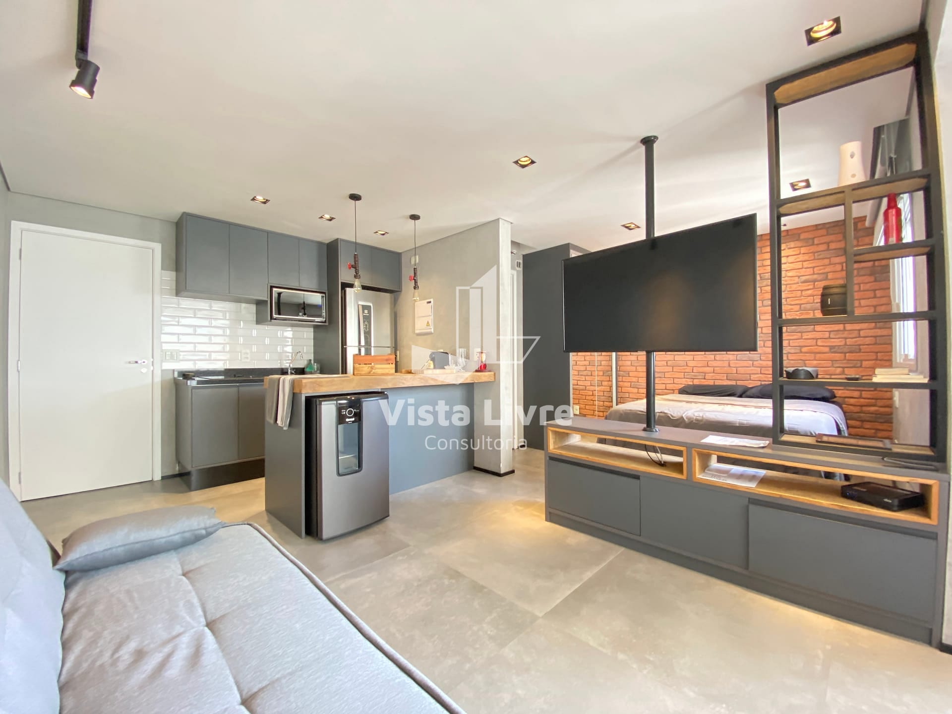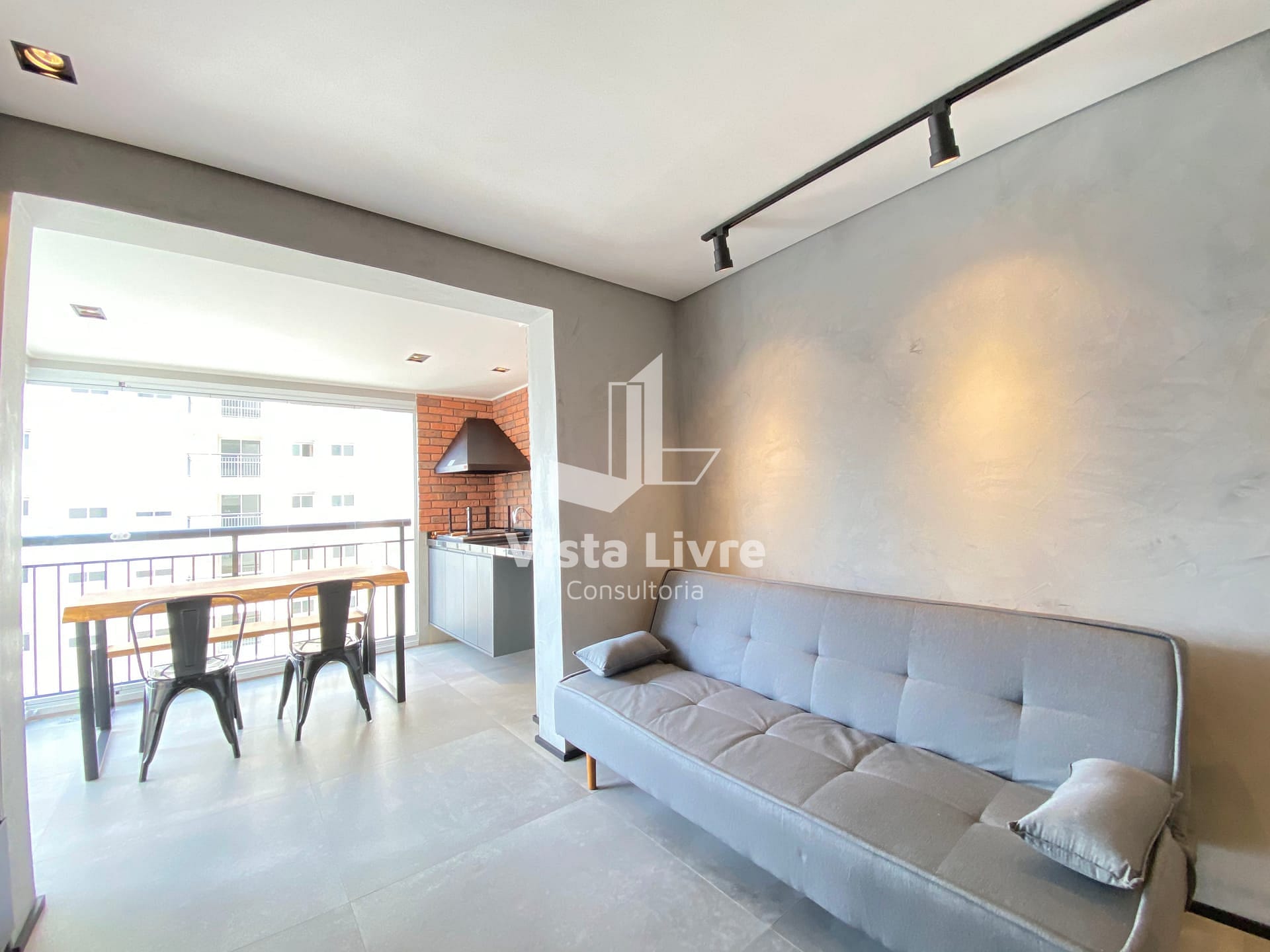 Studio moderno com churrasqueira na varanda e decoração industrial em ótima localização.