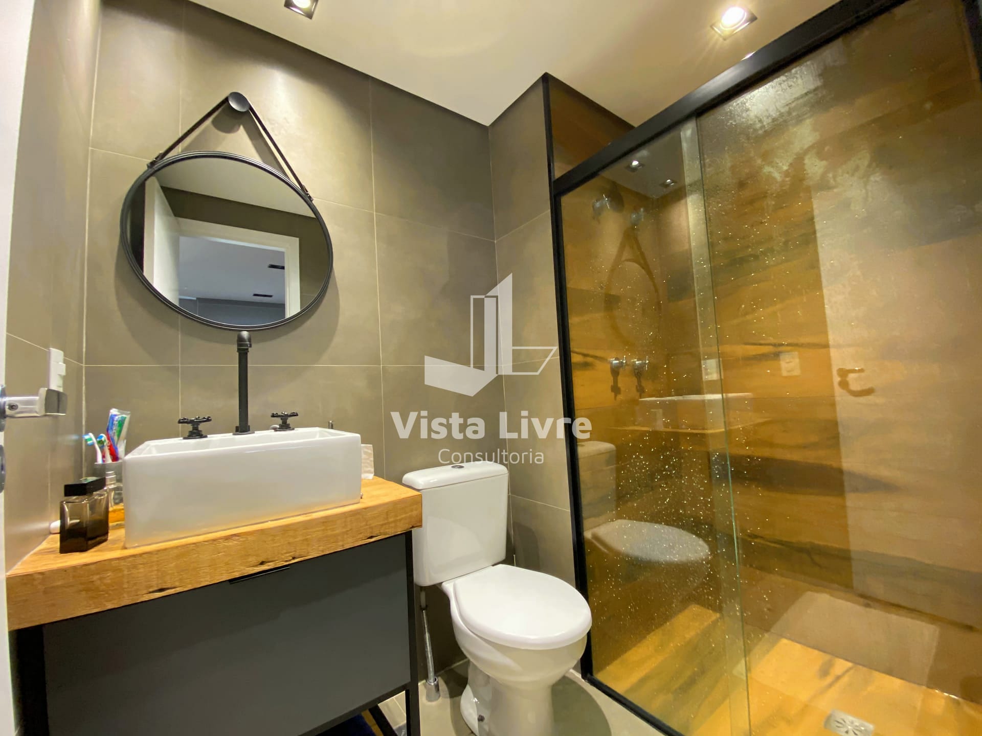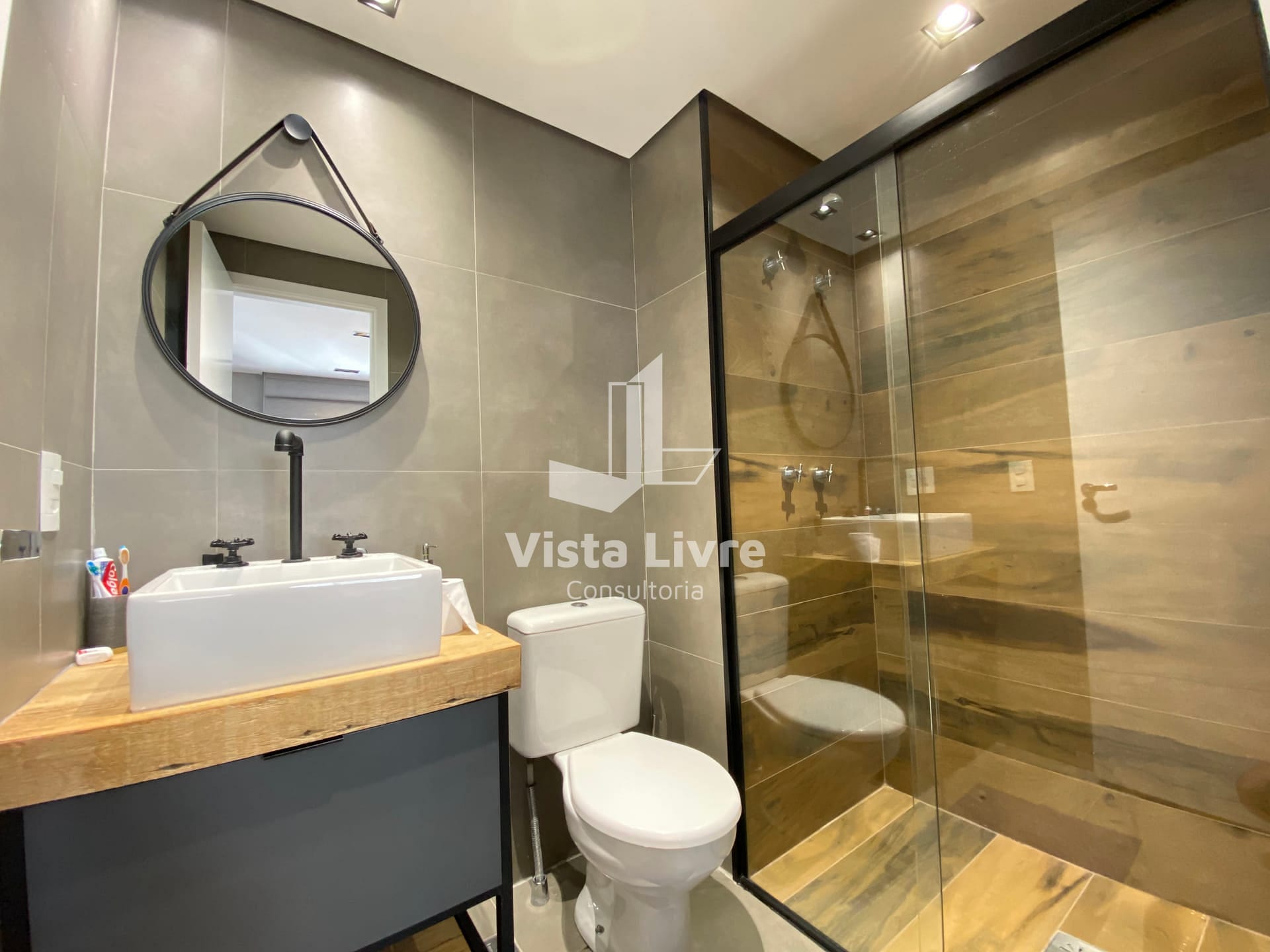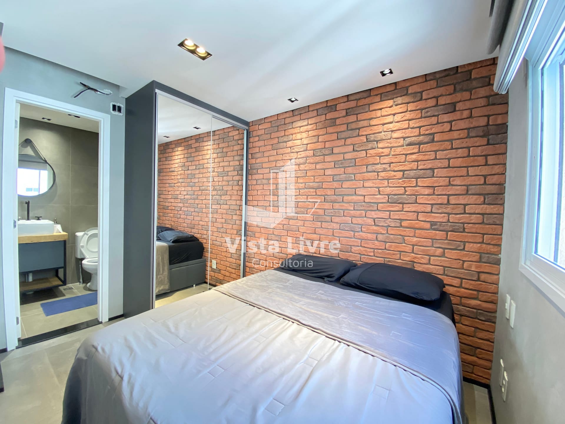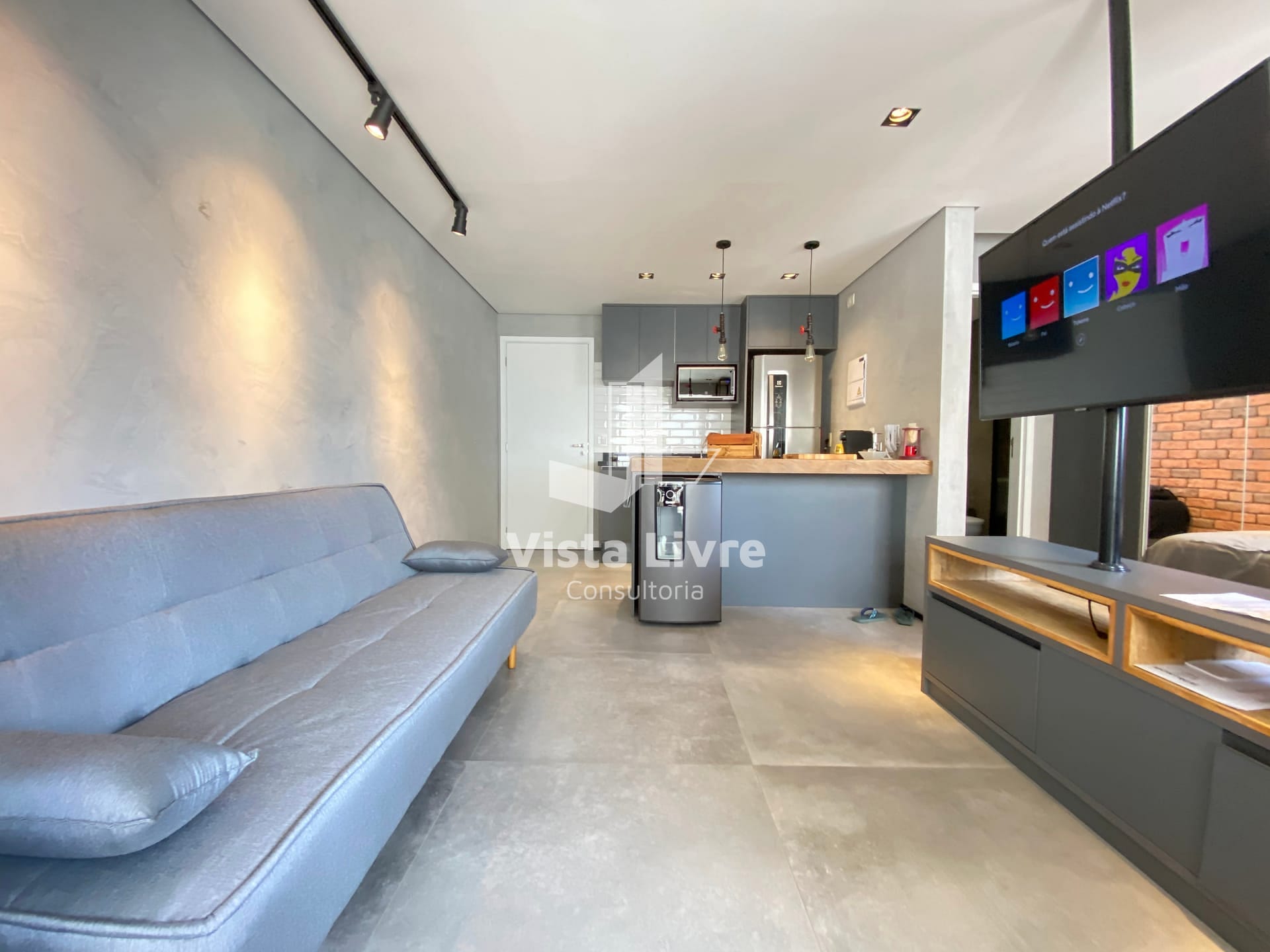 Studio moderno com churrasqueira na varanda e decoração industrial em ótima localização.